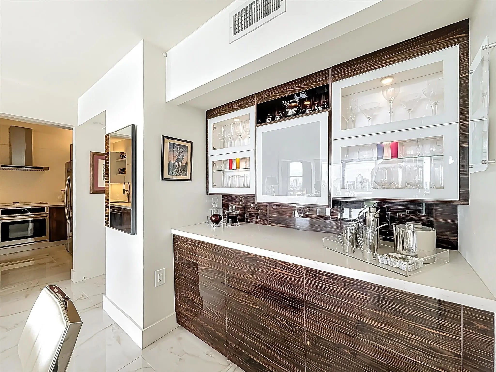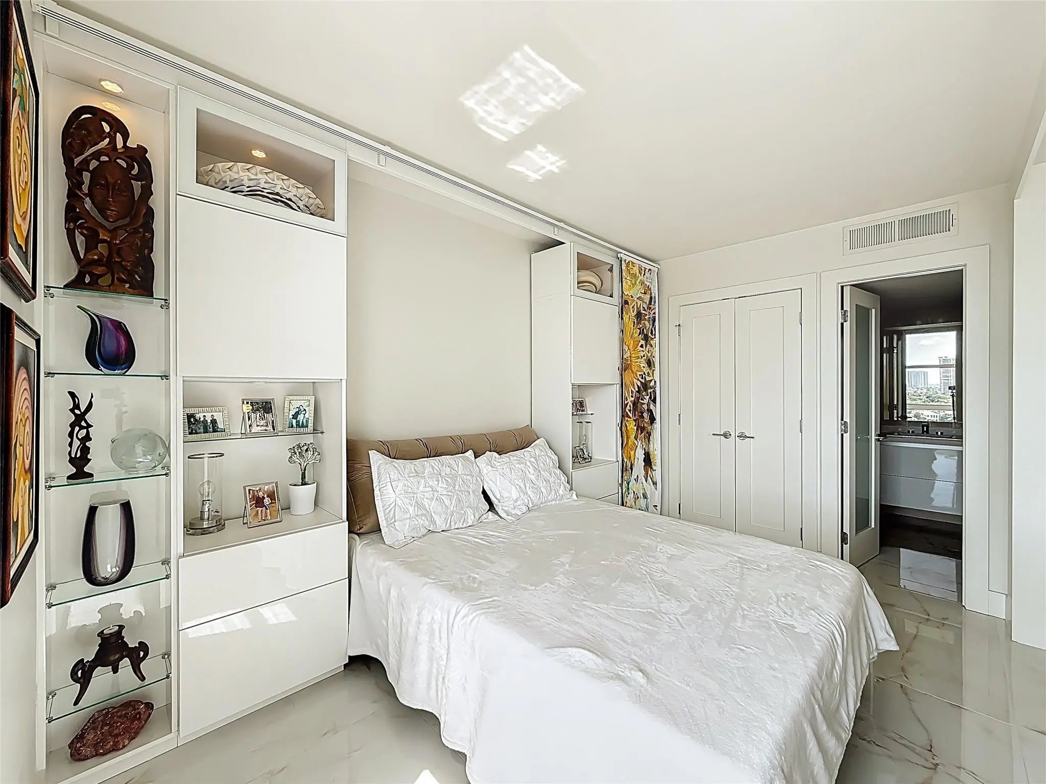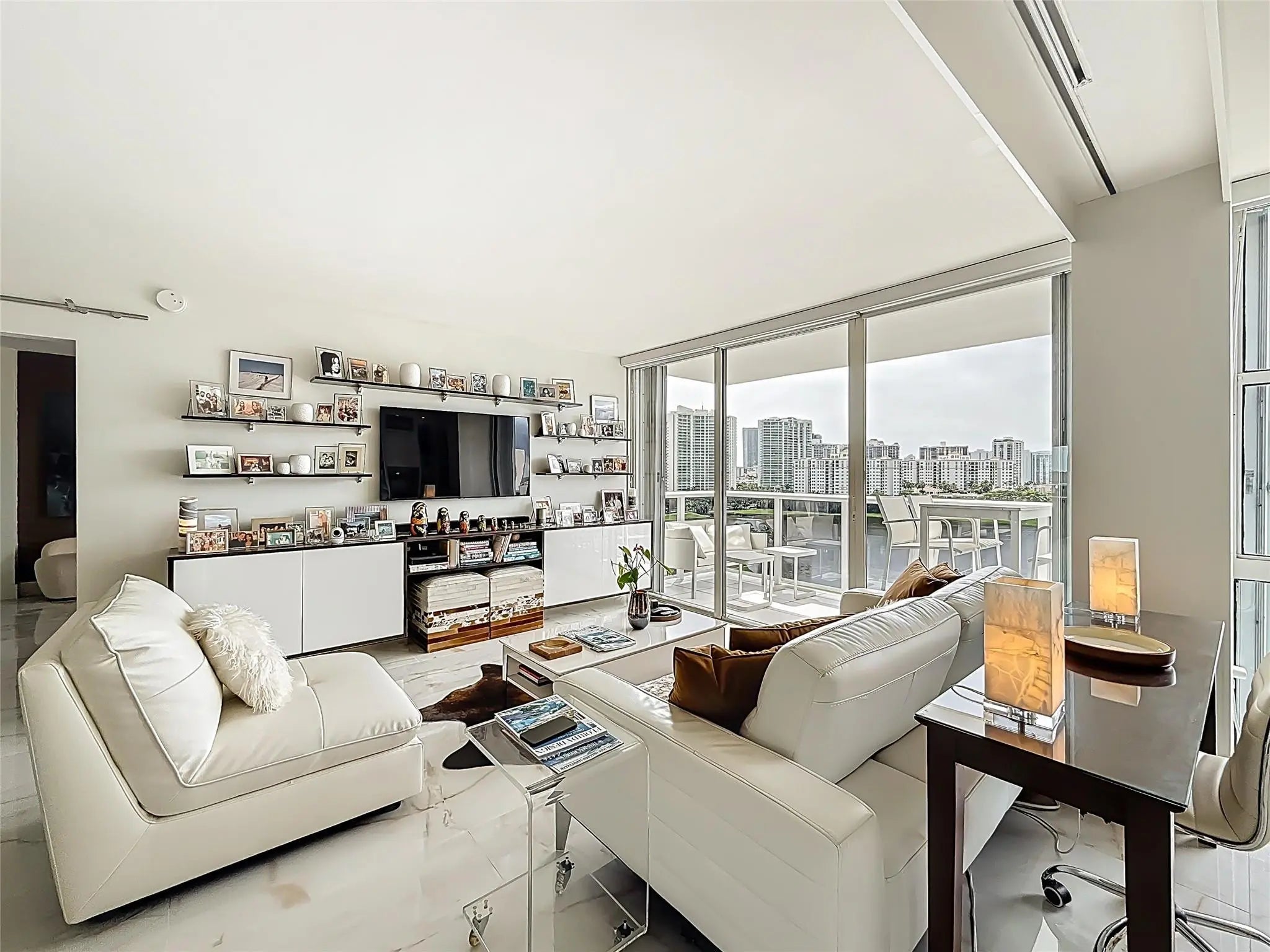 Architect’s residence with turnkey fully furnished option. 180-degree views of sunrises over the ocean, majestic sunsets, shimmering moonrises & serene lake reflections. Innovative living area seamlessly integrates the LR, DR & 2nd BR for open concept, but can be portioned into an office/bedroom w/ a panel pocket wall system. Artfully concealed Murphy bed creates a BR w/ closet & en-suite bathroom. Interior features: 3D accent walls, exquisite mother of pearl tile, custom kitchen, bar w/ built-in cabinets, entertainment center w/ floating shelves, motorized blackout shades, WIC, lots of storage, hurricane shutters & deeded parking (2nd available). Location is on the Soffer nature trail & Turnberry lakes…Walk to Aventura mall, restaurants, houses of worship, dog park, horse track marina, train or Golden beach. HOA: WIFI/cable, 24-hour concierge, pool, jacuzzi, gym, club room, saunas, library, billiard room & covered BBQ area with outdoor dining area on the canal.