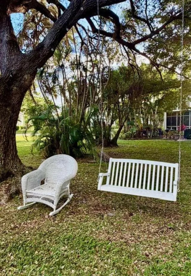 RARELY AVAILABLE CORNER UNIT WITH PRIVATE PATIO FOR YEARLY RENTAL - Rarely available corner 2-bedroom 1.5-bath residence with private Patio and lush tropIcal garden including a banana and tropical flowers. , locatedin the highly desirable Durham section of Century Village East. Ideally located directly across from the pool and just steps to the clubhouse, this is one of the most attractive and well-positioned units in the community. This bright corner unit features additional corner windows for abundant natural light, tile flooring throughout, and new impact storm windows and doors, new A/C. The kitchen and bathrooms have been remodeled, offering tasteful updates while maintaining warmth and character. A true standout feature is the private rear patio — an uncommon find in the Village. This serene outdoor space faces west, providing beautiful sunset views and a quiet, peaceful setting. Surrounded by lush tropical landscaping, the patio includes a charming swing, strong outdoor lighting, and thoughtfully designed seating areas, creating the perfect retreat for morning coffee or relaxing evenings. Patio and garden maintenance are included in the rent. The primary bedroom features a king-size bed, and the flexible second bedroom has a convertable couch/bed that can function as a guest room, office, or additional living space. Offered fully furnished (turnkey), with options for partial furnishings or unfurnished for long-term tenants. Non-smoking unit. Residents of Century Village East enjoy an exceptional amenity package including cable and HBO, nightly movies at the clubhouse, live entertainment and shows, heated indoor and outdoor pools, and a state-of-the-art fitness center. The expansive clubhouse features an on-site restaurant, resort-style pool, libraries, and dedicated spaces for arts and crafts including fused glass, stained glass, pottery, and woodworking. Recreational options include pickleball, tennis, pétanque, billiards, ping-pong, and a wide variety of clubs, social activities, and hobby groups. This vibrant 55+ community offers an active lifestyle with something for virtually every interest. Association approval required (approximately 30 days). Property is now vacant and ready for occupancy.