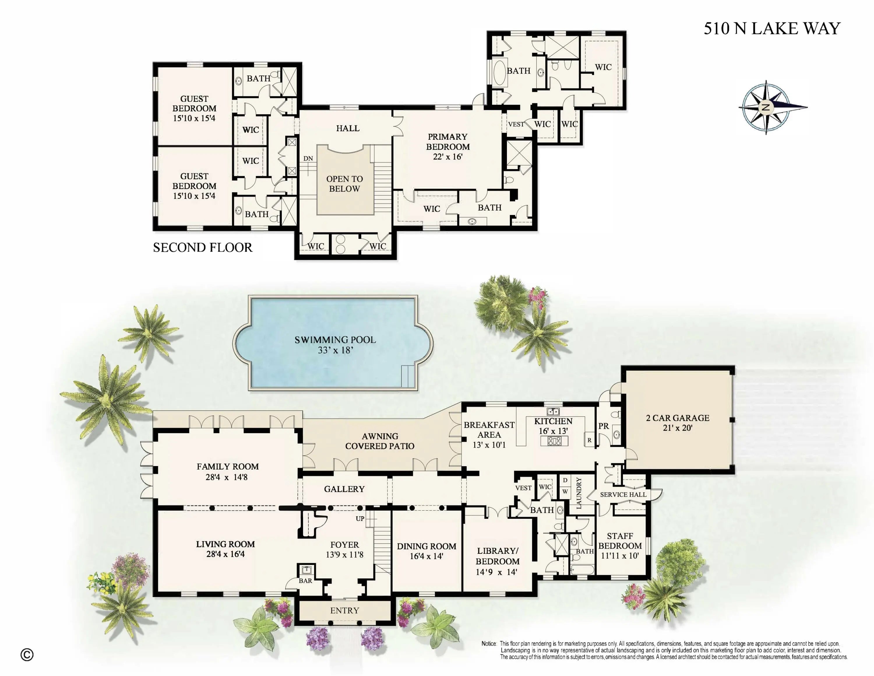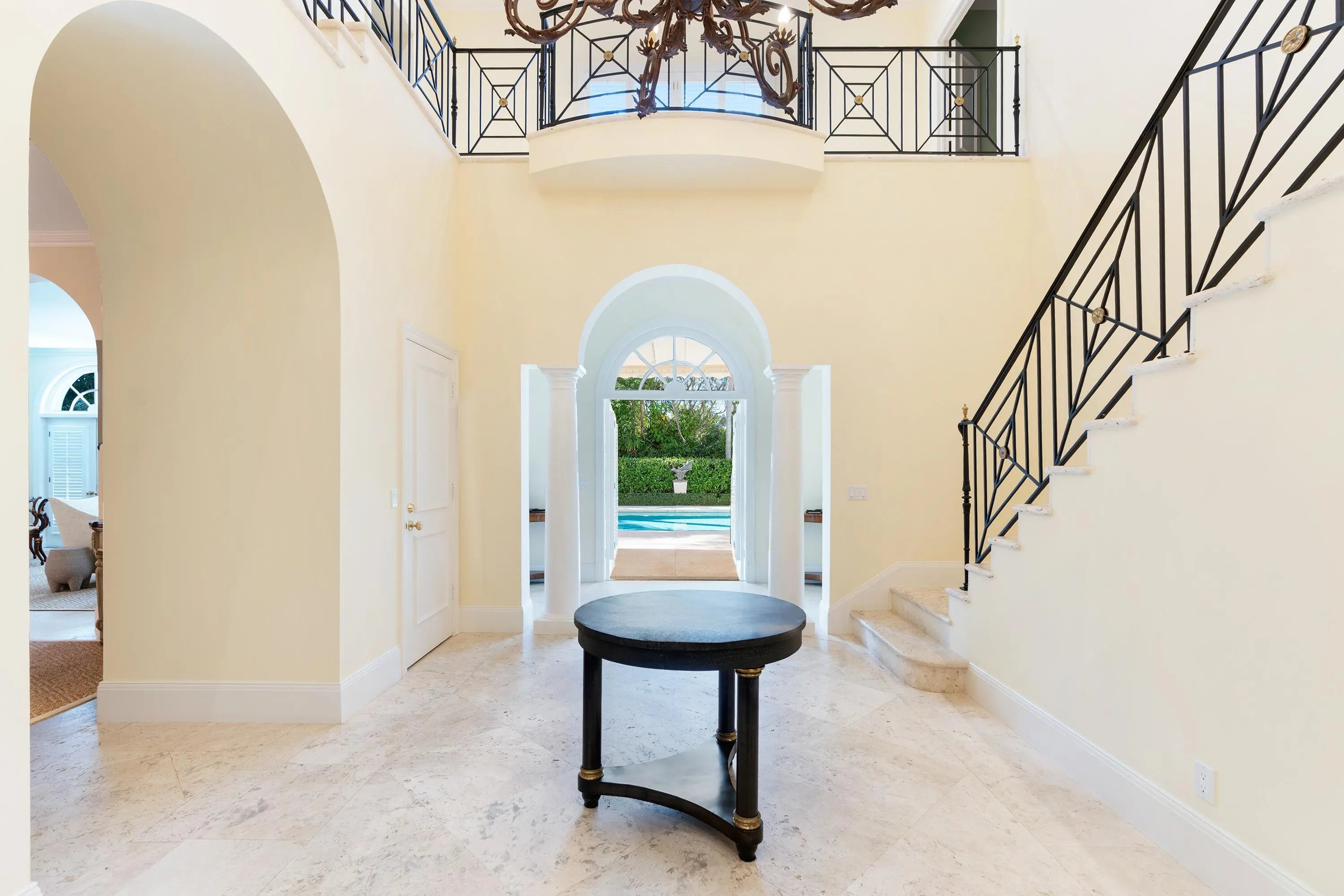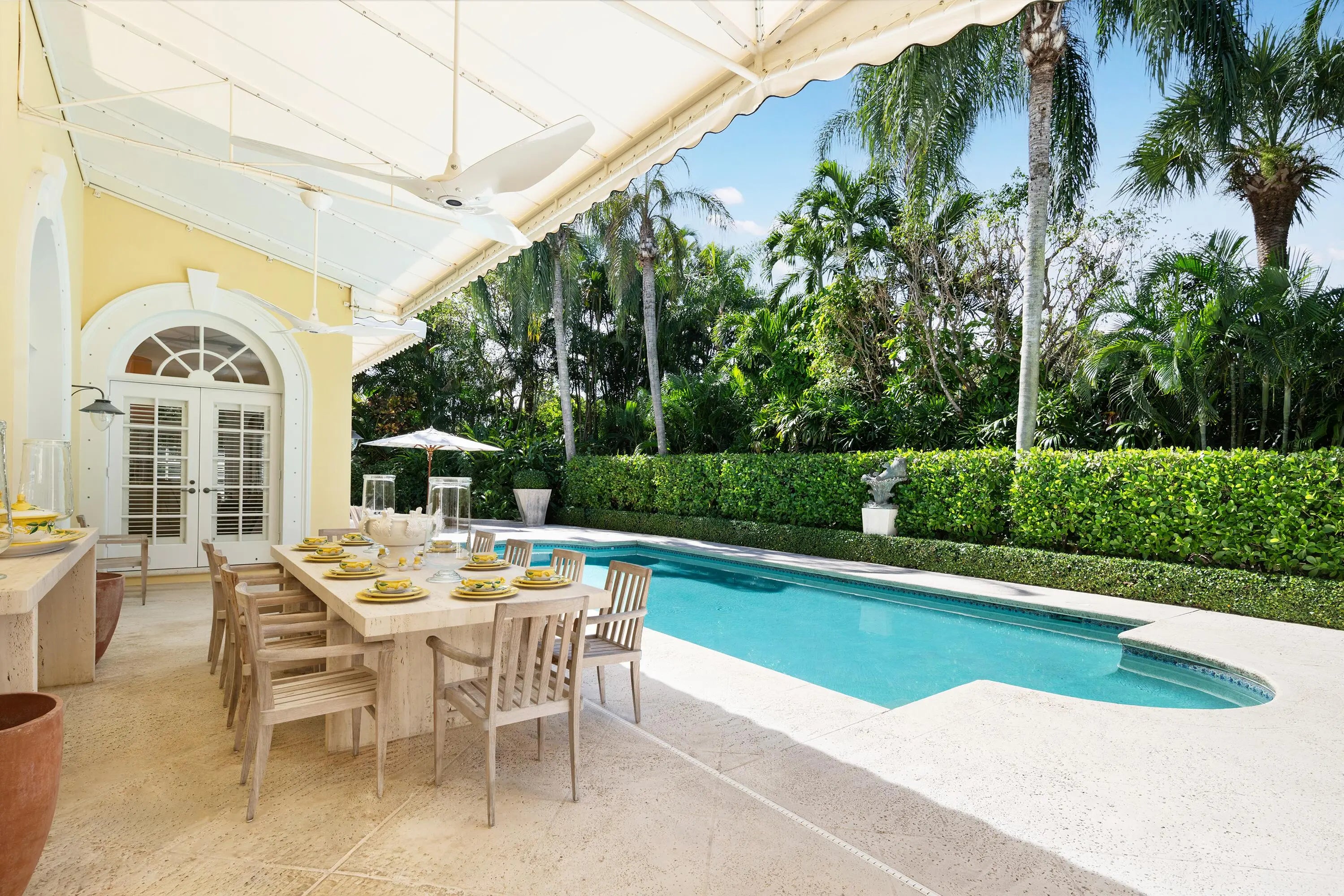 This British Colonial residence offers 6,922± total square feet with five bedrooms and six and a half bathrooms. Set on a 100' x 172' lot at the corner of Tangier Avenue and North Lake Way, the property features a large pool, covered loggia, and beautifully maintained grounds. The spacious foyer opens to the formal living room and a central gallery hall that connects the main living areas. The family room, located on the south side, opens through French doors to the covered loggia and pool. On the north side, the gallery leads to the formal dining room, library, and kitchen with adjoining dining area—an ideal layout for both everyday living and entertaining. Two guest bedrooms are located on the first floor, each with en suite baths and walk-in closets—one currently serving as a library. Additional first-floor features include a powder room, laundry room, and a two-car garage with separate service drive. Upstairs, the primary suite offers exceptional space and privacy with four walk-in closets, separate his-and-her bathrooms, and ample storage. Two additional guest bedrooms on this level each include en suite baths and walk-in closets. Ideally situated on Palm Beach's North End, the residence is just moments from the Lake Trail, beaches, restaurants, and world-class shopping.