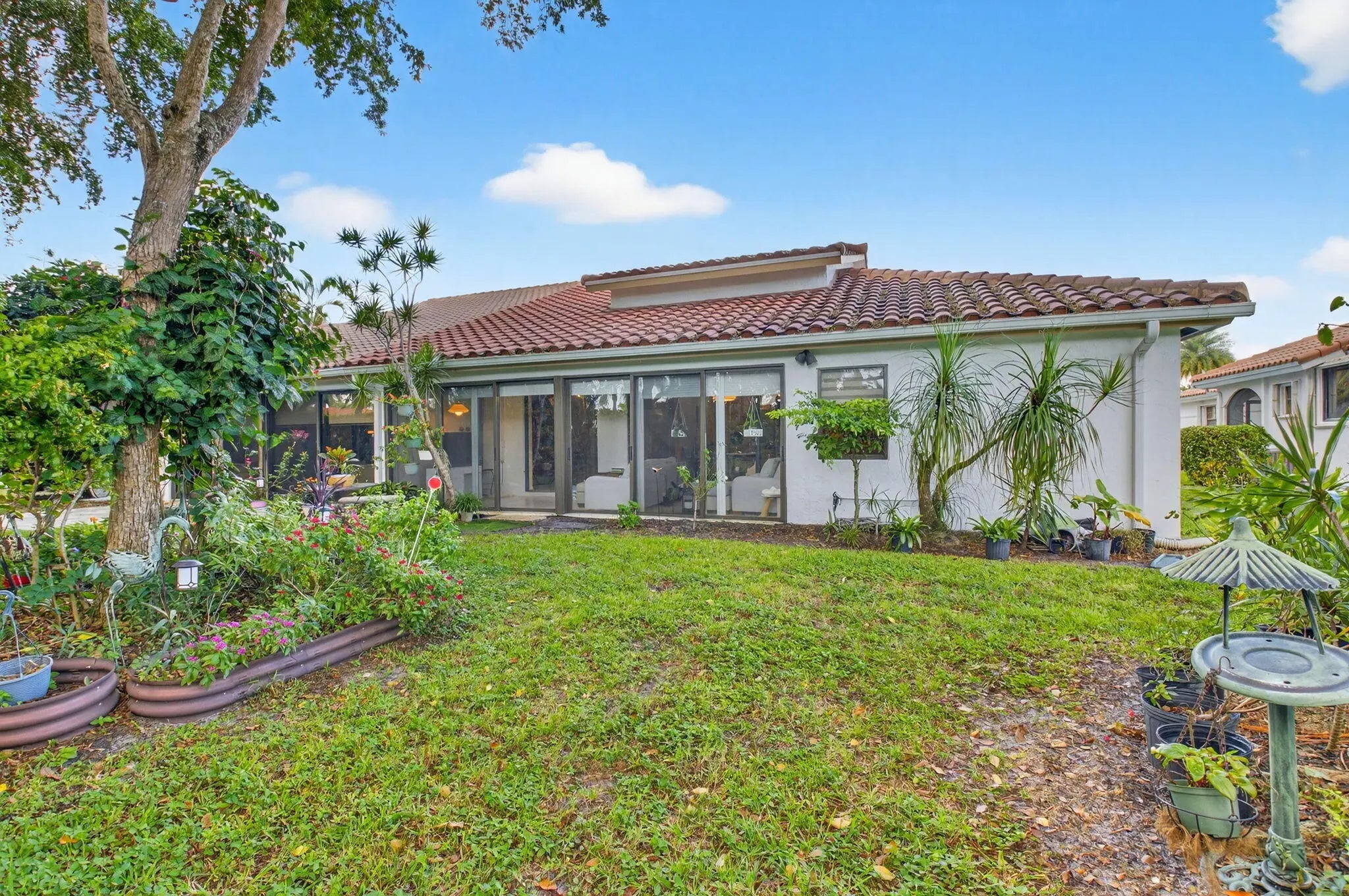 A Garden Lover's Dream Villa! Surrounded by scenic garden views, this exceptional villa is a true oasis. The charming front courtyard is bursting with vibrant orchids and flowering bushes, while the serene backyard evokes the tranquility of a botanical garden. Inside, this spacious home boasts a popular and functional floor plan, featuring a formal living room and an elegant dining area. The expansive master suite offers a luxurious master bath & a massive walk-in closet, for all your storage needs. Enjoy the outdoors year-round in the generous air-conditioned Florida room (25x9), which overlooks a lush, grassy area framed by mature greenery. Located on a peaceful cu-de-sac in a gated community, this unique home includes a 2-car garage, rarely seen in a villa. NEW ROOF-2021, AC-2021. Exterior paint-2025. Stove-2021. Dishwasher-2024. Washer/Dryer 2023. Low HOA fee includes lawn/sprinkler care, exterior painting, gate & amenities including clubhouse, swimming pool, tennis courts, pickleball courts, fitness room, sauna, BBQ area, pier. 55+ community. 2 pets welcome up to 20 lbs each. Lovely West Boca area.