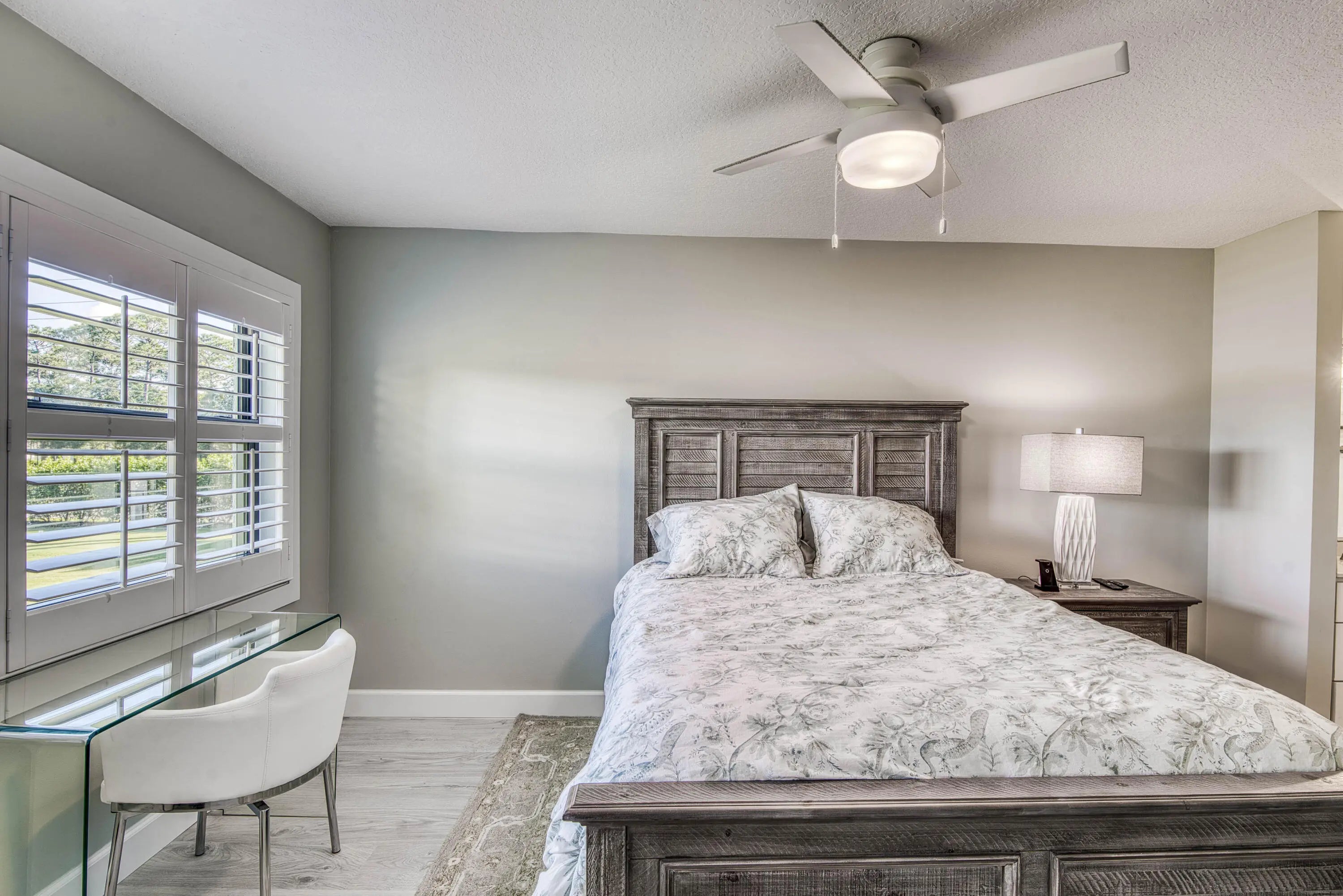Step into this bright, move-in-ready 2BR/2BA condo in the heart of Eastpointe Country Club, offering breathtaking golf and lake views from nearly every room. Located on the second floor, this home has been thoughtfully updated throughout with premium upgrades completed in 2024. Enjoy cooking in the renovated kitchen, featuring white shaker cabinetry, quartz countertops, stainless steel appliances, and glittering ceramic tile flooring. The open layout flows into a spacious living/dining area with new luxury vinyl plank flooring, creating a seamless, modern feel. Relax on your private screened balcony with direct views over holes 3, 4, and 5 of the West Course, with a tranquil lake and fountain as your backdrop. Additional upgrades include new impact windows and sliders, plantation shutters, washer/dryer, and a tankless water heater for energy efficiency and comfort. The split-bedroom layout provides privacy, and both bedrooms offer excellent storage with walk-in or double closets. Located in a guard-gated, amenity-rich community, Eastpointe offers: 2 golf courses, a brand-new clubhouse "The Pointe", resort-style pools (adults + family), a fitness center, tennis & pickleball courts, playground & practice areas, and more! All within minutes to top-rated schools, shopping, dining, and major roads. Whether you're a full-time resident or looking for a second home, this condo is a true gem!