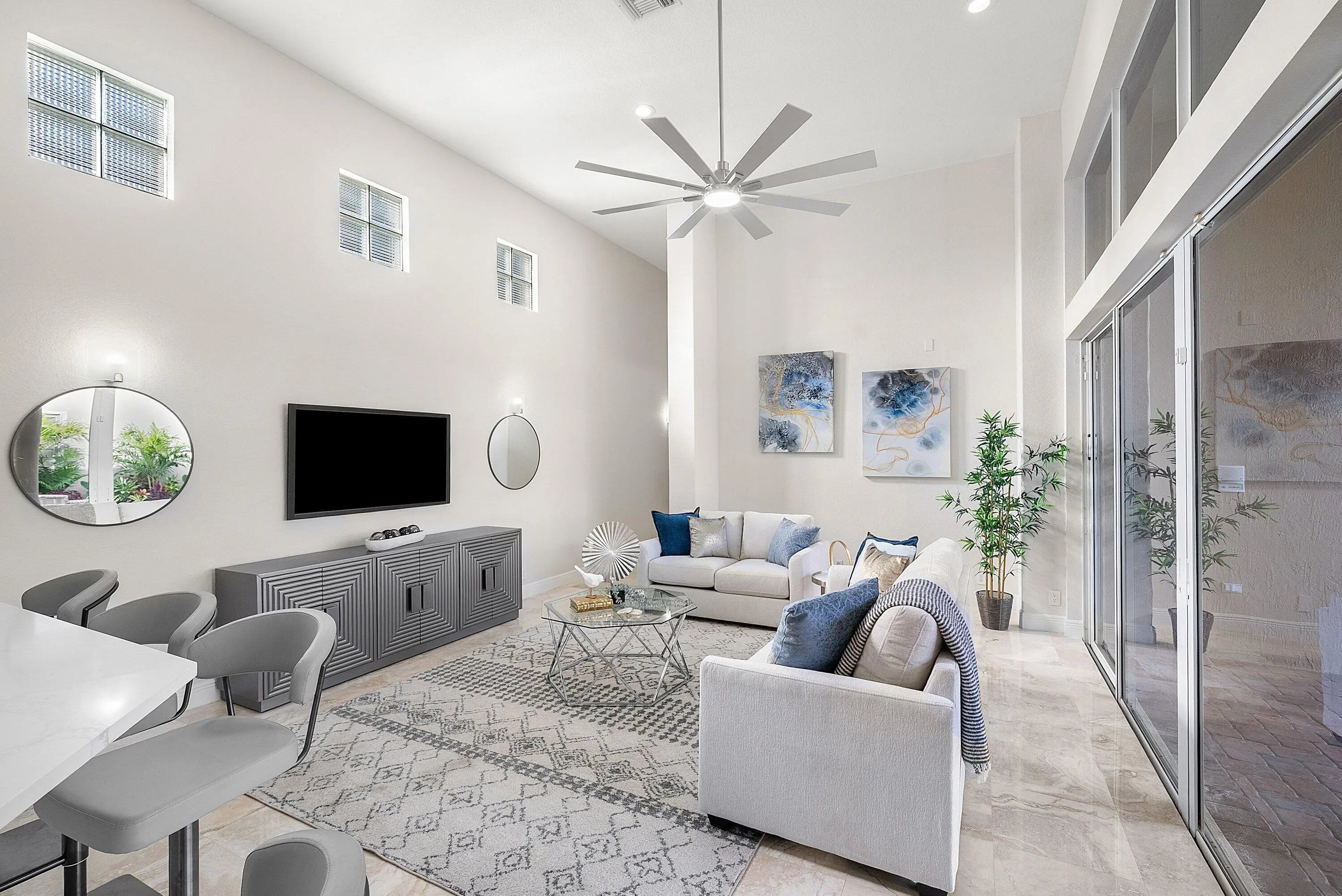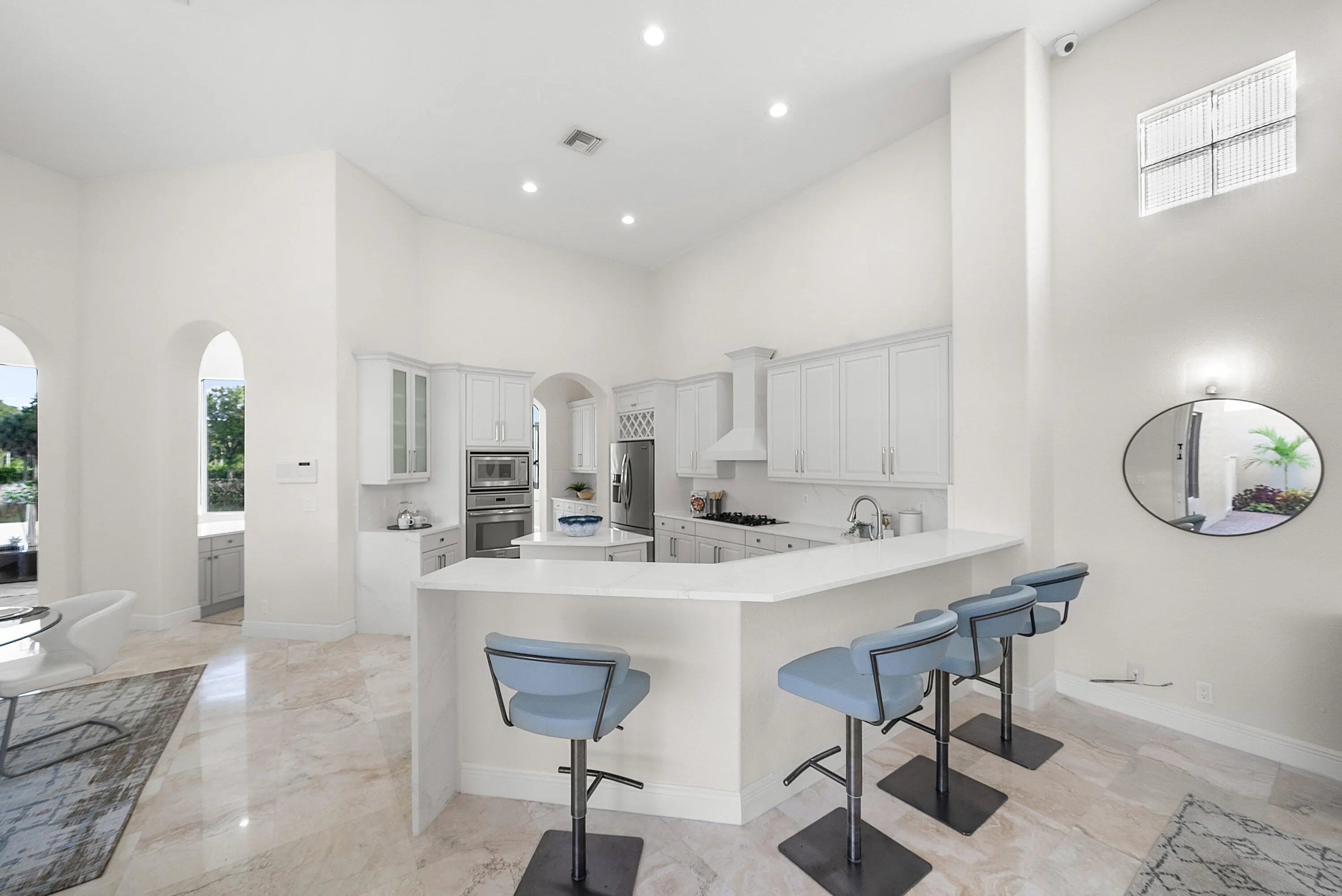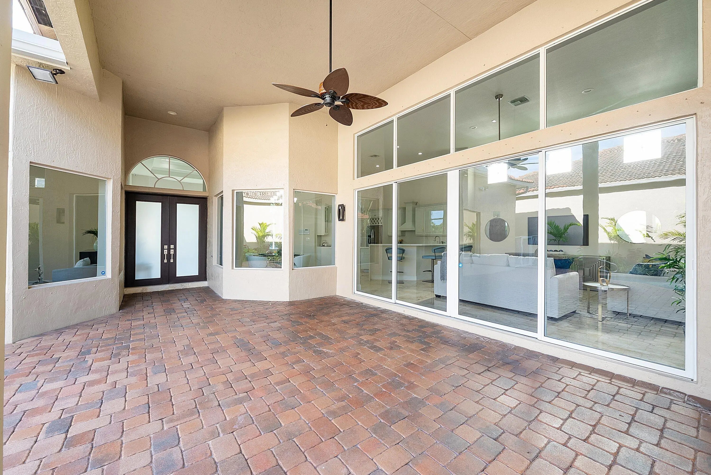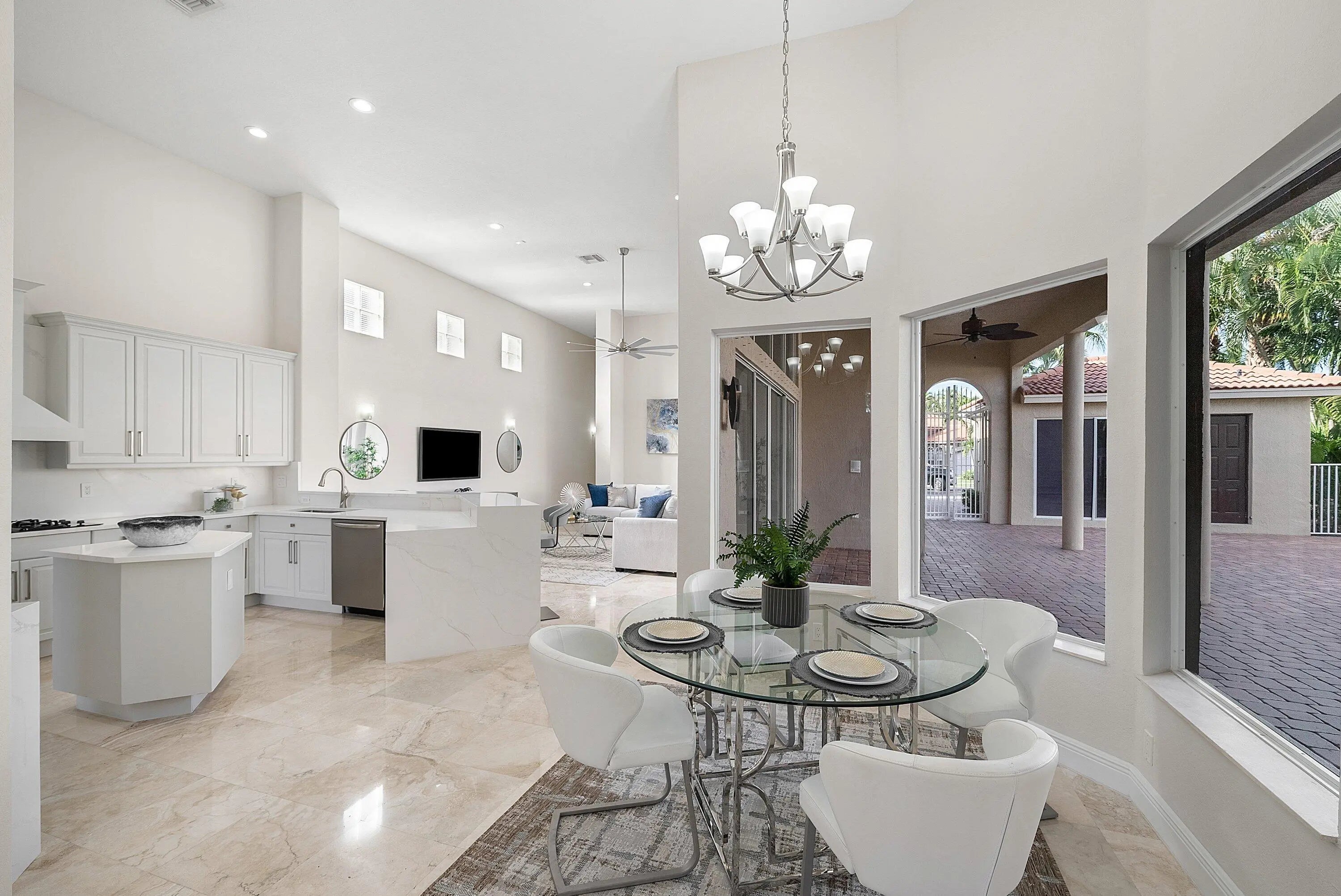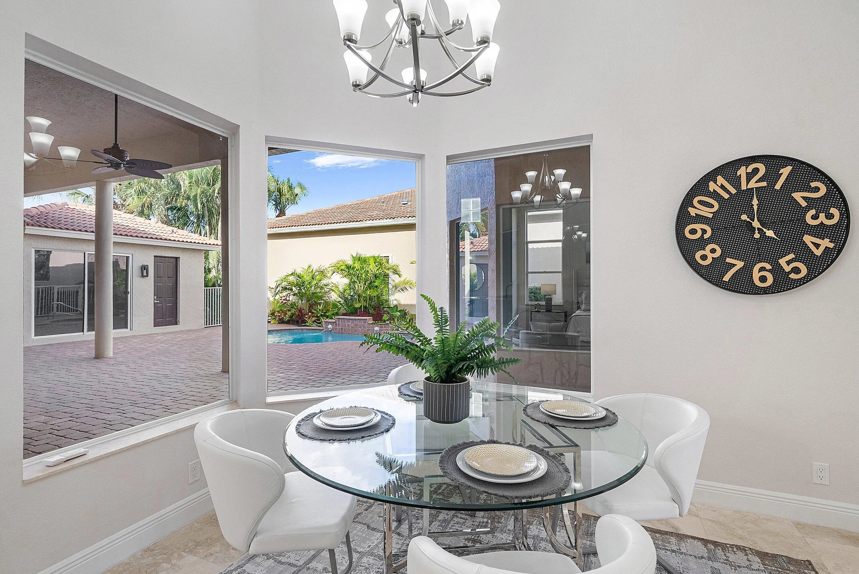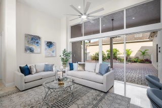 Elegant courtyard home offering serene lake views and exceptional privacy. This light-filled residence features an open floor plan with volume ceilings, crown molding, and beautiful architectural details including arched windows and doorways. Oversized windows frame expansive lake views, creating a seamless connection between indoor and outdoor living. The home offers four bedrooms and three-and-a-half bathrooms, with wood flooring in all bedrooms and polished marble throughout the main living areas. The gourmet kitchen is designed with quartz waterfall countertops, refinished custom wood cabinetry, stainless steel appliances, a natural gas cooktop, and a convenient breakfast bar. Solid 8-foot doors, and a private courtyard with a pool, perfect for relaxing or entertaining. Located in Crystal Bay within The Polo Club of Boca Raton, residents enjoy access to two championship golf courses, a premier tennis and pickleball center, a state-of-the-art fitness and spa facility, and multiple dining options. Schedule your private showing today.