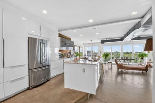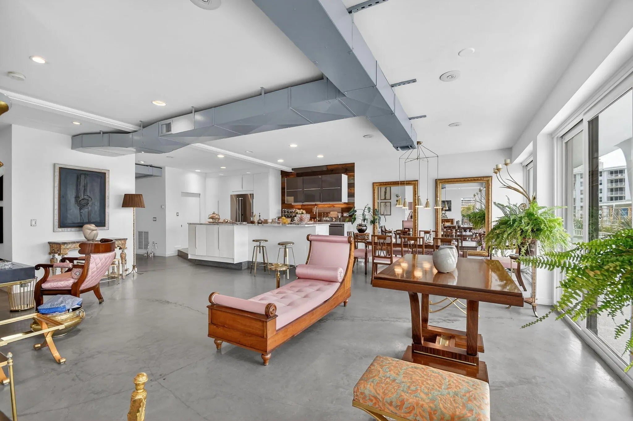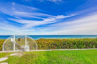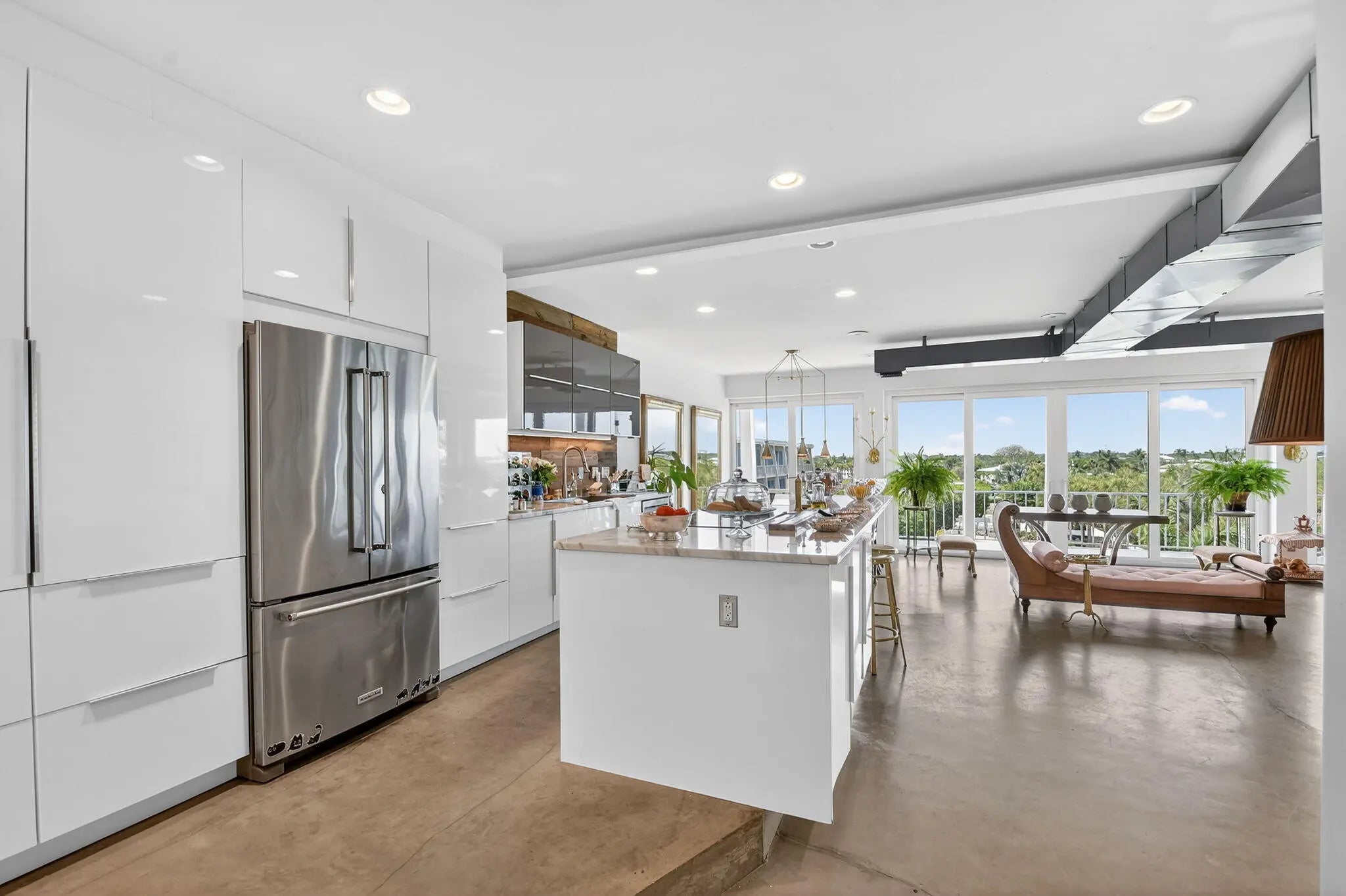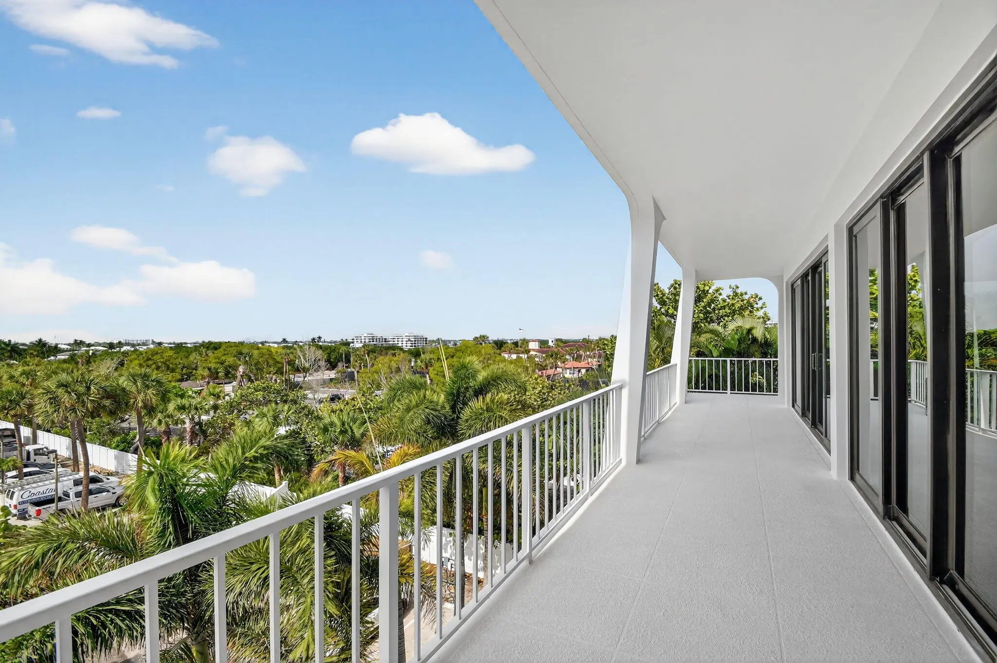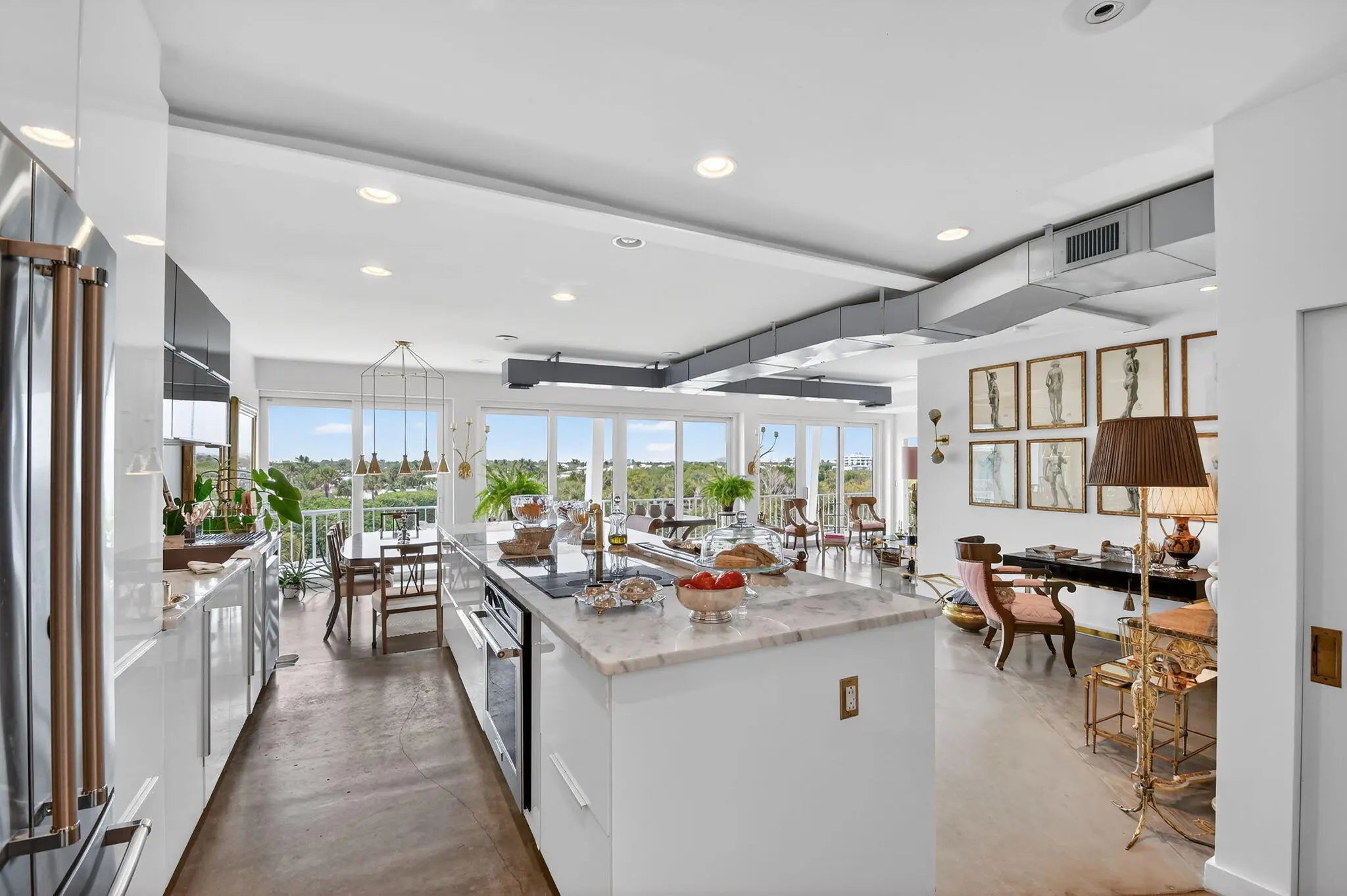 Stunning oceanfront corner unit at The Reef, a landmarked architectural jewel designed by Gene Lawrence. This completely renovated 1,868 sq/ft 2 bedroom, 2.5 bathroom plus den apartment is a modern take on coastal living with an open floor plan, polished concrete floors, volume ceilings, and uninterrupted rows of sliding impact glass doors. The kitchen features an extended white marble island and European cabinets while the sophisticated master bath features a stainless steel Japanese soaking tub. Beautifully situated on the top floor, this corner condominium has an expansive 700 sq/ft wraparound balcony offering sweeping views of the Atlantic Ocean and the tropical treetops of Phipps Ocean Park by day and sunsets over the Intracoastal Waterway each night. Private poolside cabana included The Reef has a beautiful pool deck and lawn with gated access to a pristine sandy beach. Poolside cabana with full bath and kitchenette. The award-winning Palm Beach Par 3 Golf Course and Phipps Ocean Park Tennis Center are both steps away. Adjacent to a lake trail perfect for walks, jogs, and bike rides, this chic pet-friendly building offers a modern, well-equipped gym, steam room, garage parking, doorman, and professional on-site manager.