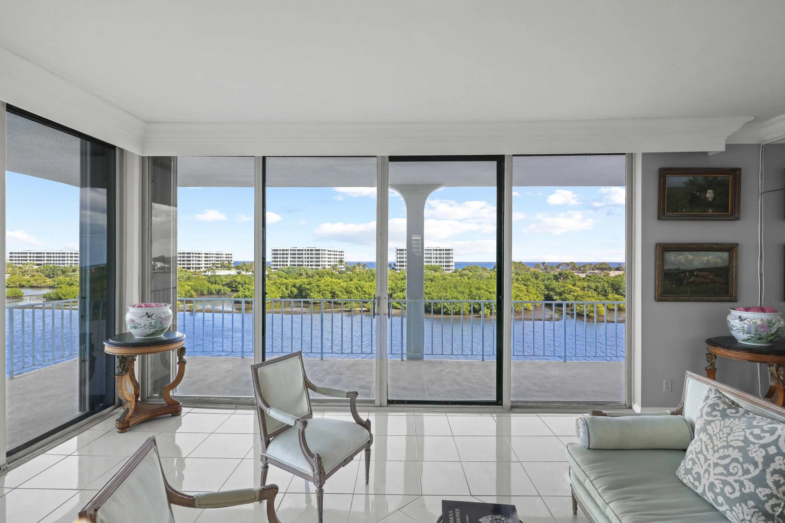 Rare northeast corner penthouse with sweeping Intracoastal and ocean views, plus western sunset exposure. Positioned across one of the widest sections of the Intracoastal, this residence offers exceptional light and water views from every main living space. An oversized wraparound covered terrace that expands the entire residence and is ideal for entertaining or relaxing outdoors year-round. The split-bedroom layout provides privacy with two separate suites, making it comfortable for both owners and guests. Floor-to-ceiling windows frame uninterrupted views and flood the apartment with natural light throughout the day. A unique opportunity to renovate and create a custom penthouse in one of Palm Beach's most desirable waterfront locations. Quiet Ibis Isle setting with easy access to walking paths, ocean parks, and a short drive to Worth Avenue and South Ocean Boulevard.