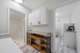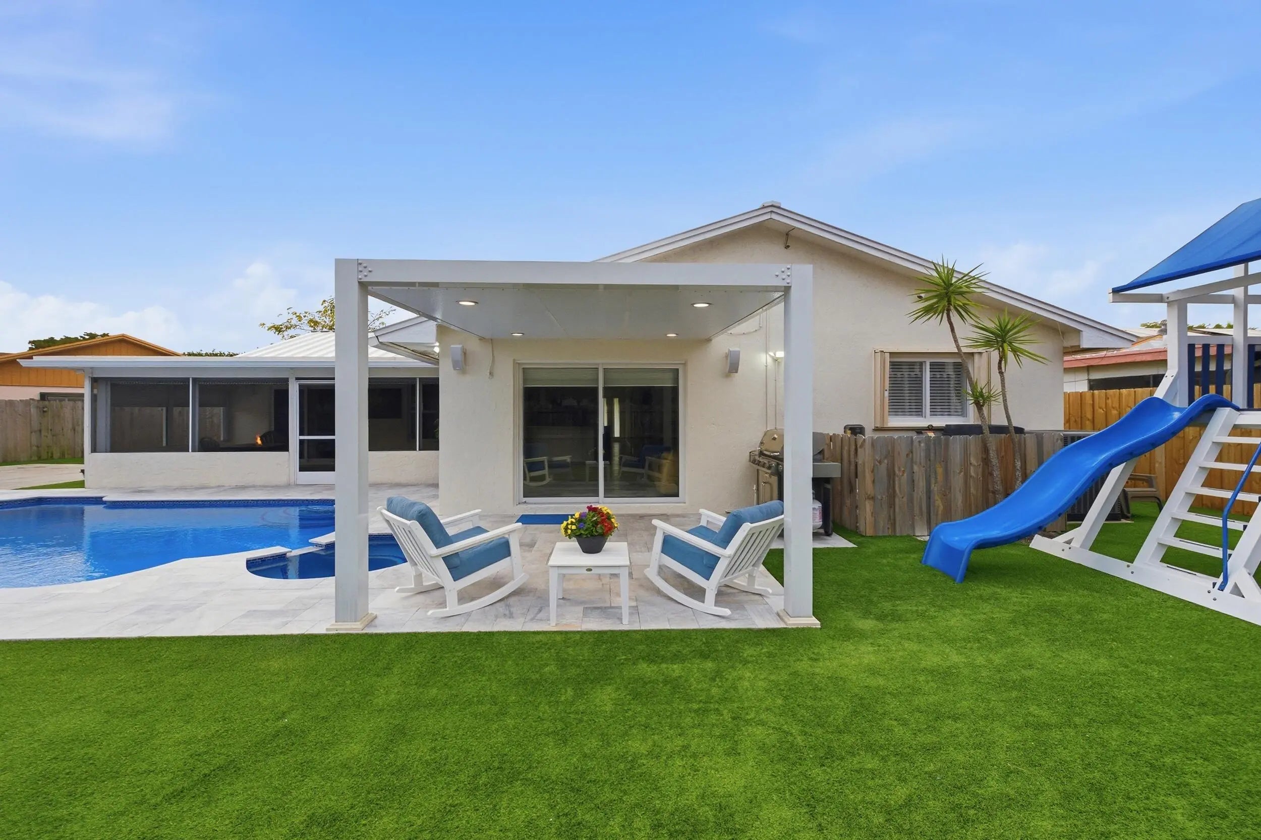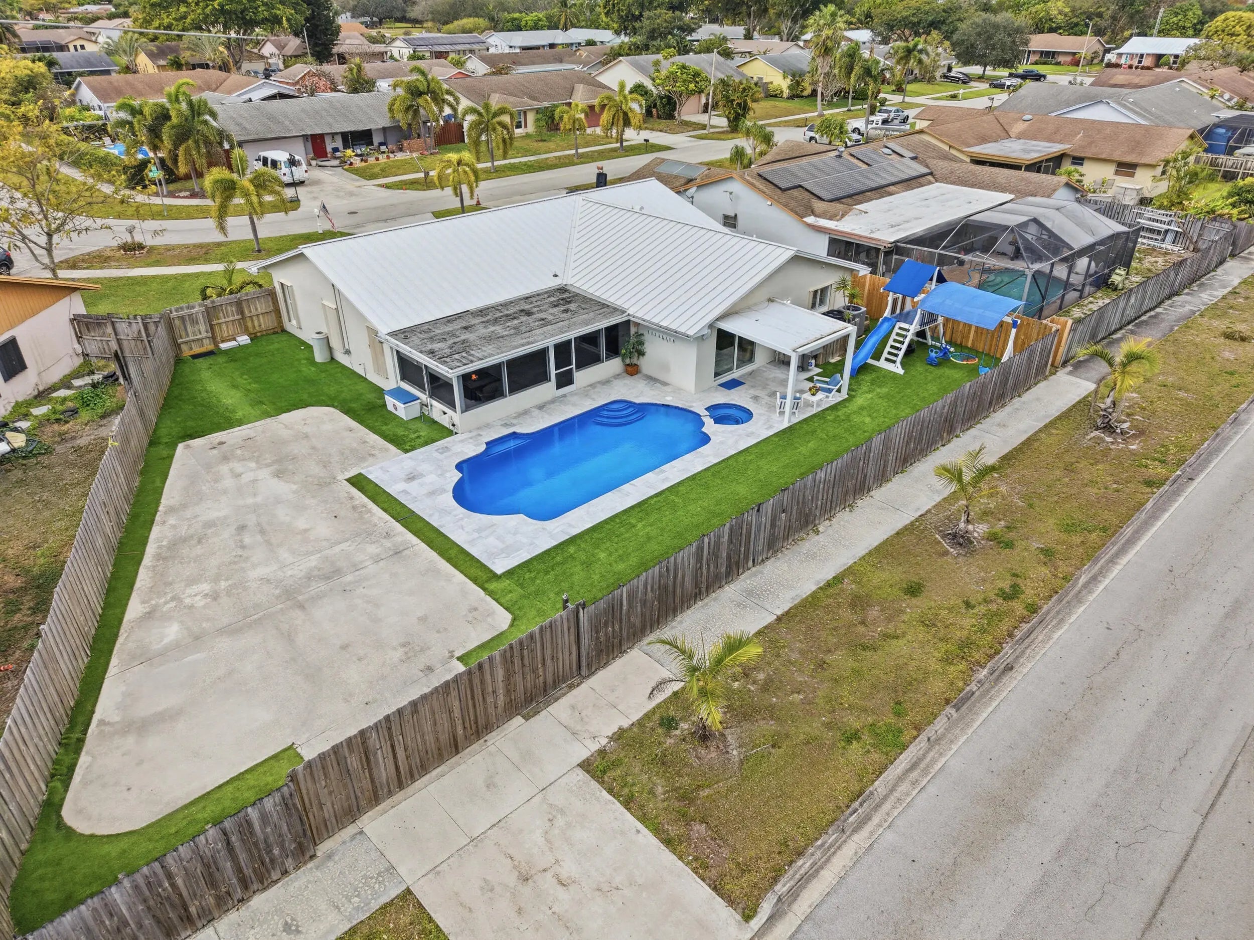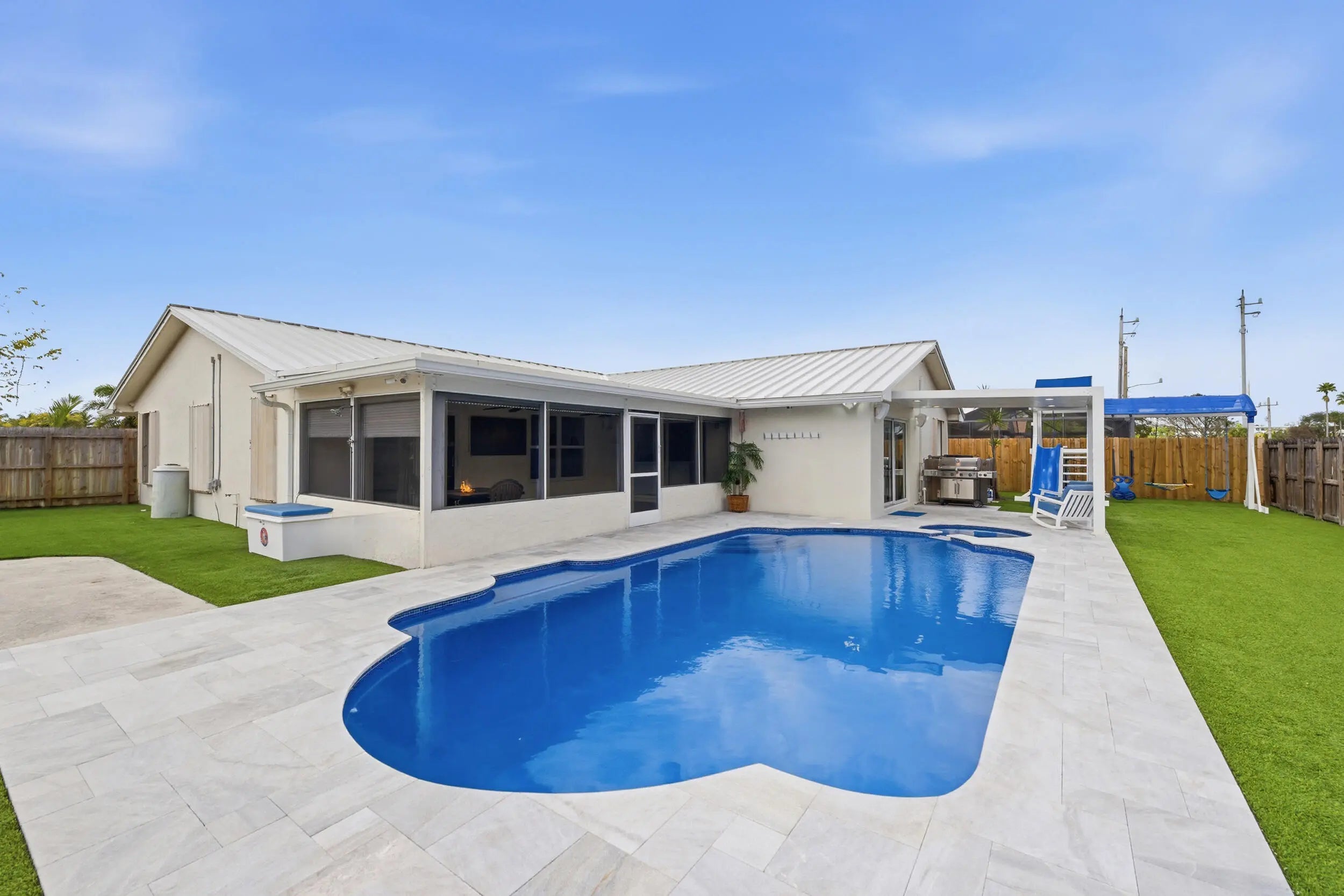 Stunning NO HOA corner lot home loaded with upgrades! Standing seam metal roof and new insulation 2024. Impact windows/ doors 2023. Updated electrical panel. 80 gal commercial WH 2023. Generator transfer switch for whole house. Backyard oasis with saltwater pool and spa with heater/chiller, RGB lighting, Azure blue resurface and Jandy equipment 2023, sandblasted marble deck, turf yard, outdoor shower, custom aluminum pergola with lighting. Screened 300 sf patio with roll down hurricane shutters. Electric 20 foot rear gate with remote, paved rear drive, 1250 sf slab, 30 amp RV hookup. Smart appliances 2024, Wi-Fi thermostat. Ethernet wired with IT rack, wired outdoor speakers, hardwired 4K cameras. Garage converted bonus suite with kitchenette, full bath, private entrance and AC.