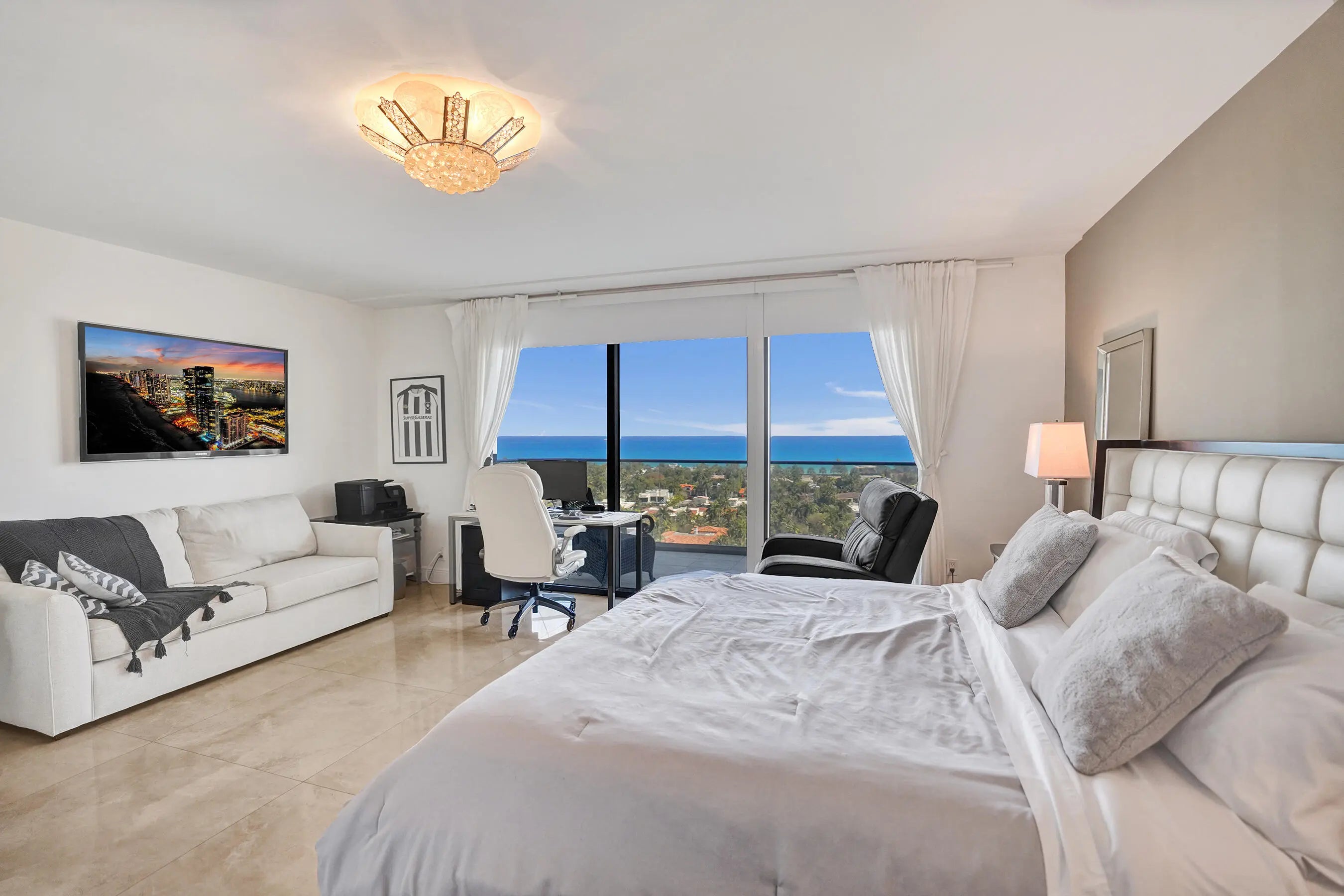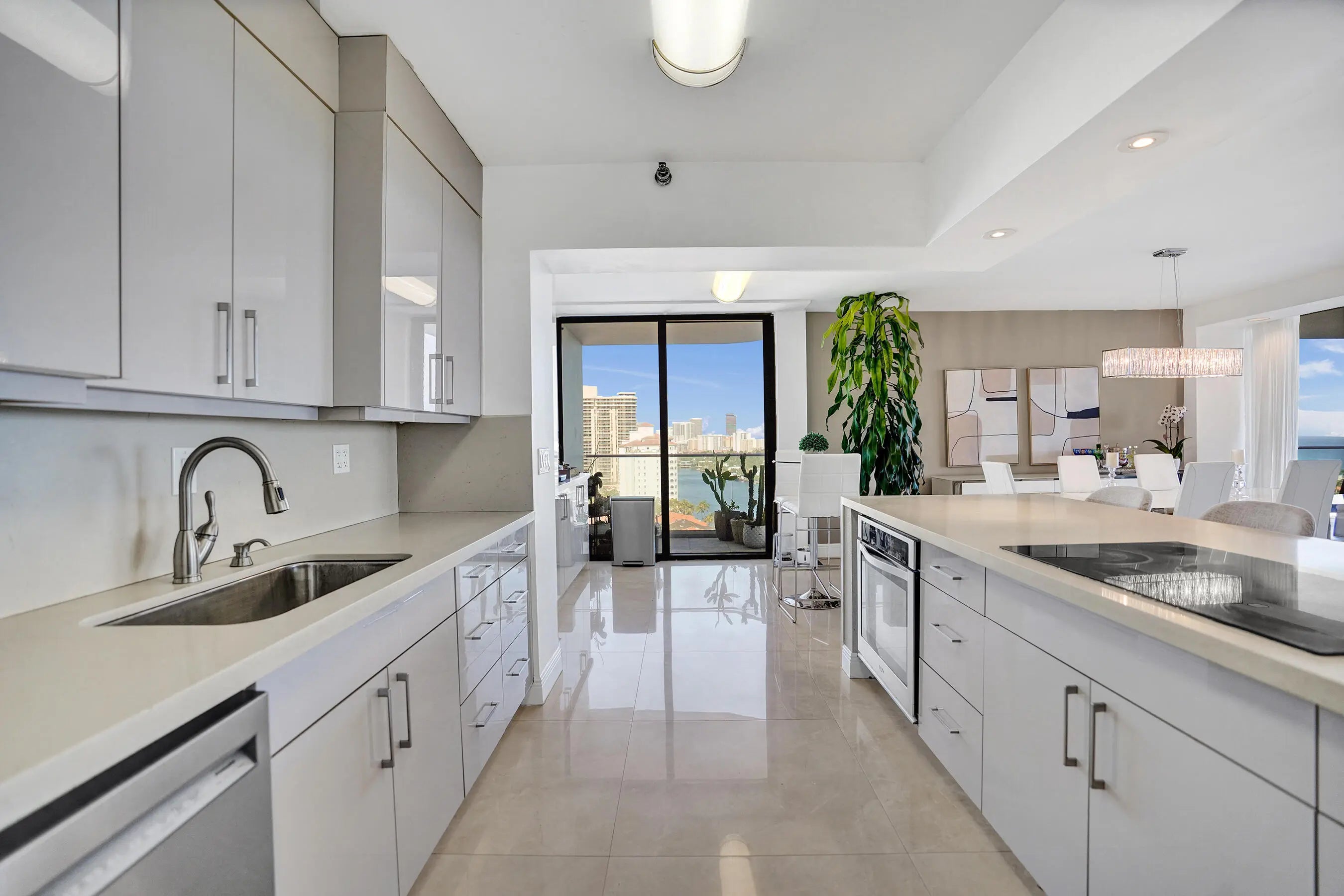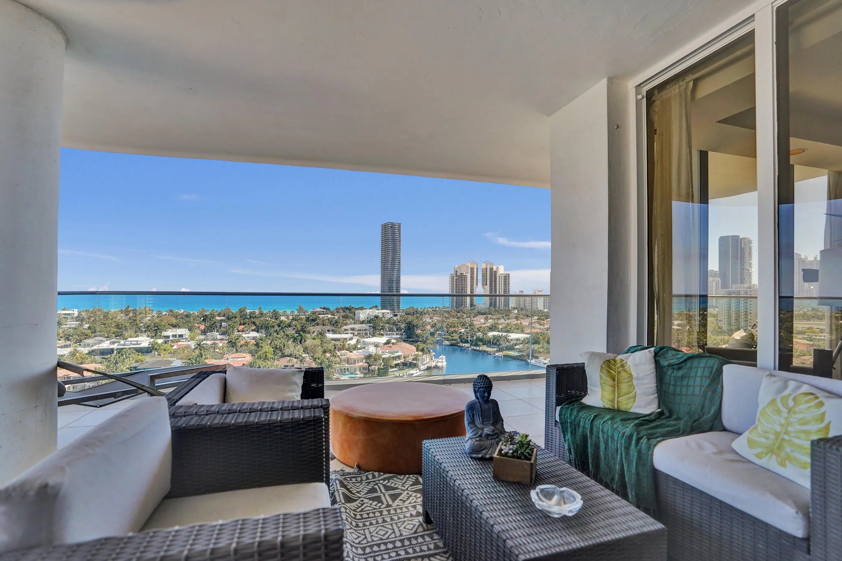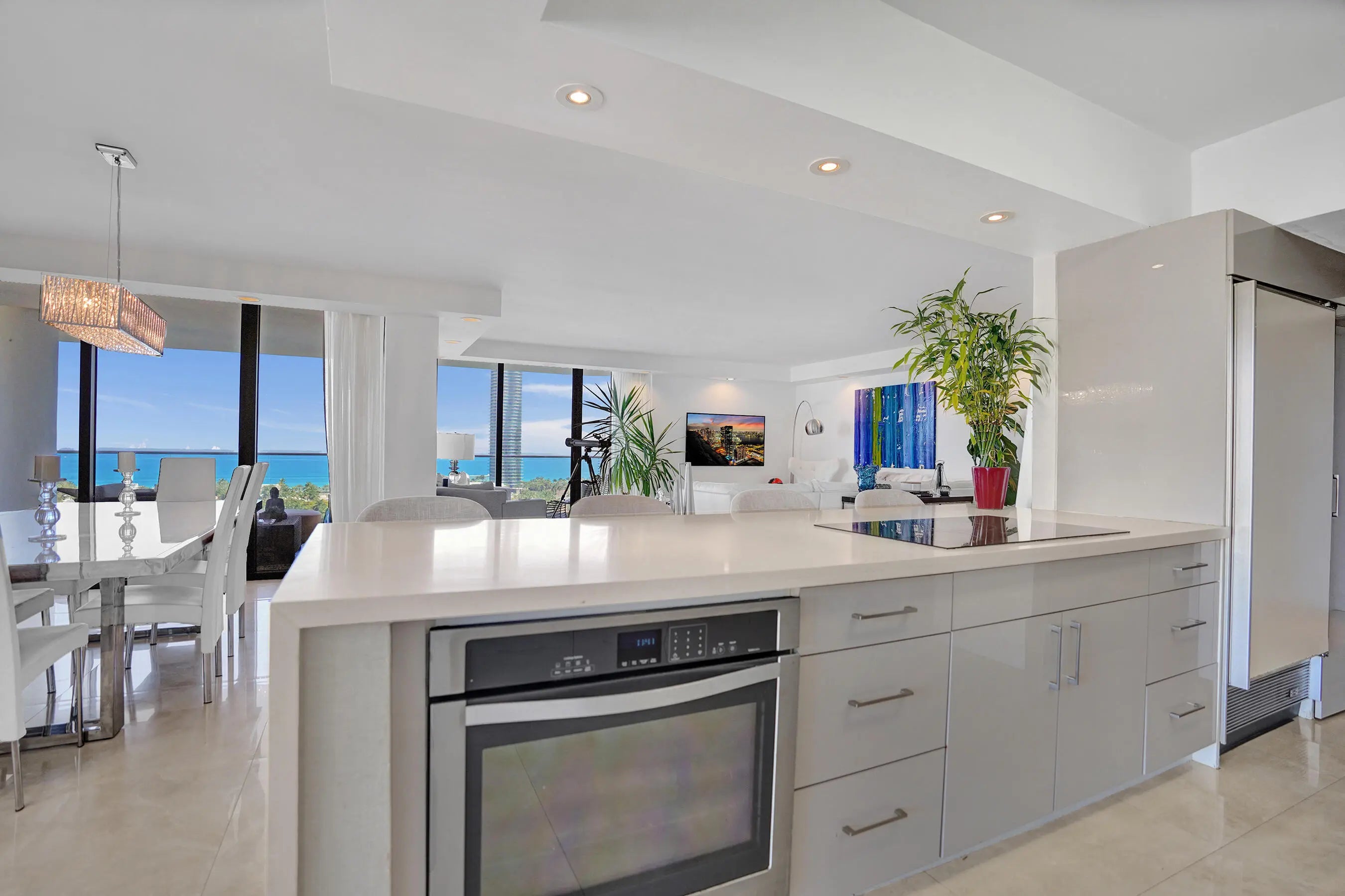 Welcome to elevated living at Turnberry Isle North. This beautifully updated 3-bedroom, 2.5-bath corner unit offering 2,360 square feet of light-filled living space and sweeping ocean, Intracoastal, and city views from three private glass balconies. The open-concept kitchen flows into expansive living and dining areas, while the split-bedroom layout provides comfort and privacy. Enjoy resort-style amenities including a heated pool with service, jacuzzi, sauna, fitness center, theater room, on-site restaurant, card and party rooms, children's playroom, extra storage, and bicycle room. Just steps from the scenic 3-mile path around Turnberry Golf Course. Prime location near Aventura Mall, marinas, dining, houses of worship.