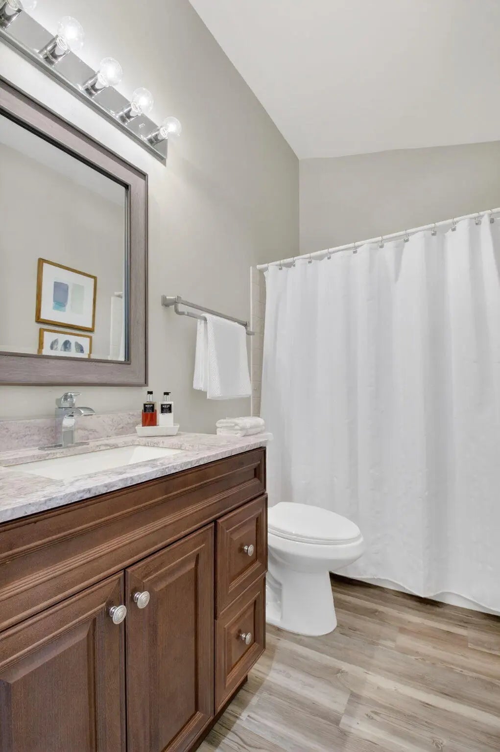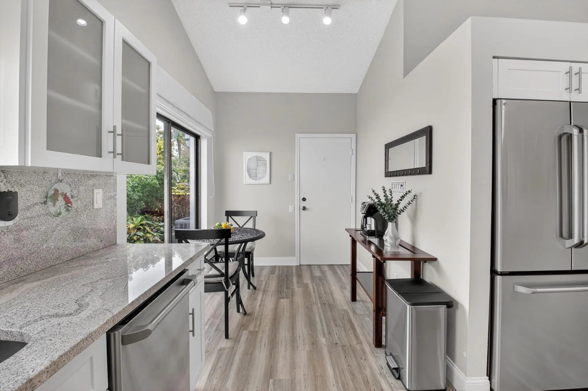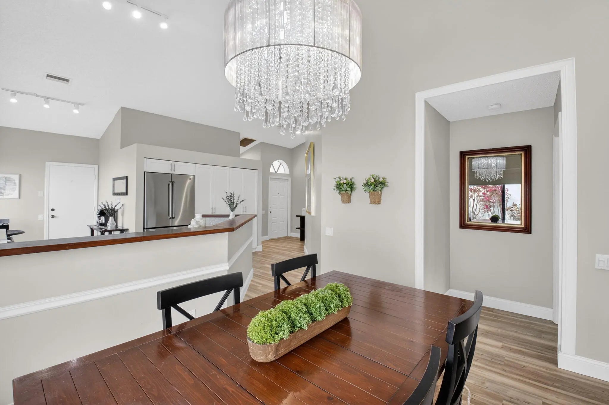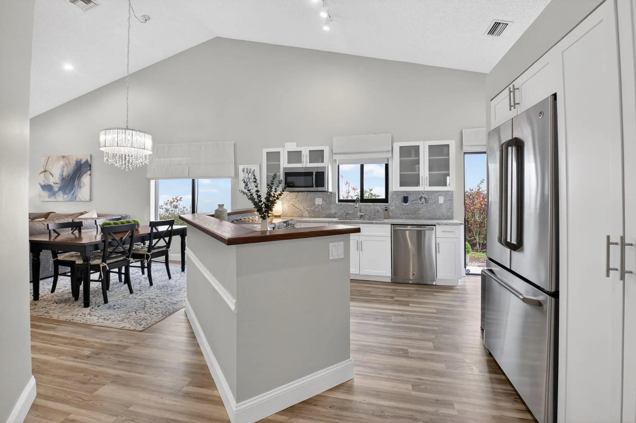 Welcome to 5536 Fox Hollow Drive -- a beautifully updated one-story lakefront retreat in the heart of Central Boca Raton. This light-filled 2-bedroom, 2-bath residence offers 1,585 total square feet of thoughtfully designed living space with a desirable split-bedroom layout and soaring cathedral ceilings that create an airy, expansive feel from the moment you enter. The redesigned kitchen is the heart of the home, featuring custom cabinetry, stainless steel appliances, and an inviting eat-in area with breakfast bar -- perfectly positioned to flow into the open living spaces. Elegant vinyl wood flooring runs throughout, adding warmth and continuity to the interior. Wake up and unwind to breathtaking lake views, with a generously sized backyard and side yard offering rare outdoor space. The screened-in patio provides the ideal setting for relaxing evenings, morning coffee, or effortless entertaining. Additional highlights include a 1.5-car garage with extra storage, plus a two-car driveway for added convenience. Ideally located just minutes from Boca Town Center Mall, top-rated dining, shopping, and every service imaginable -- this home combines tranquil waterfront living with unbeatable accessibility. A rare opportunity to enjoy serene lakefront living in one of Boca Raton's most sought-after central locations.