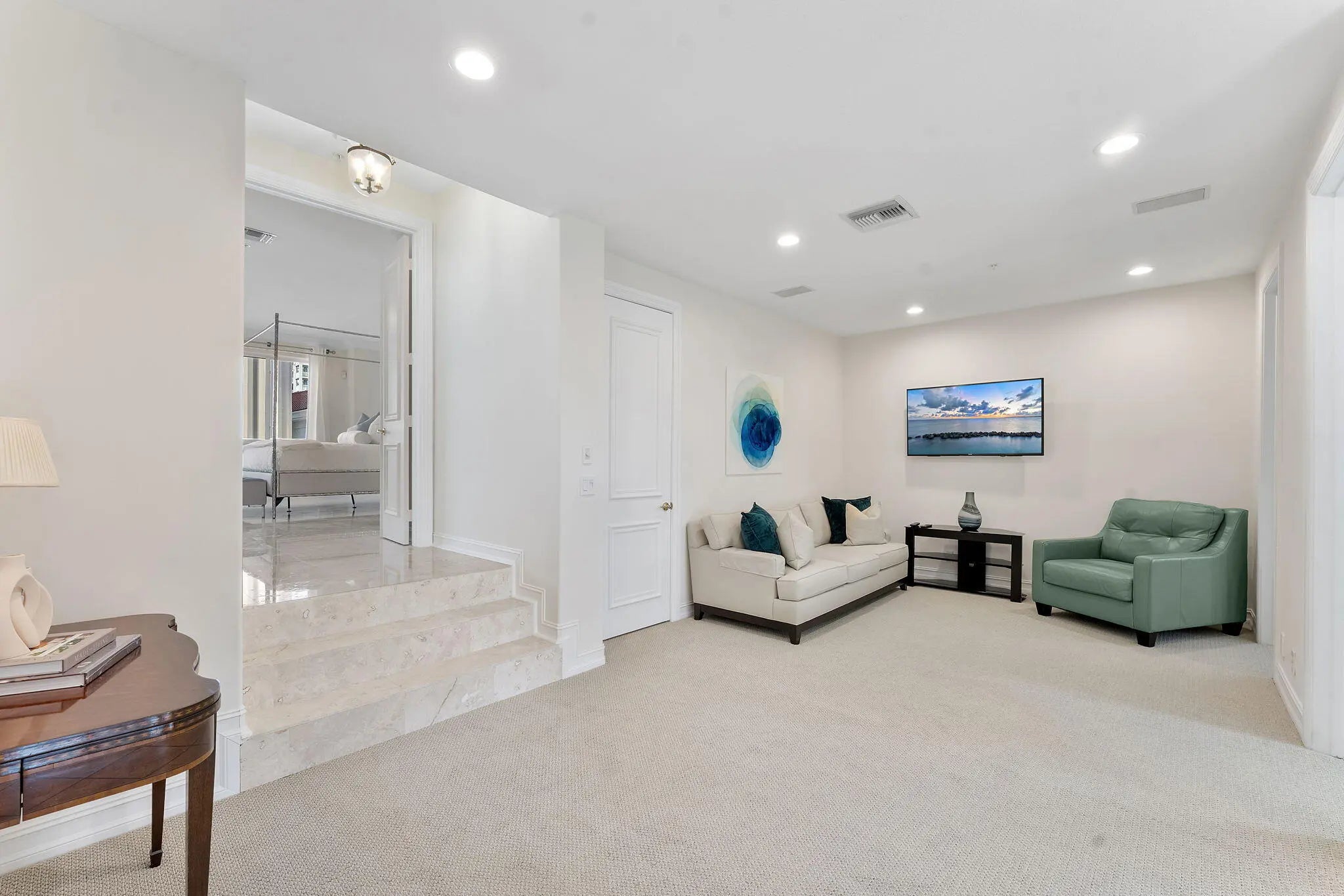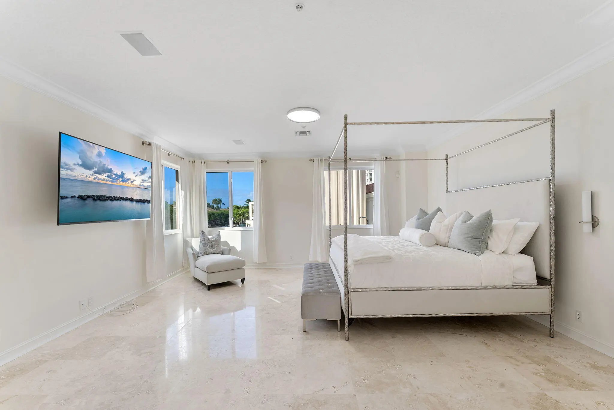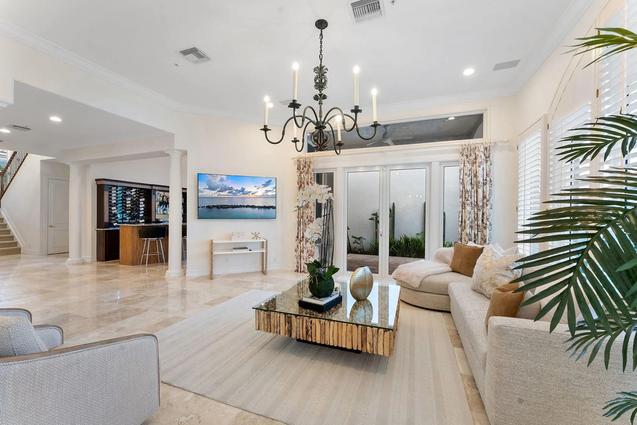 Welcome to one of Highland Beach's most exclusive and rarely available coastal enclaves -- a gated community of just 17 residences with private beach access only steps away. Offered fully furnished and completely turn-key, this meticulously updated 4 bedroom/4 full bathroom home includes major 2025 capital improvements: a brand-new roof, new gutters, and full impact windows and doors -- providing both elevated style and long-term peace of mind. Inside, soaring ceilings and abundant natural light frame a beautifully reimagined interior designed for effortless coastal luxury. A custom built-in bar with seating for eight anchors the main living space -- a striking focal point rarely found in comparable homes within the community. Plantation shutters, LED lighting throughout, integrated surround sound, custom closets, and refined finishes elevate the home's comfort and sophistication. Every detail has been thoughtfully curated to deliver a refined yet relaxed coastal lifestyle.