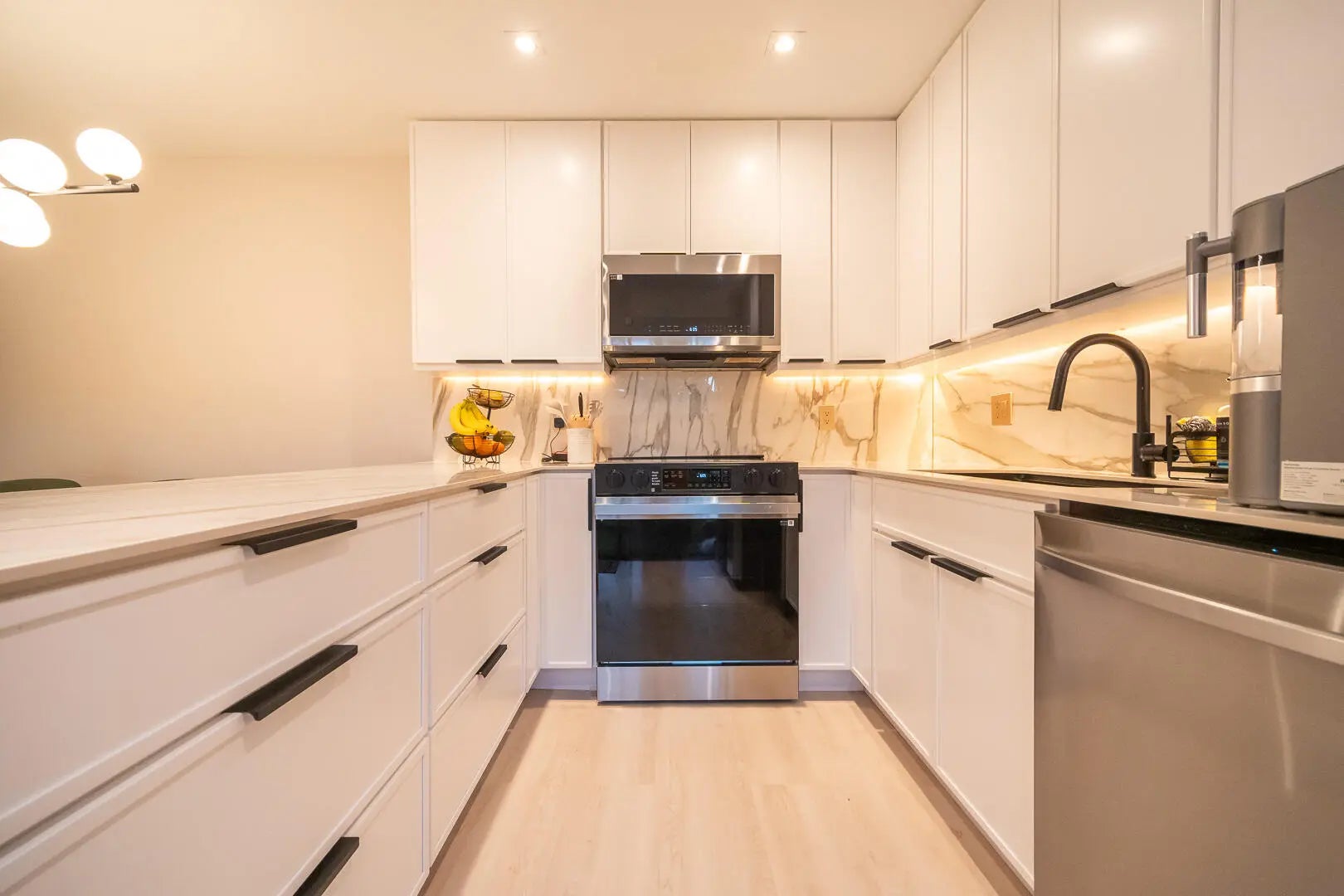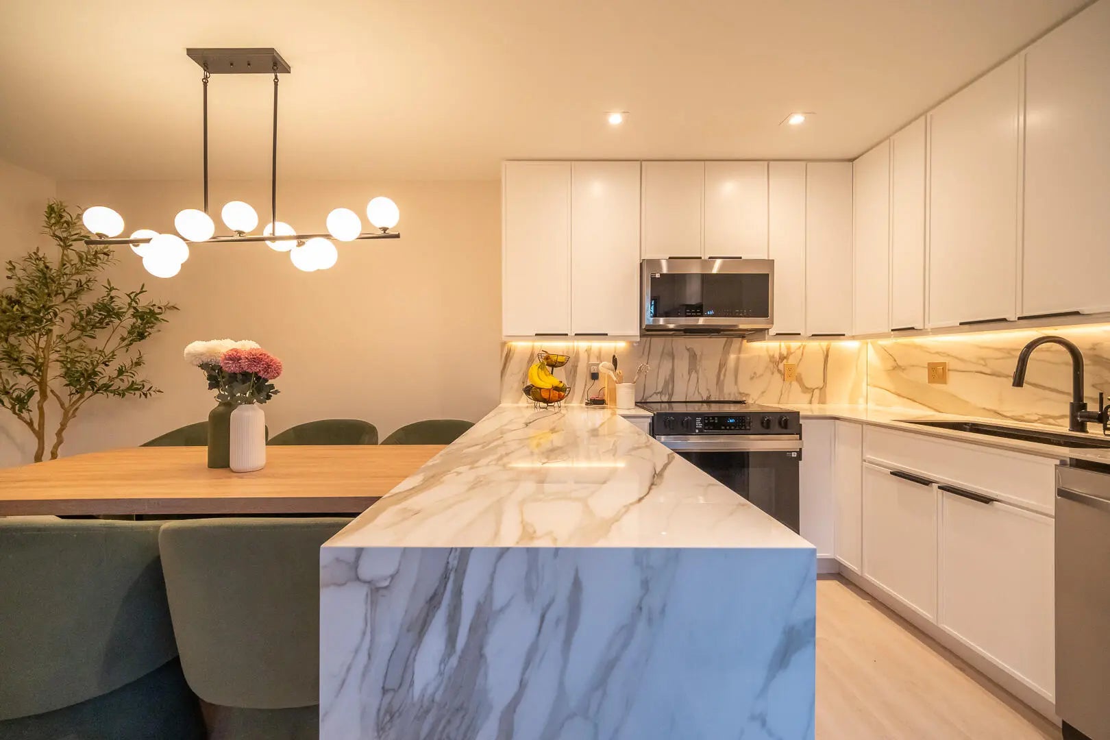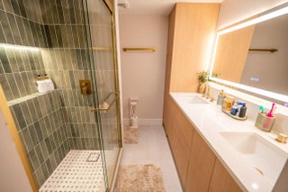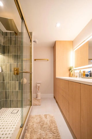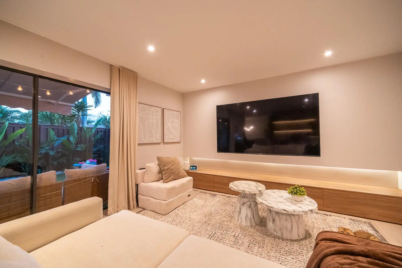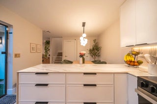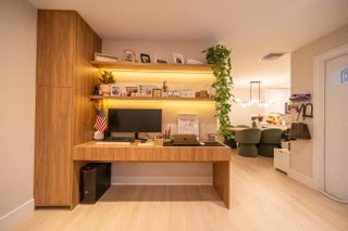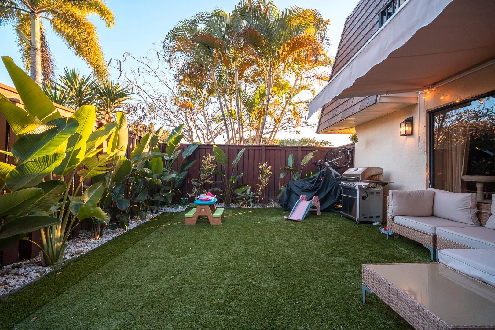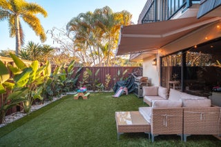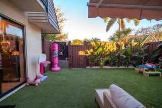 This beautifully updated unit features a bright open-concept layout, sleek contemporary kitchen with custom cabinetry, quartz countertops, stainless steel appliances, and stylish lighting fixtures. The full-height quartz backsplash adds a seamless, high-end look, while under-cabinet lighting enhances both ambiance and practicality. The oversized island offers abundant storage and seating space, making it perfect for entertaining, casual dining, or family gatherings. Light wood flooring and designer lighting tie everything together, creating a bright, sophisticated, and move-in-ready kitchen that truly serves as the heart of the home. The living and dining areas flow seamlessly, creating a perfect space for both everyday living and entertaining. Both bathrooms have been tastefully renovated with modern vanities, updated tile work, and elegant fixtures. The spacious bedrooms offer comfort and functionality, while the overall design showcases clean lines, neutral tones, and high-end touches throughout. Move-in ready and designed for today's lifestyle, this townhome is the perfect combination of style, comfort, and quality craftsmanship. Beautiful private outdoor space designed for both relaxation and family fun. This fully fenced patio features low-maintenance artificial turf, creating a clean and green look year-round. The covered seating area with retractable awning provides shade and comfort, perfect for entertaining or enjoying peaceful mornings outdoors. Surrounded by lush tropical landscaping and palm trees, the space offers privacy and a true South Florida feel. There's plenty of room for outdoor furniture, a grill station, and even a dedicated play area, making it ideal for families or anyone who loves indoor-outdoor living. A rare find spacious, functional, and inviting backyard-style patio that extends your living space beautifully.