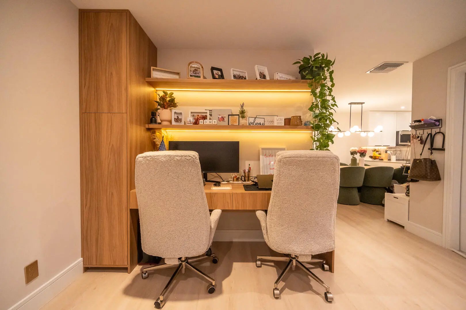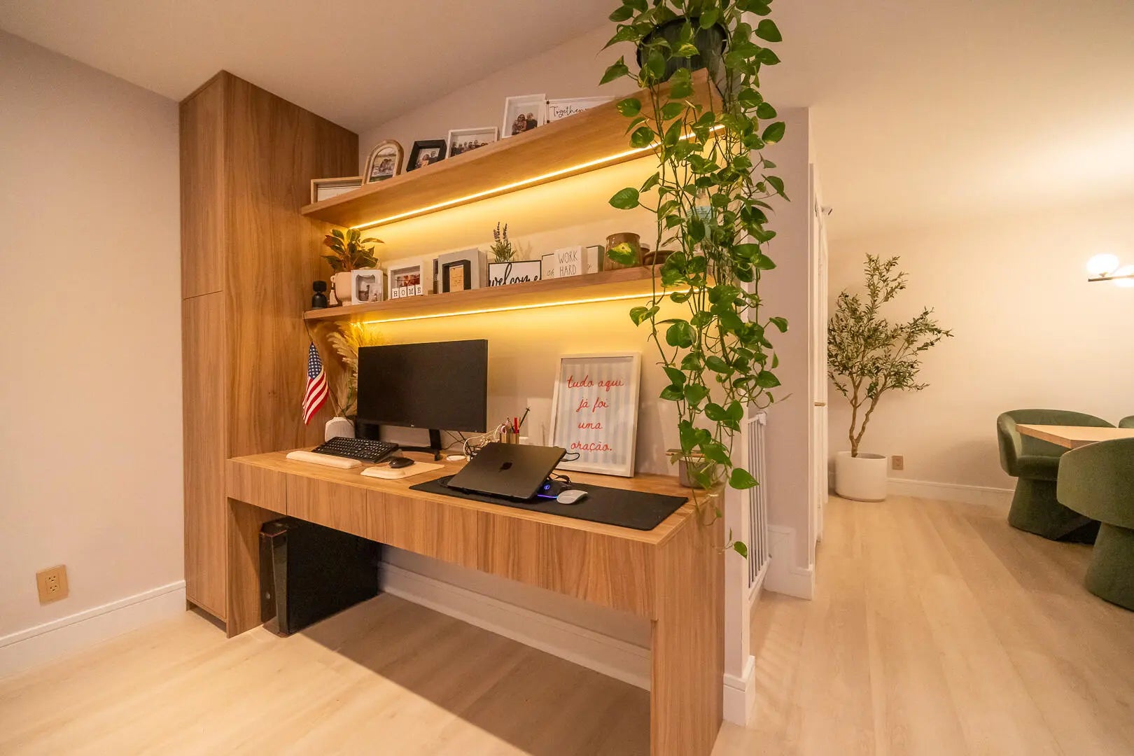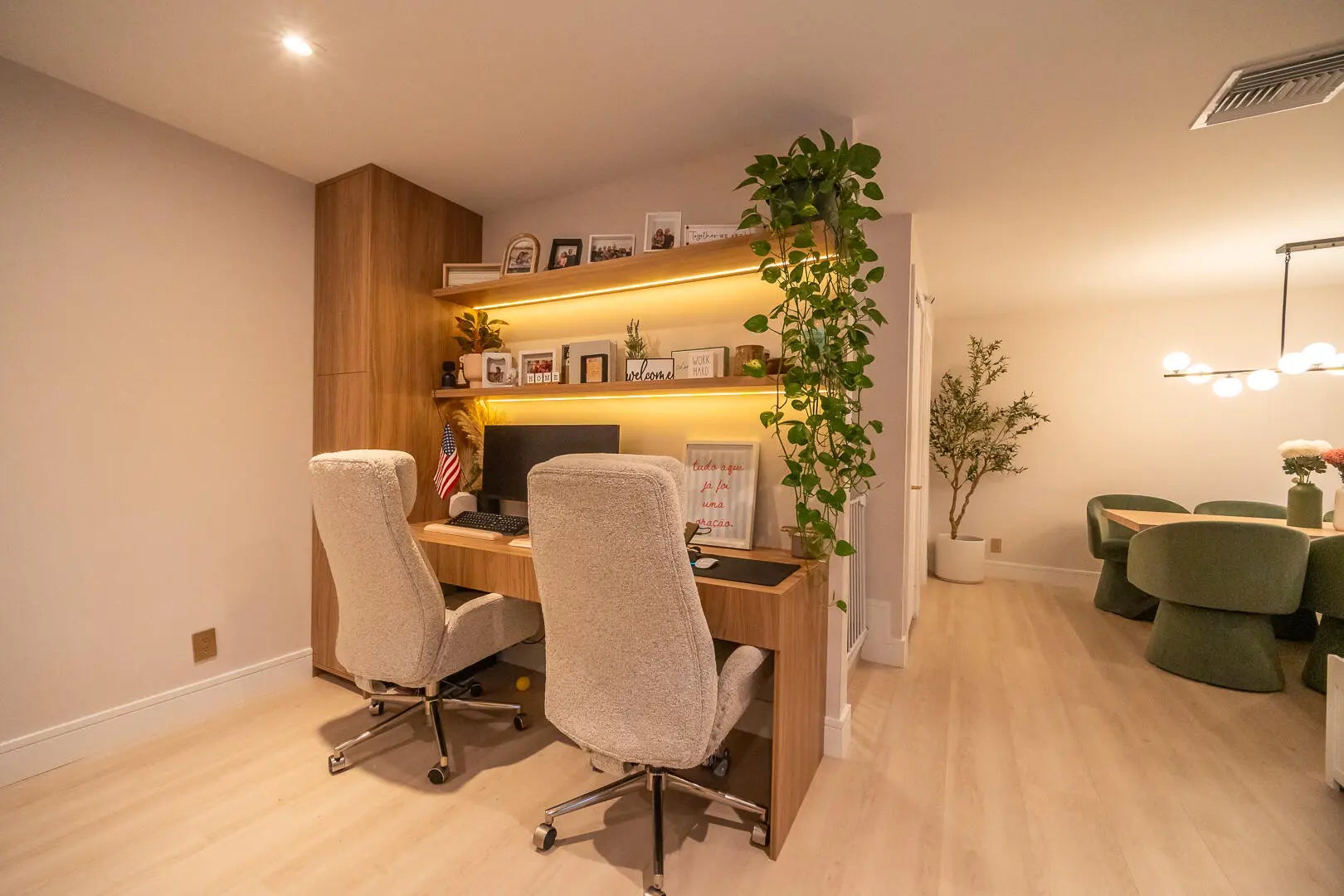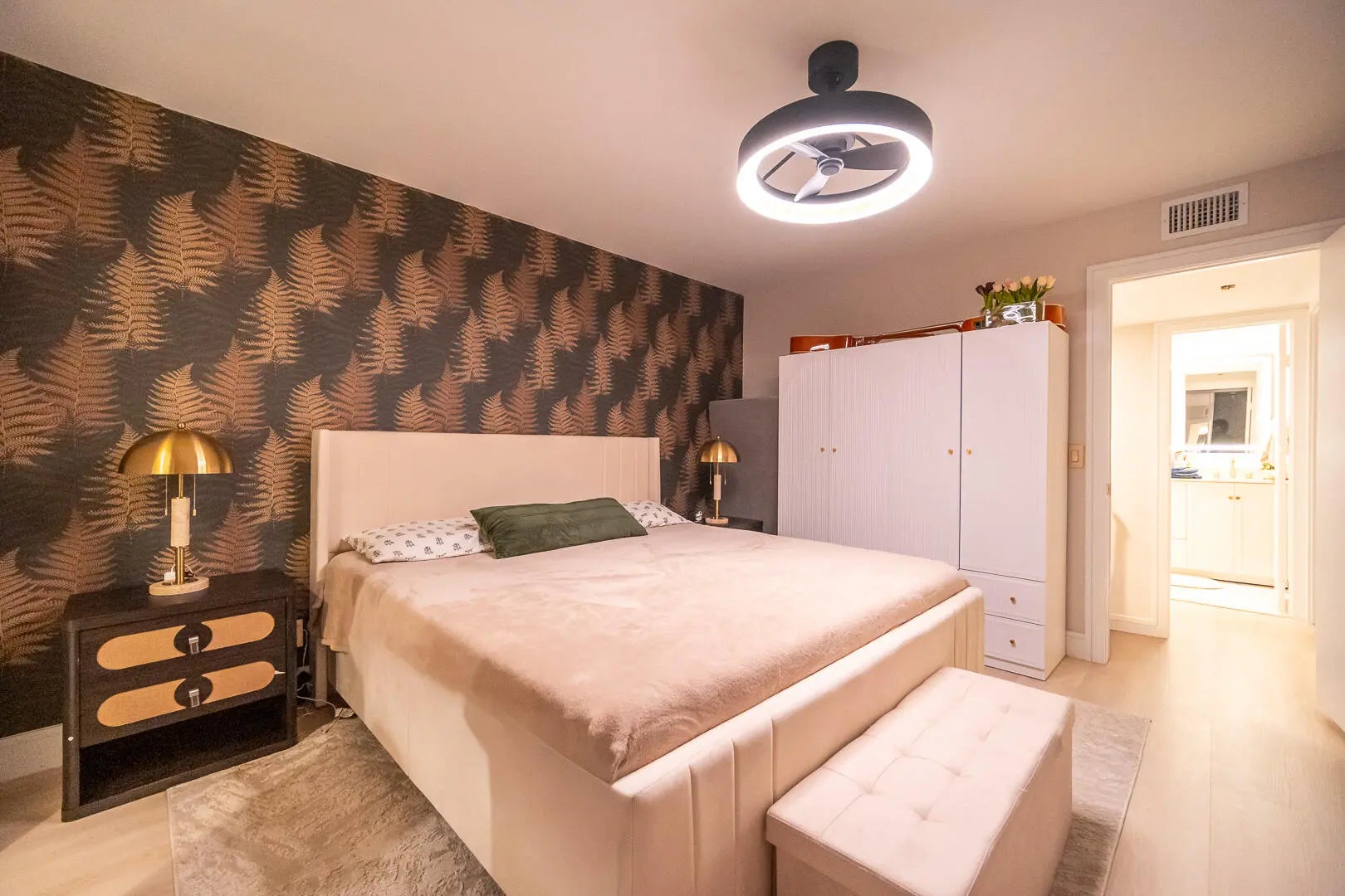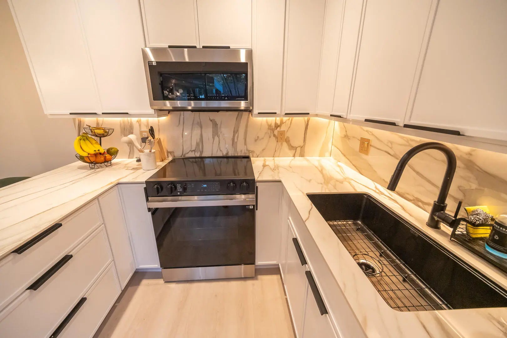 This beautifully updated unit features a bright open-concept layout, sleek contemporary kitchen with custom cabinetry, quartz countertops, stainless steel appliances, and stylish lighting fixtures. The full-height quartz backsplash adds a seamless, high-end look, while under-cabinet lighting enhances both ambiance and practicality. The oversized island offers abundant storage and seating space, making it perfect for entertaining, casual dining, or family gatherings. Light wood flooring and designer lighting tie everything together, creating a bright, sophisticated, and move-in-ready kitchen that truly serves as the heart of the home. The living and dining areas flow seamlessly, creating a perfect space for both everyday living and entertaining. Both bathrooms have been tastefully renovated with modern vanities, updated tile work, and elegant fixtures. The spacious bedrooms offer comfort and functionality, while the overall design showcases clean lines, neutral tones, and high-end touches throughout. Move-in ready and designed for today's lifestyle, this townhome is the perfect combination of style, comfort, and quality craftsmanship. Beautiful private outdoor space designed for both relaxation and family fun. This fully fenced patio features low-maintenance artificial turf, creating a clean and green look year-round. The covered seating area with retractable awning provides shade and comfort, perfect for entertaining or enjoying peaceful mornings outdoors. Surrounded by lush tropical landscaping and palm trees, the space offers privacy and a true South Florida feel. There's plenty of room for outdoor furniture, a grill station, and even a dedicated play area, making it ideal for families or anyone who loves indoor-outdoor living. A rare find spacious, functional, and inviting backyard-style patio that extends your living space beautifully.