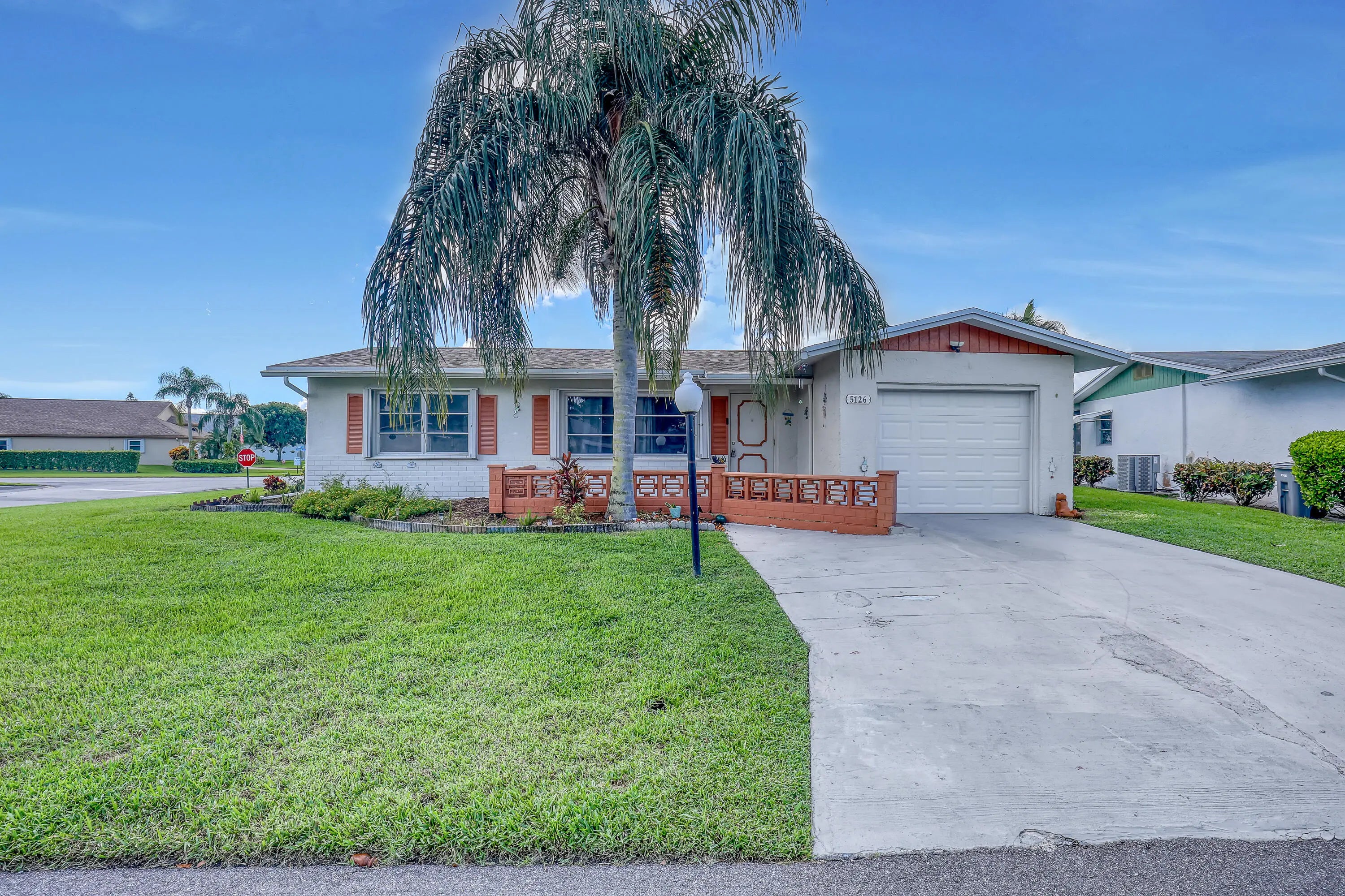 Charming 2 BR, 2 BA home with 1-car garage on a corner lot. Spacious floor plan featuring an updated kitchen with granite countertops and stainless steel appliances (2023). Roof, A/C, and garage door all replaced in 2021. Updated lighting throughout. Perfect for gardeners with flower beds and shrubs surrounding the house. Accordion storm shutters on all windows. Ready for your personal touches. Located in an active 55+ community in the heart of WPB, close to City Place, FL Turnpike, and I-95.