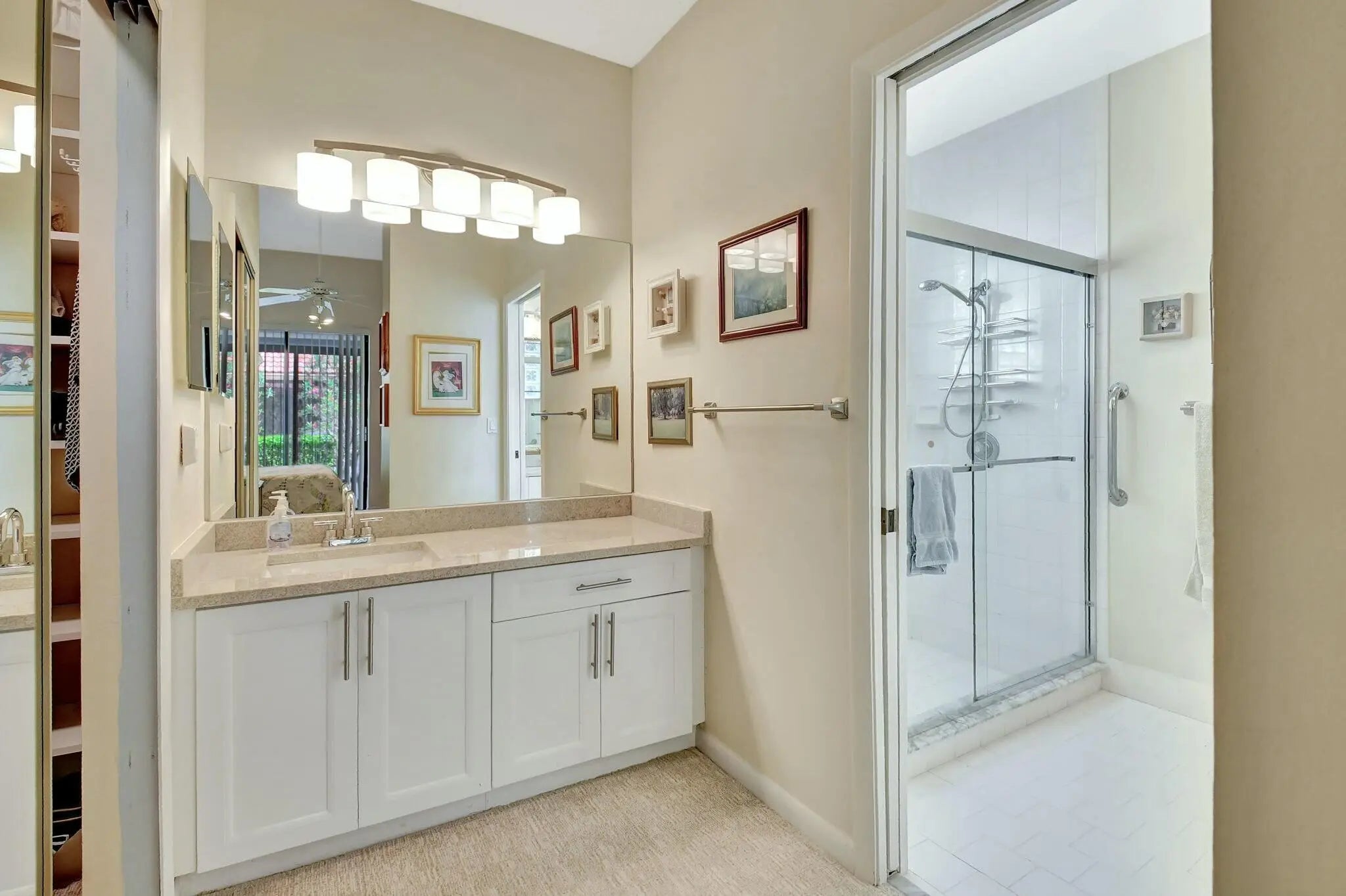 Beautifully maintained villa is ready for its new owner. This lovely 2 bedroom, 2 bath, one car garage unit has been meticulously cared for. Water heater was replaced in 2020. The kitchen is equipped with newer quartz countertops (2022), backsplash and refaced kitchen cabinets. The primary bathroom has also been renovated including a new glass shower enclosure. The primary closet has been fitted to maximize space and organization. Carpeting was replaced in both the primary and guest bedrooms. The living room/dining room are open making it great space to entertain family and friends. The enclosed Florida room is a perfect spot to capture the view of the lake and enjoy your favorite beverage whether it's a cup of coffee in the morning or a nightcap before bed.