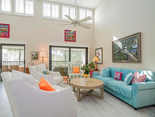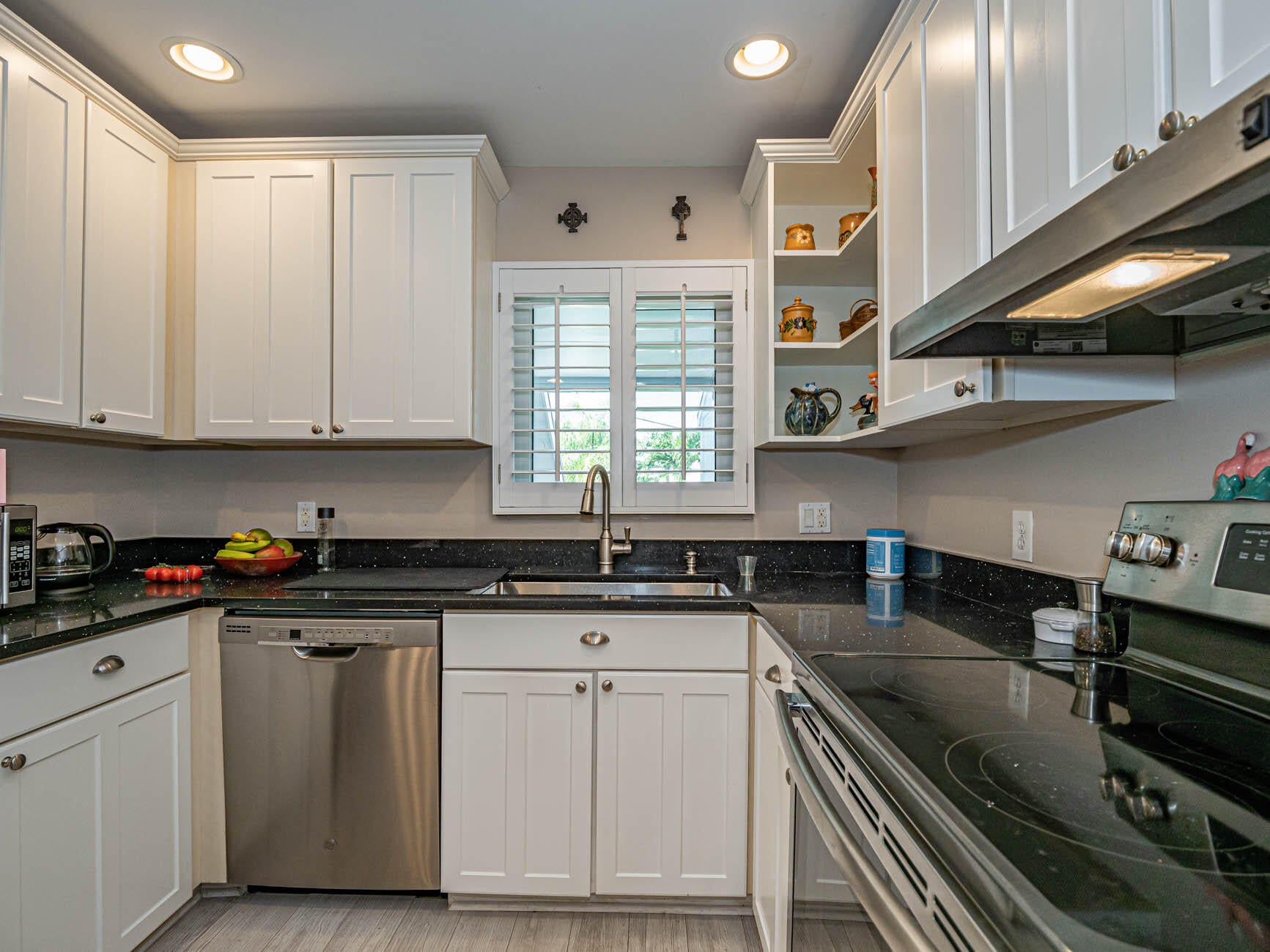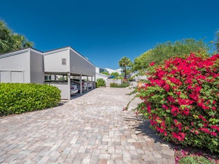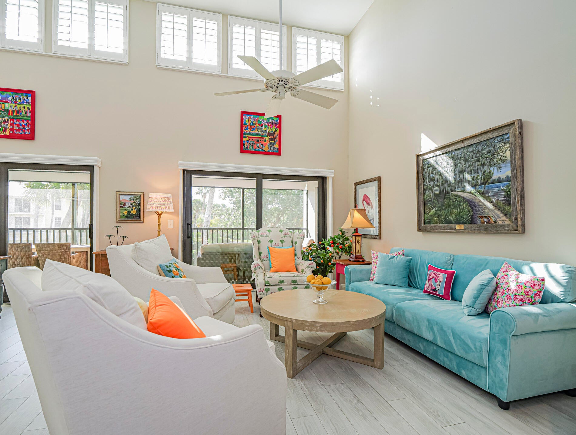 This amazing 2nd floor ranch style home has 2 large bedrooms each with a newer full bath. Completely renovated with newer laminate flooring throughout. Cathedral ceiling in living room, plantation shutters, granite kitchen counters with newer appliances, cozy fireplace for the rare chilly evening in paradise. Full dining room, large porch overlooking green lawn area and delightful cross breeze. Short walk to the beach, all within the Moorings. Tropical decorating - light and airy. A real turnkey. Full sized washer and dryer.
