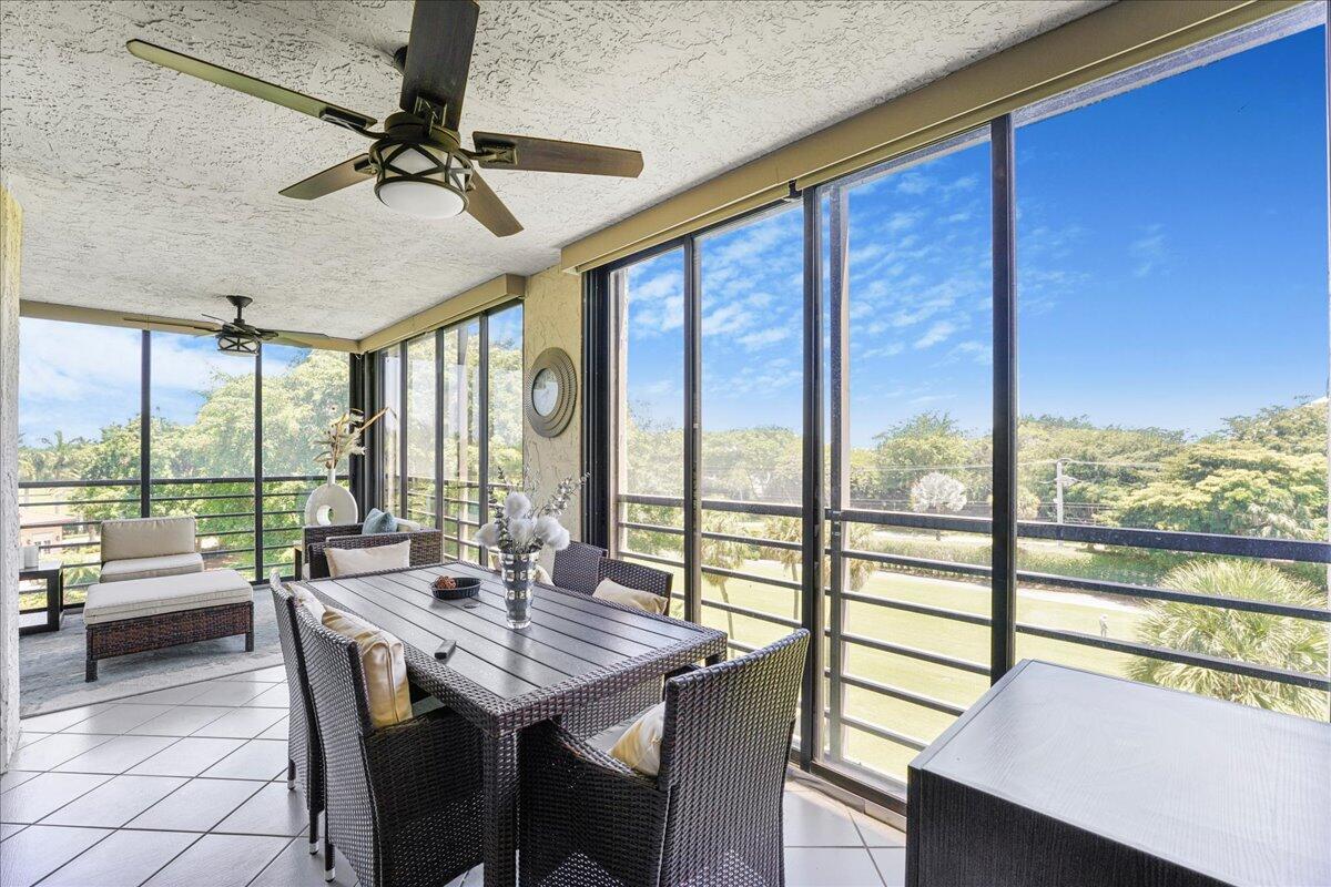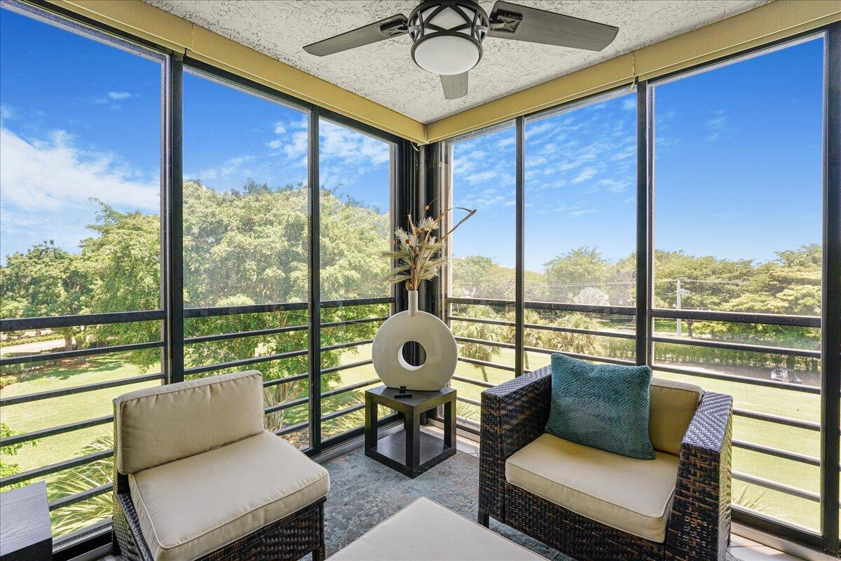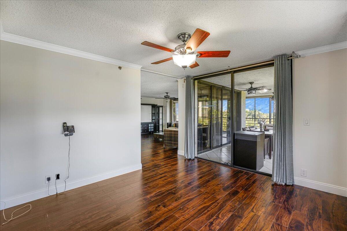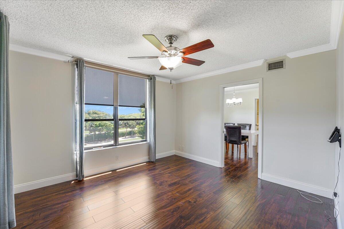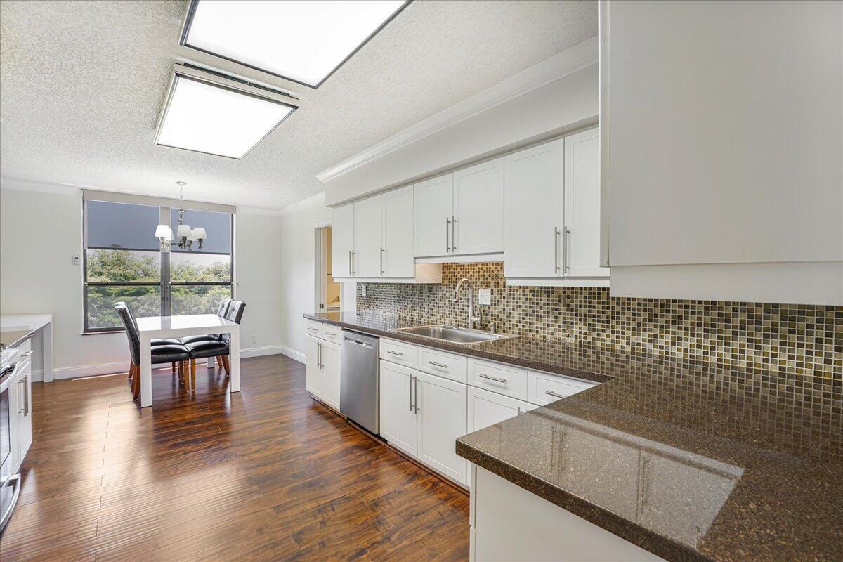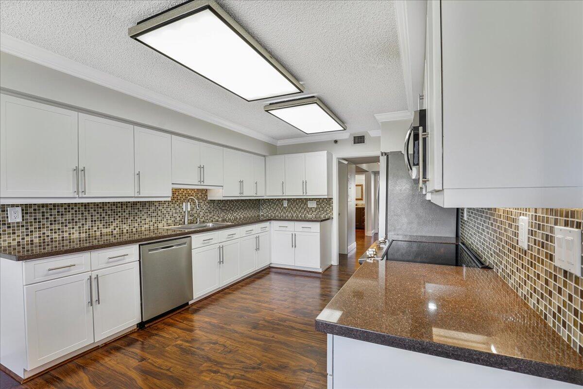 Freshly Painted, Laminate Floors Built-in Bar. Kitchen with white cabinets, granite counters, stainless steel appliances, and glass tile backsplash. Large, enclosed patio with Southeast exposure with electric sunshades. Bedrooms have crown molding. Den can convert into 3rd Bed. Newly updated 2nd & half bath. Large built-in closet.