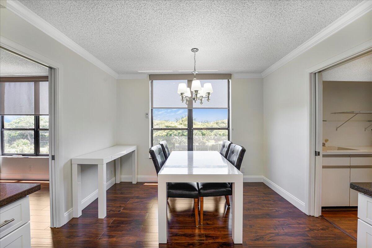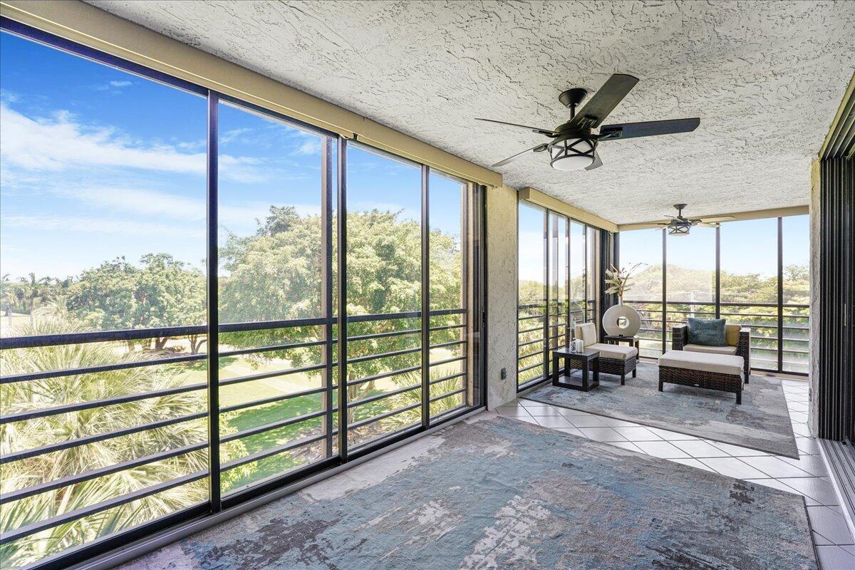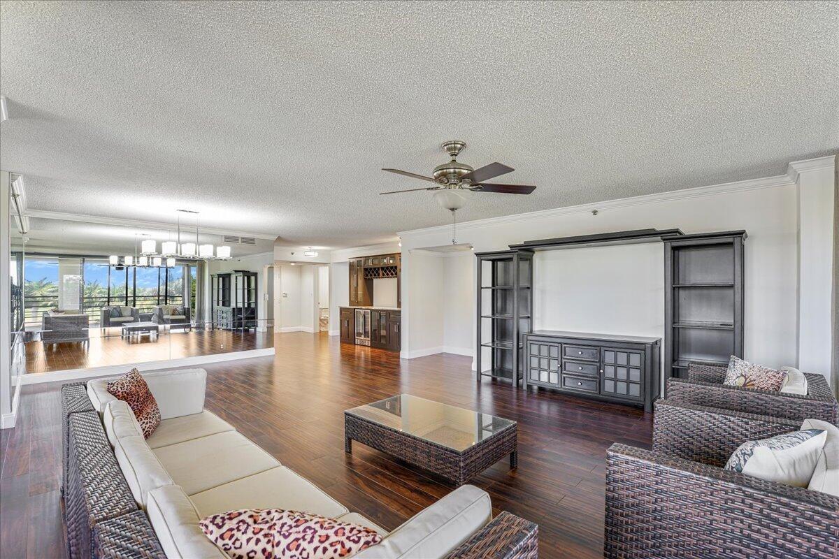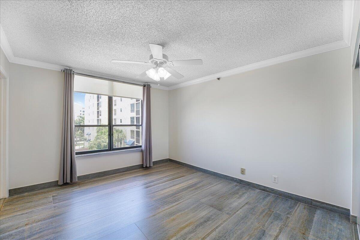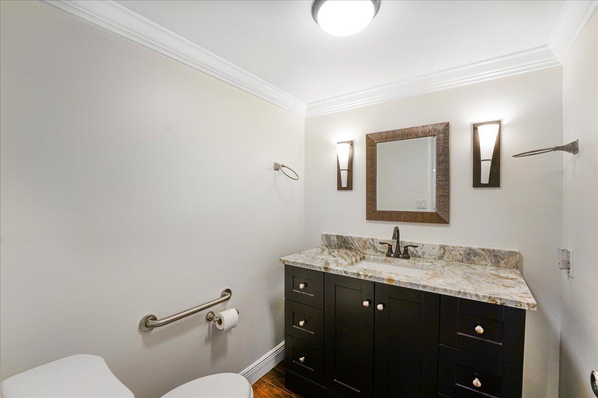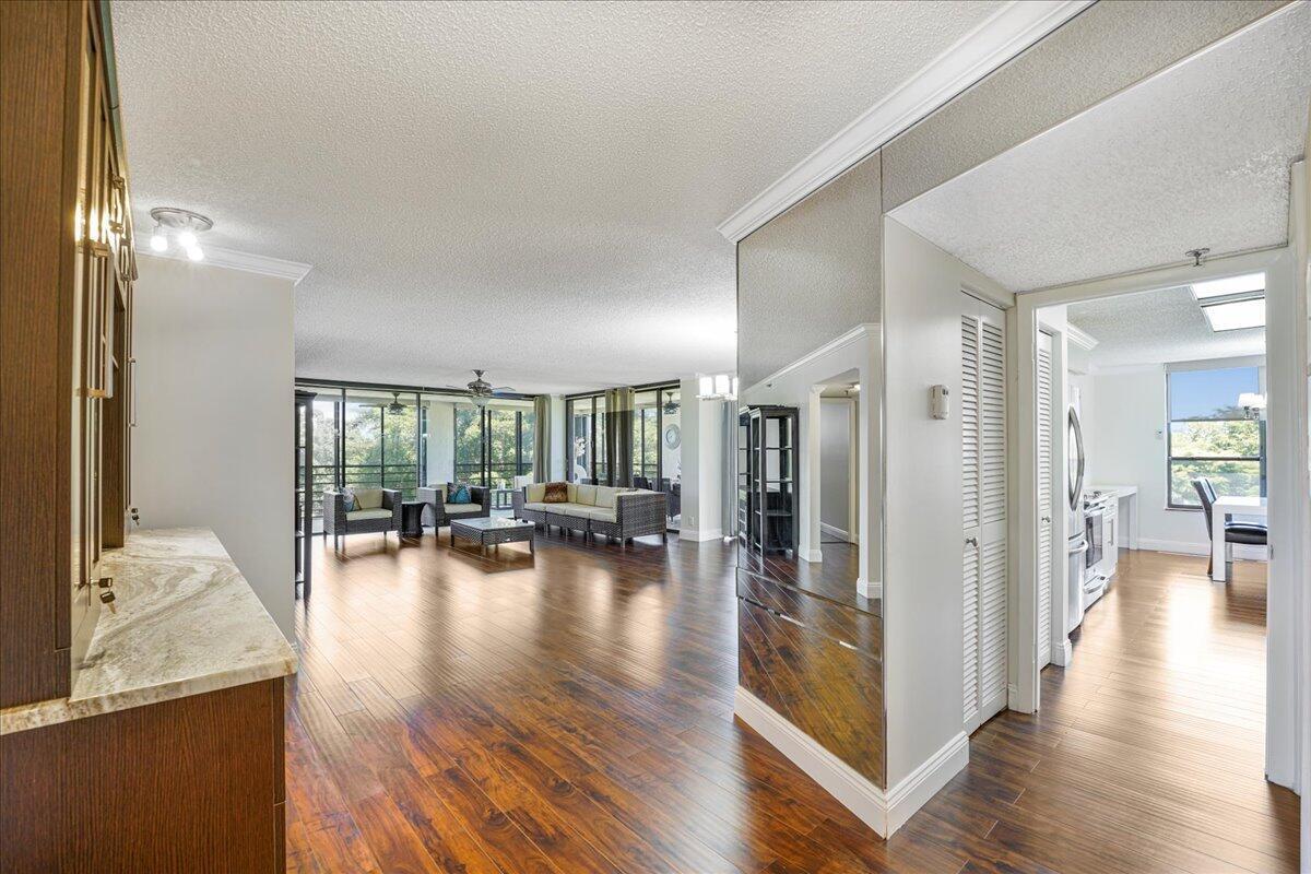 Freshly Painted, Laminate Floors Built-in Bar. Kitchen with white cabinets, granite counters, stainless steel appliances, and glass tile backsplash. Large, enclosed patio with Southeast exposure with electric sunshades. Bedrooms have crown molding. Den can convert into 3rd Bed. Newly updated 2nd & half bath. Large built-in closet.