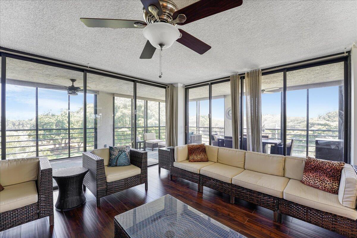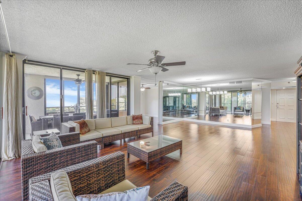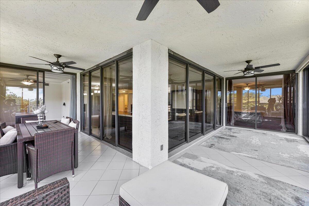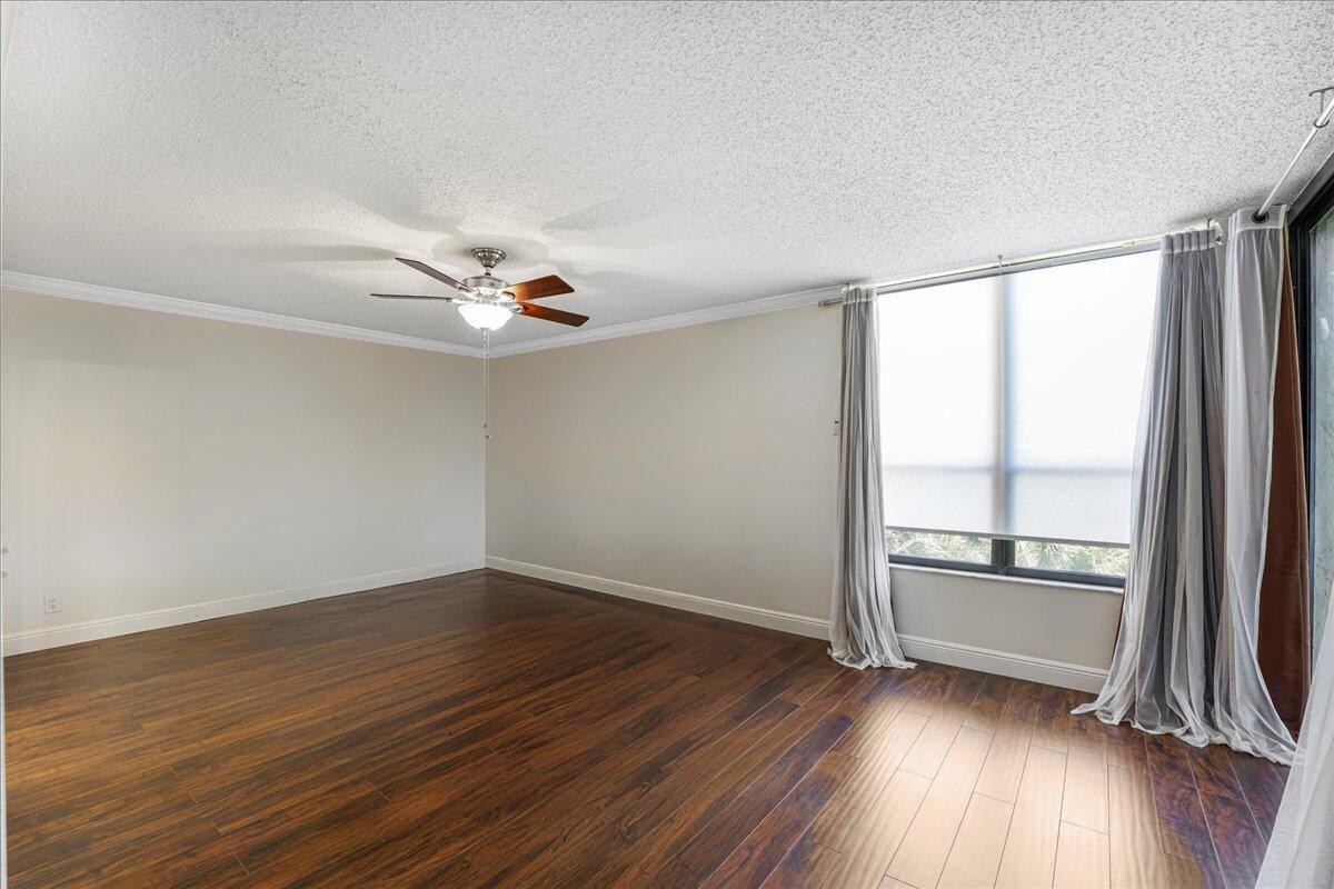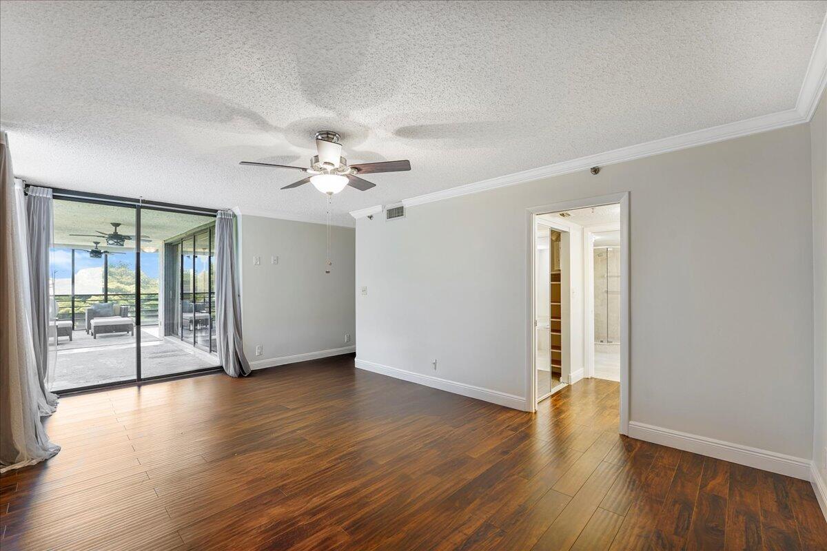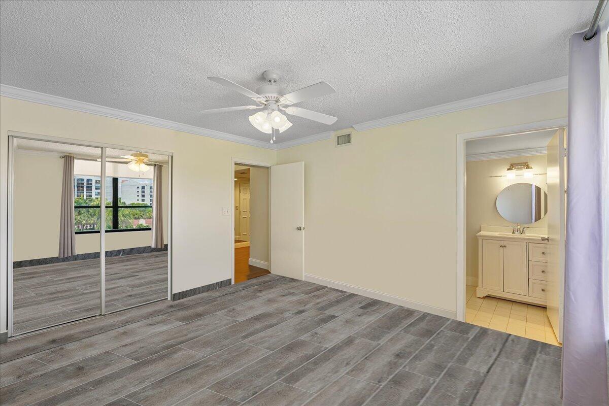 Freshly Painted, Laminate Floors Built-in Bar. Kitchen with white cabinets, granite counters, stainless steel appliances, and glass tile backsplash. Large, enclosed patio with Southeast exposure with electric sunshades. Bedrooms have crown molding. Den can convert into 3rd Bed. Newly updated 2nd & half bath. Large built-in closet.