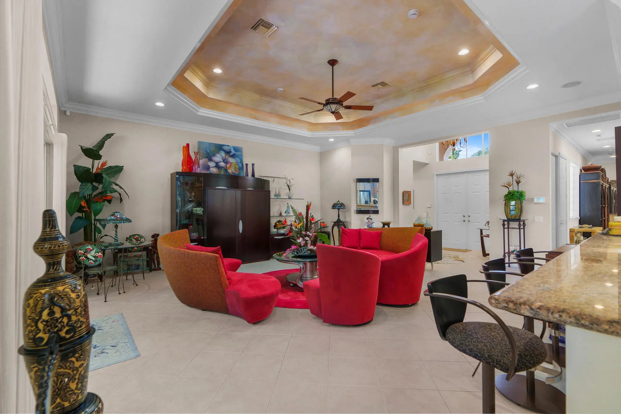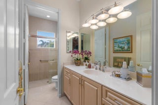 Large 2735 sq ft under air-move in ready, immaculate rarely available 3 bedroom, 2 1/2 bathroom Pamplona model. The double doors lead to a spacious great room, crown molding, tray ceilings. The flow of this home is perfect for entertaining with eat-in kitchen & large dining room, solid wood cabinets, granite countertops, stainless steel appliances. Large primary bedroom with tray ceiling. Primary bath has 2 vanities, separate tub and shower. 55+ Valencia Palms is a very active adult community. Gorgeous clubhouse, fitness center, resort pools, resistance pool, billiard room, cafe, grand ballroom, social events, club, shows, pickle ball, tennis, bocce. Maintenance fee includes cafe, cards, cable, internet, exterior house painting, alarm, lawn and tree care.