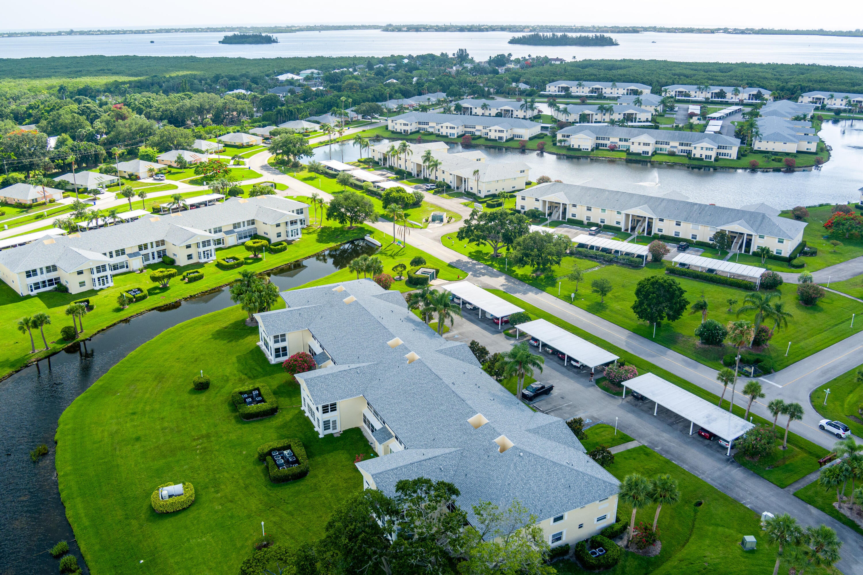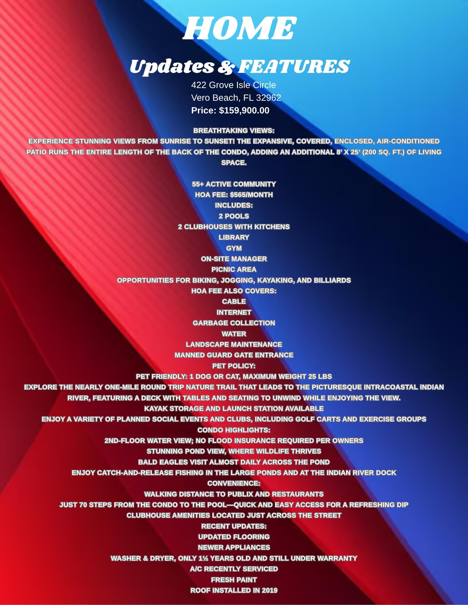 HUGE REDUCTION! NOW $159,900! Best Pond View in the Community! Welcome to this 2nd-floor gem in a vibrant 55+ community where nature, comfort, and convenience meet. Enjoy breathtaking pond views and frequent bald eagle sightings. Cast a line for catch-and-release fishing or relax at the private Indian River deck, perfect for sunrise coffee or sunset reflections.The HOA ($565/month) covers nearly everything--cable, internet, water, garbage, landscaping, guard gate, plus amenities: two pools, two clubhouses, library, gym, picnic areas, biking, jogging, billiards, kayaking, and endless social events. Best of all, you will love the enclosed 8' x 25' panoramic view patio that adds 200 sq ft, bringing your total air-conditioned space to 1,113 sq ft--your sanctuary for sunrise-to-sunset views.Pet friendly (25lb max)! Only 70 steps to the pool and clubhouse. Inside: updated flooring, newer appliances, fresh paint, 1.5-yr washer/dryer (warranty), serviced A/C, and 2019 roof. No flood insurance required (per owner). Walk to Publix and local dining, with beaches close by you have it all, Florida living at its finest!