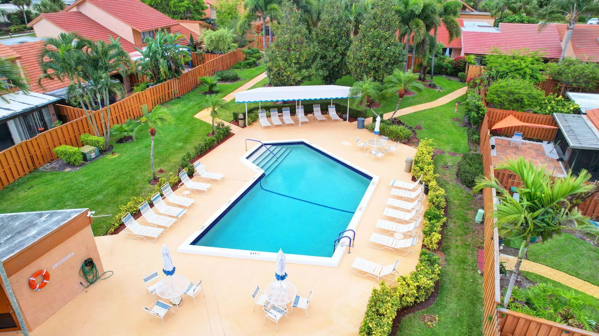 :Welcome Home to this spacious, 3 bed 2.5 bath 2 story townhome with 1-car garage, in well-maintained gated community. Convenient location. Large eat-in-kitchen, Tile throughout 1st floor. Brand new wood laminate flooring on stairs and 2nd floor bedrooms 12/2025. New Impact windows, A/C has been recently serviced and updated, yard cleared and sodded, NEW FENCE. Large outdoor screened/glass patio. Soaring vaulted ceiling in the great room. 1 bedroom on the 1st floor. Primary suite and guest bedroom on the second floor. Plenty of storage space. Very close to area pool. Close proximity to shopping & Restaurant. 24 hour manned security gate.