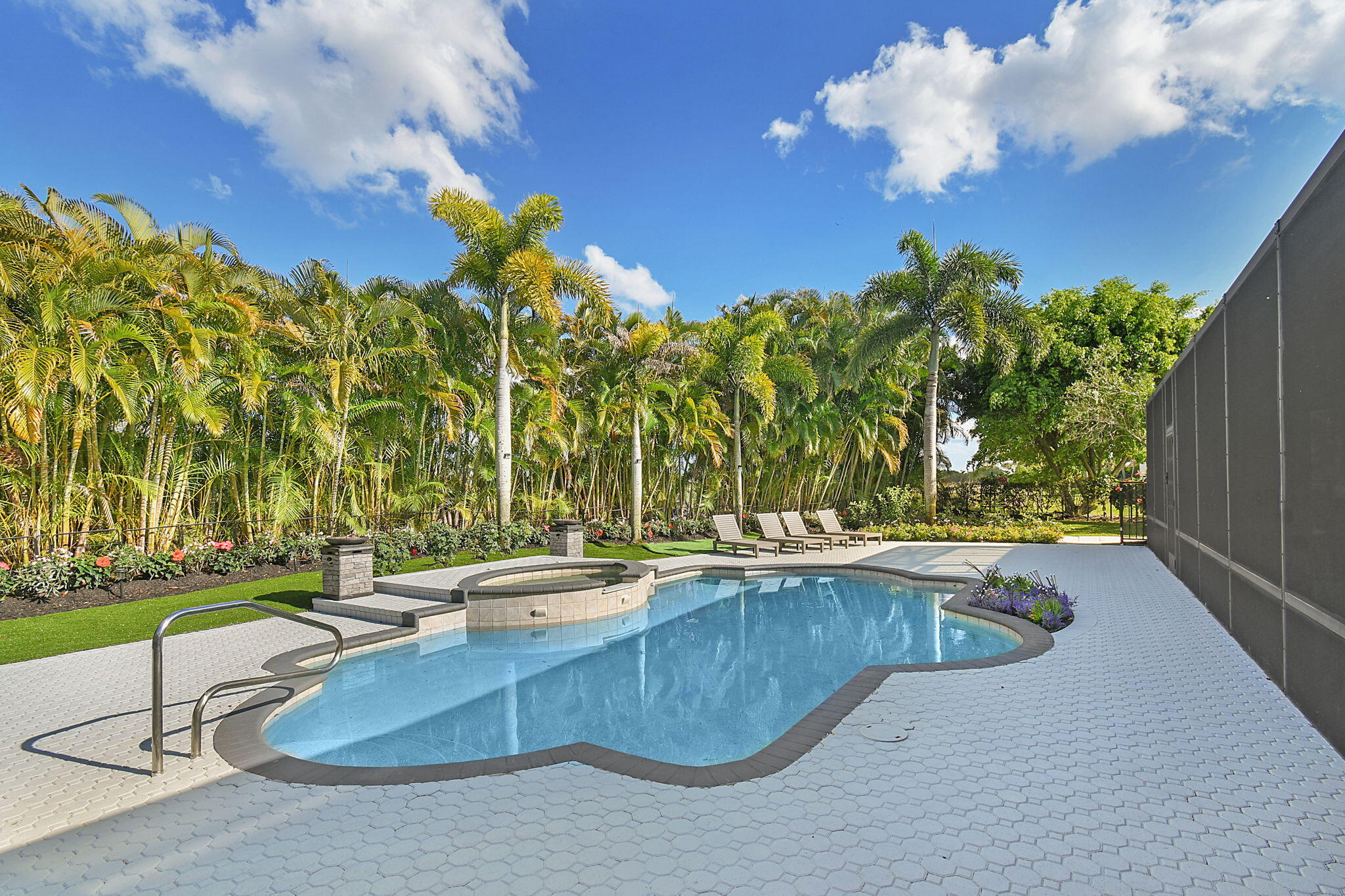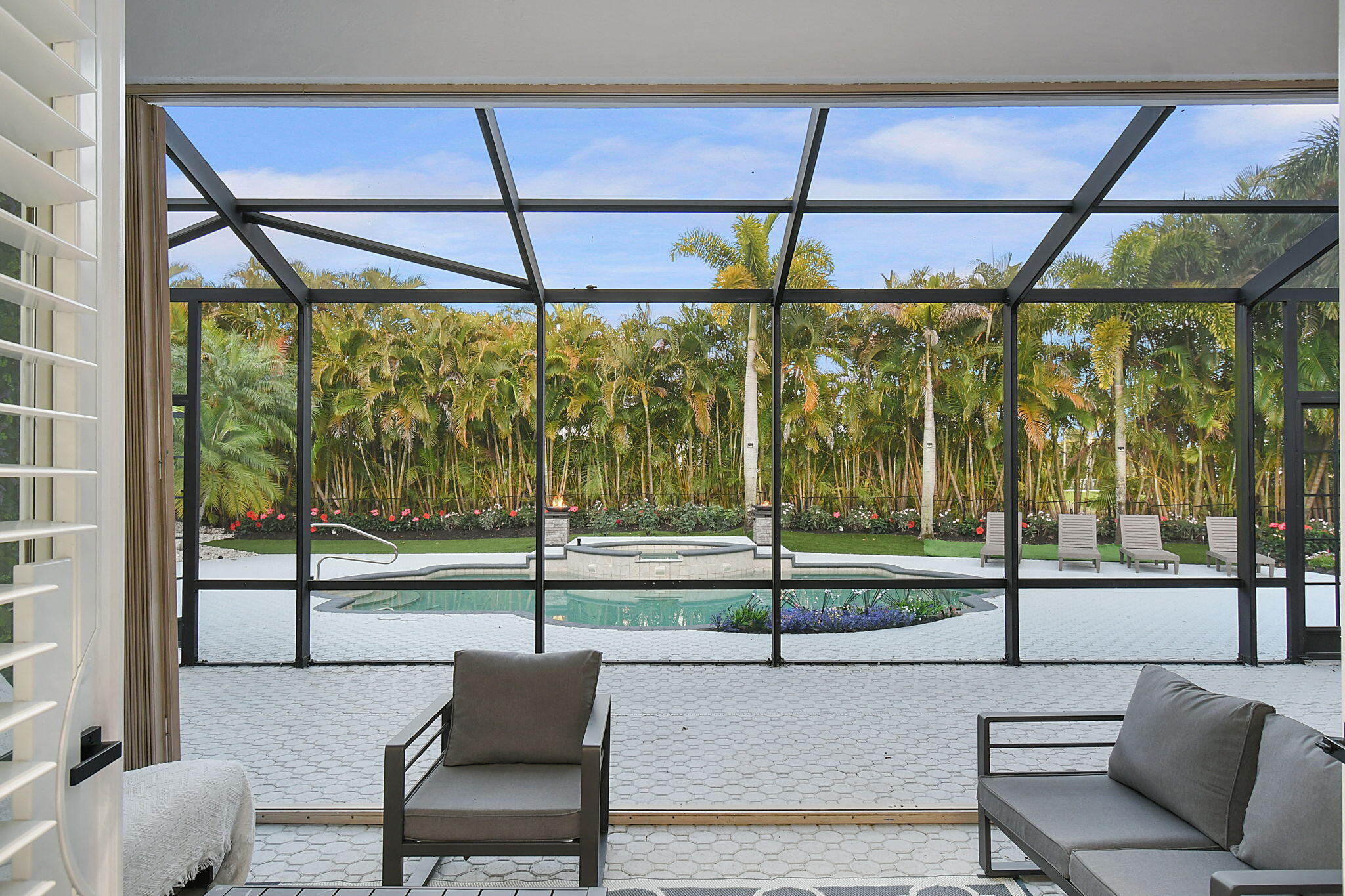 This lovely rmansion, redesigned to be a tranquil retreat, is just a short distance from the horse show. It sits on about 1/2 acre of land, offering privacy and great views of the golf course. With six bedrooms and four bathrooms, the house varies with a modern style and covers 3,352 square feet. The main living areas have stunning pool views, blending indoor and outdoor spaces perfectly. The property also includes a spacious three-car garage with lots of storage space. Everything in the house has been updated, including the roof, appliances, kitchen, flooring, and lighting. Located in a quiet cul-de-sac, this home backs onto the golf course, making it even more peaceful.