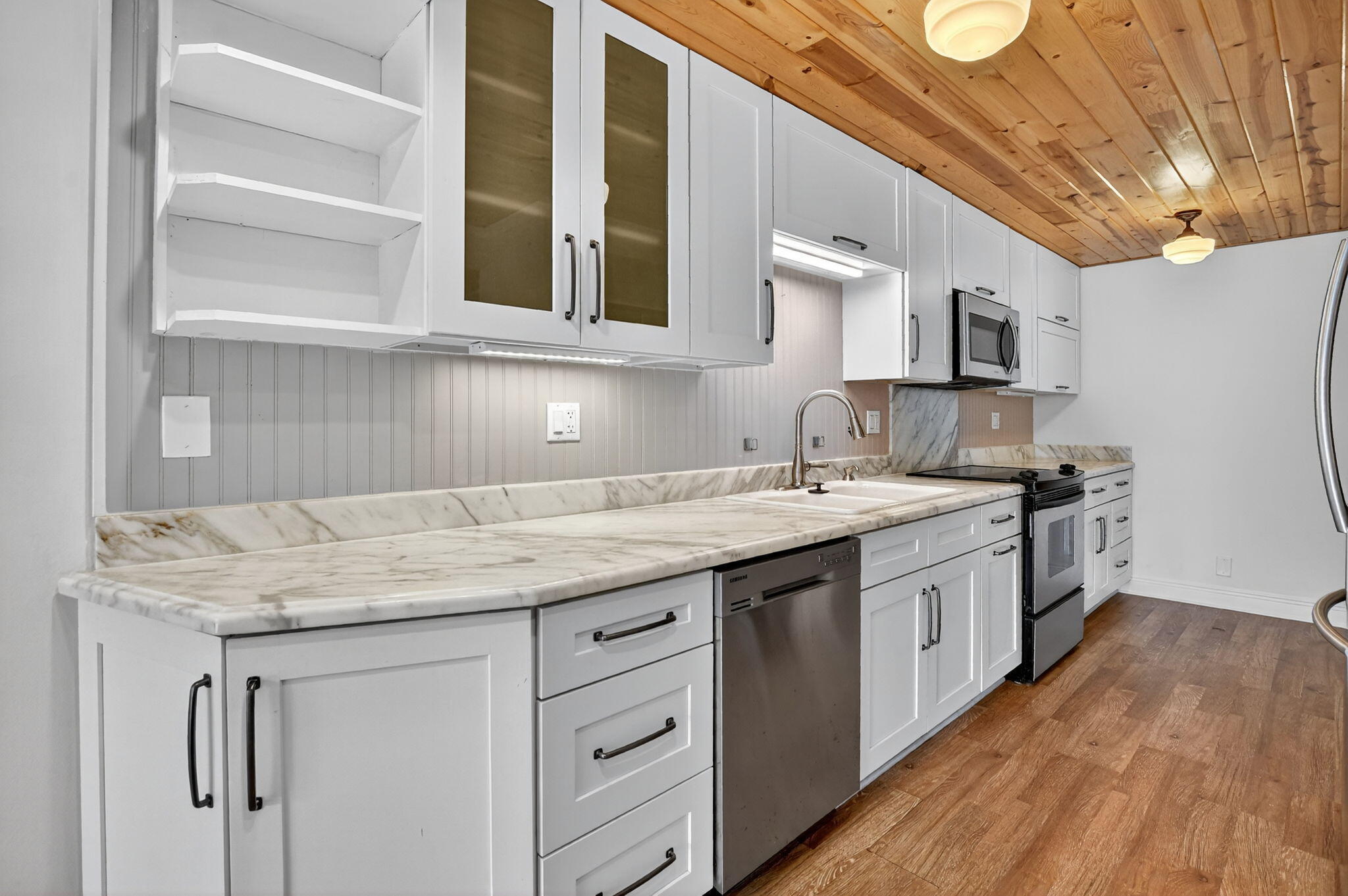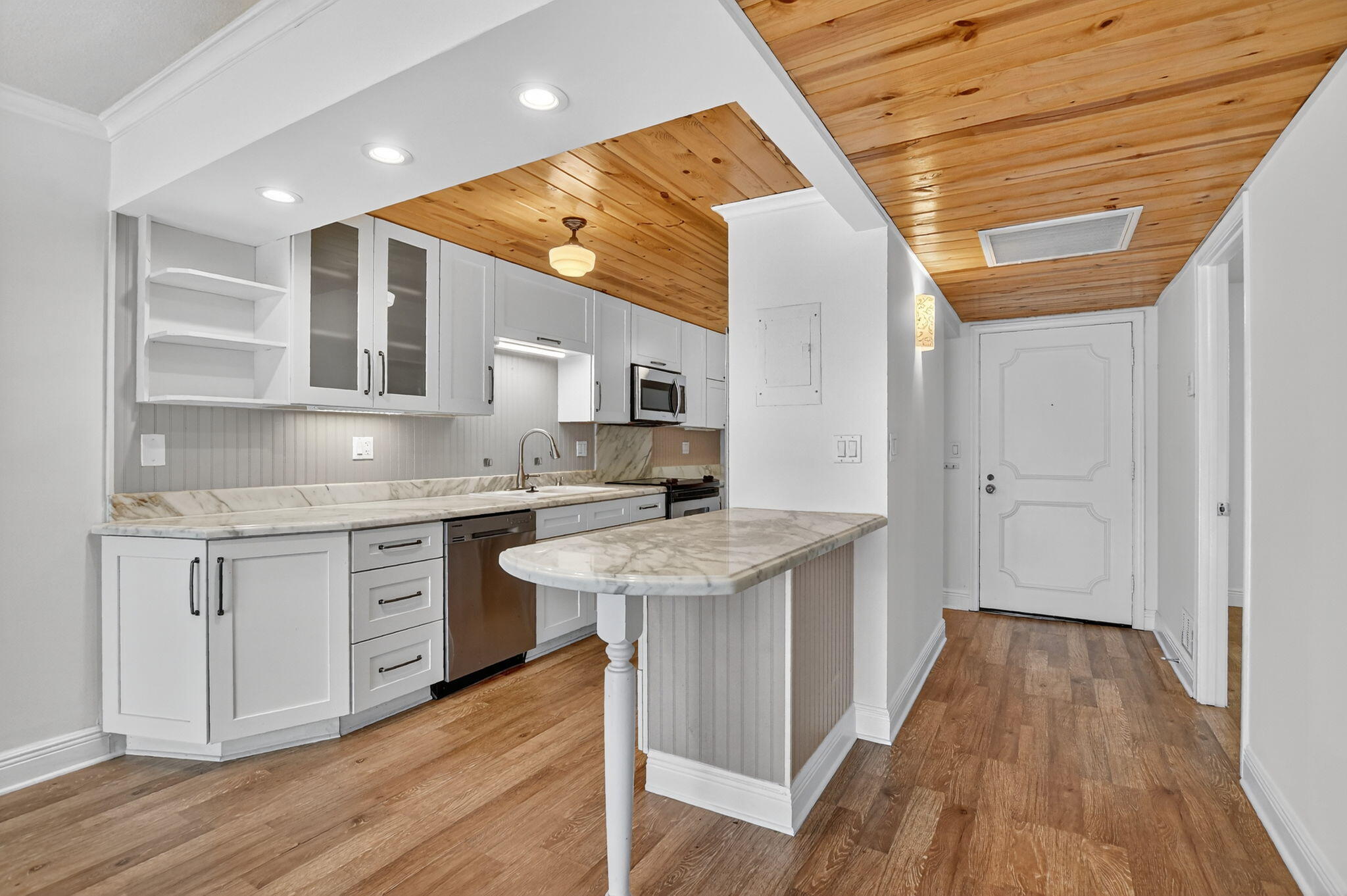 Beautifully updated 2nd floor corner unit with 2 ensuite bed/ baths, freshly painted in soothing gray and white hues. Walk in and see the water from your front door! A modern kitchen awaits with marble counters, white cabinets and SS appliances. All closets have been outfitted with new shelving. Primary suite has new carpeting. Bath has private water closet and marble flooring. Amenities: 24hr manned gate, 5 heated pools, lighted tennis & pickleball, EV charging. Additional storage on site inc. Rent includes water/sewer, cable w/HBO & hot water. Fantastic location, minutes to beaches, parks, and Mizner Parks fabulous shopping and dining