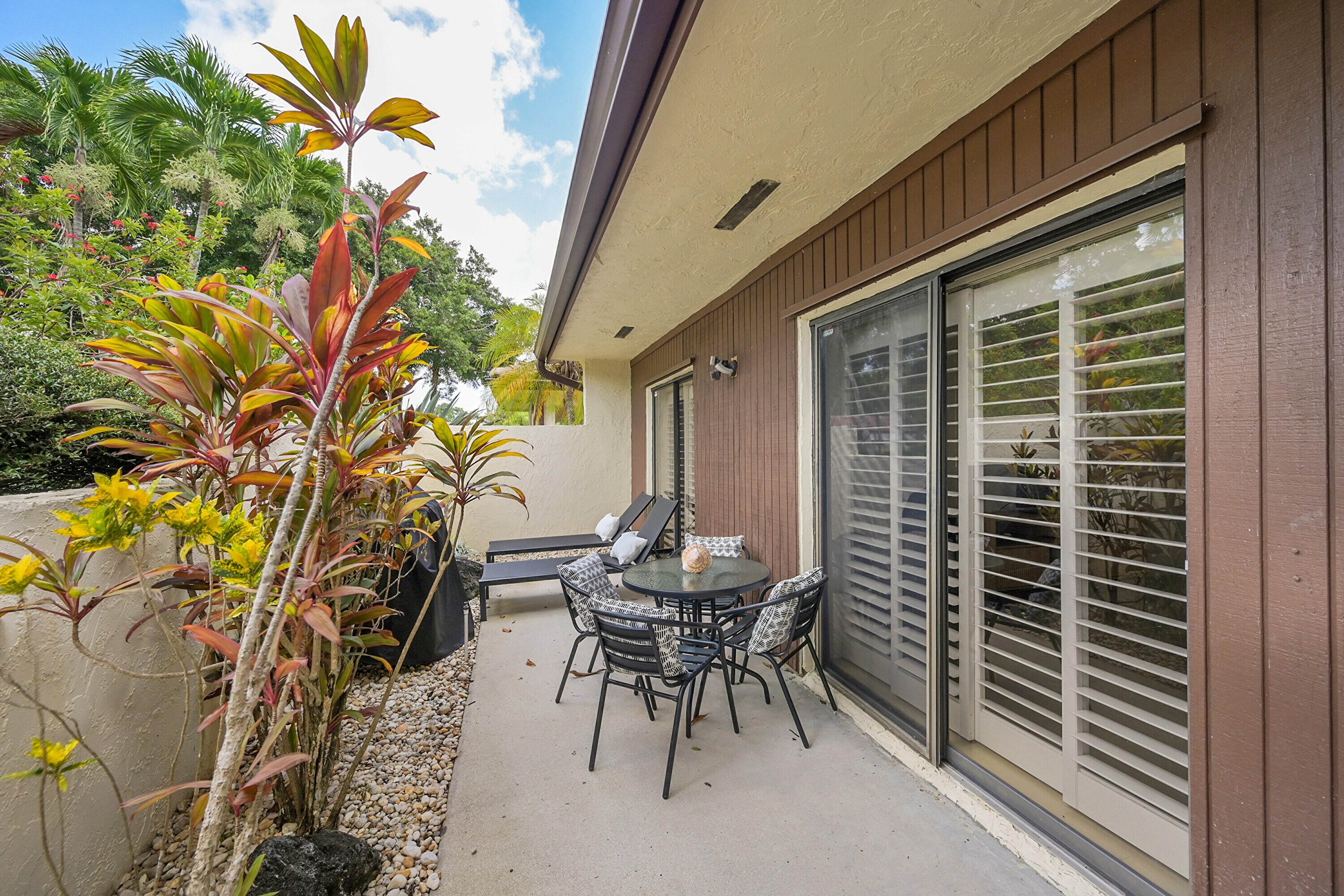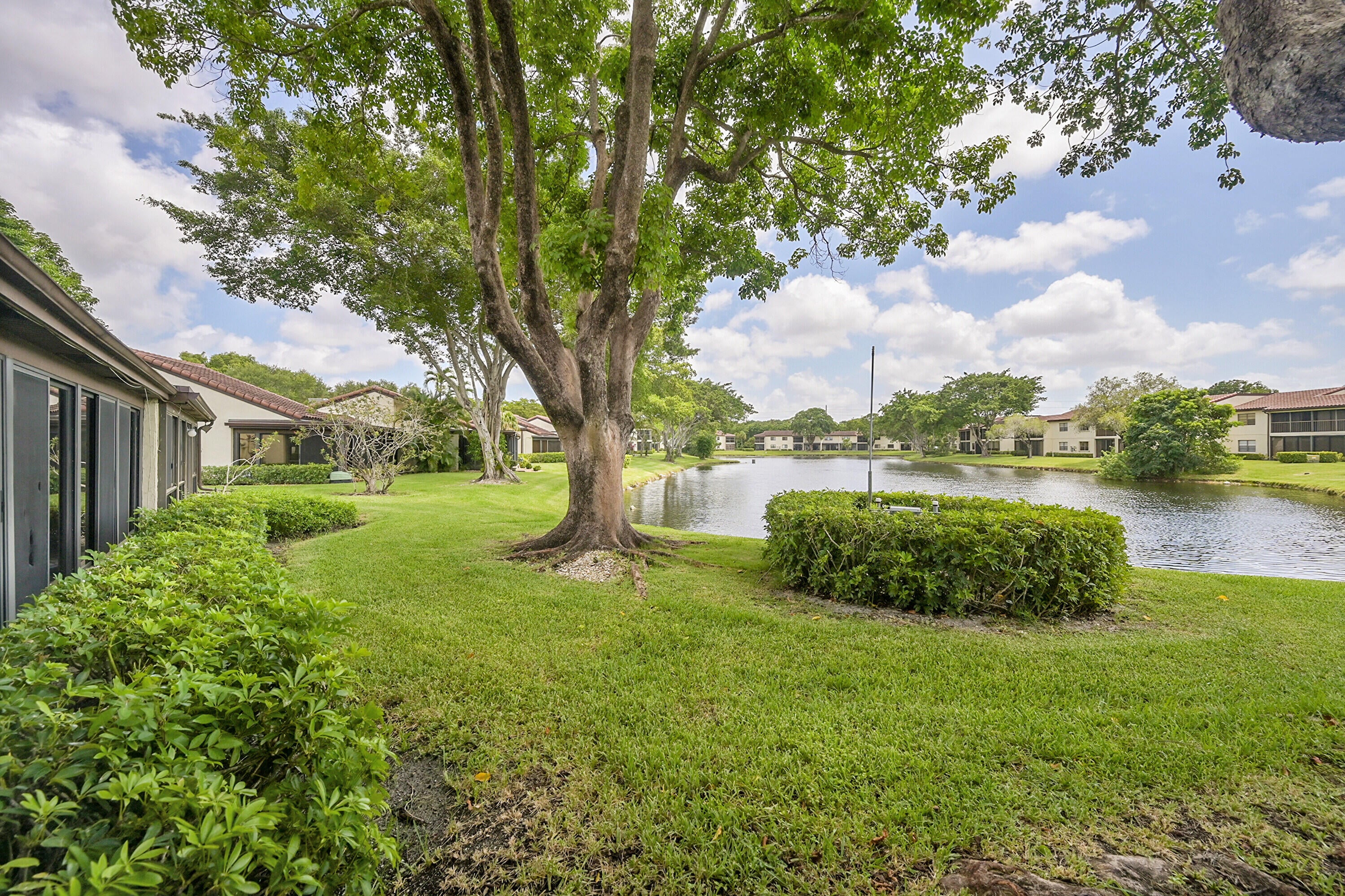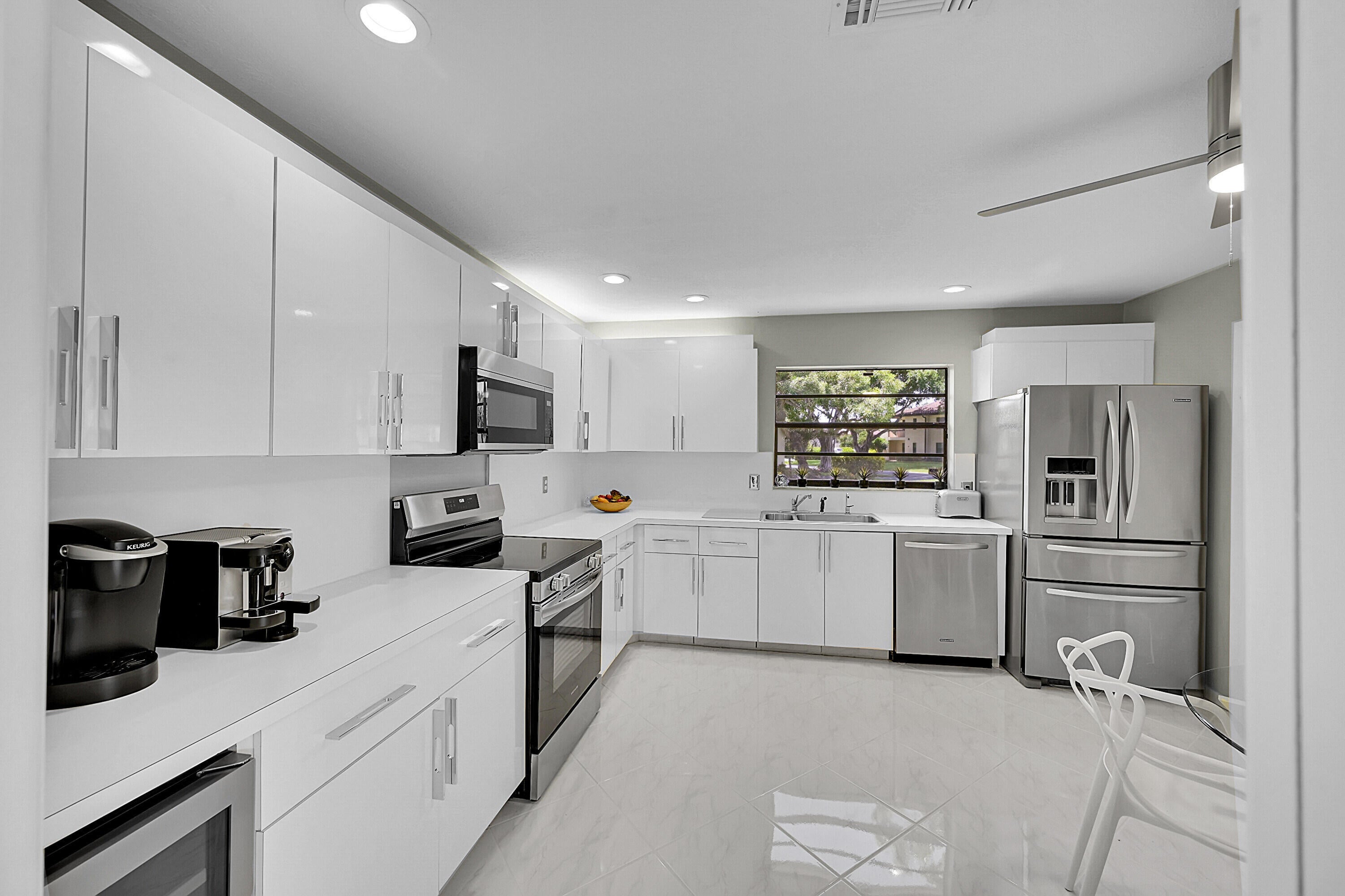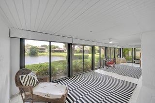 Elegant 3B/R 2 Bath villa. 2500 sq ft of living space. Lake view from a huge glass enclosed patio which can be used for office, 4th bedroom or entertainment space. This corner villa has extended driveway for several cars and a garage Villa is completely tiled with beautiful neutral tile and has been freshly painted and all new fans with remotes. New SS oven and microwave. All SS appliances and a wine cooler. Lots of closet space. Front loading washer and dryer in a big laundry room. Non mandatory club. New roof installed 2023 and has been paid for. Newer AC and hot water heater, Lovely community pool. Guard gate entry.