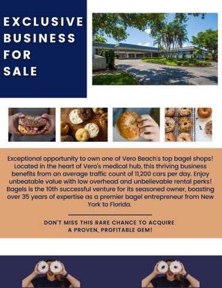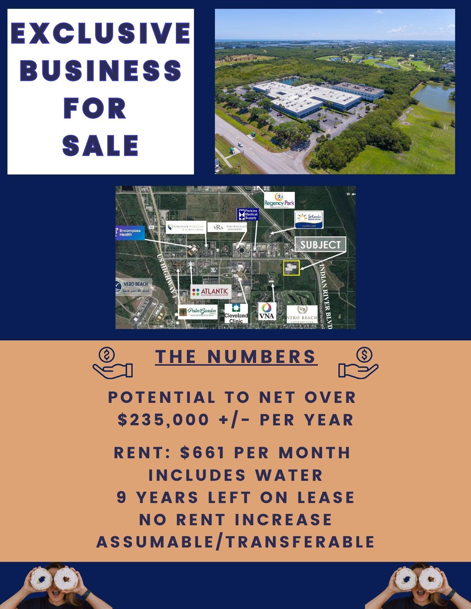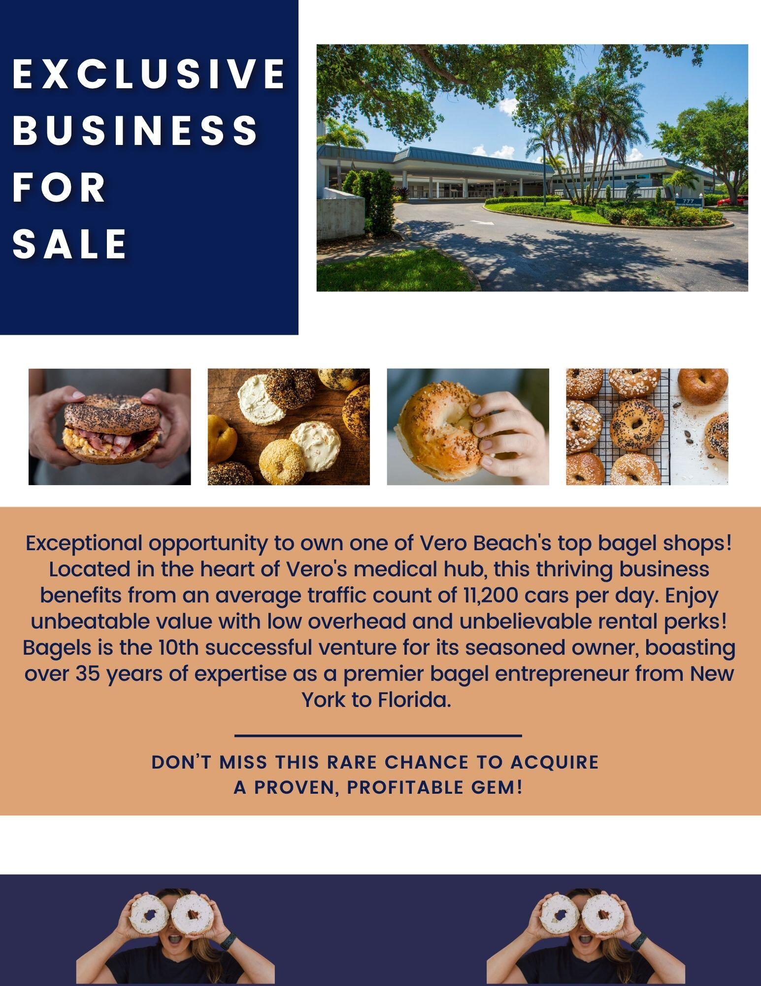 Exceptional opportunity to own one of Vero Beach's top bagel shops! This thriving business is located in a prime location & benefits from an average traffic count of 11,200 cars per day. Enjoy unbeatable value w/low overhead + unbelievable rental perks! 10th successful venture for its seasoned owner, boasting over 35 years of expertise as a premier bagel entrepreneur! CURRENTLY NETTING OVER $235,000 +/- A YEAR! NO franchise fee! Offered completely turnkey w/established & repeat clientele, recipes, & local contracts. New HVAC system w/warranty! Owner will finance. 1 YEAR OF FREE RENT + ALL INVENTORY WITH ACCEPTABLE OFFER. Don't miss this rare chance to acquire a proven, profitable gem!
