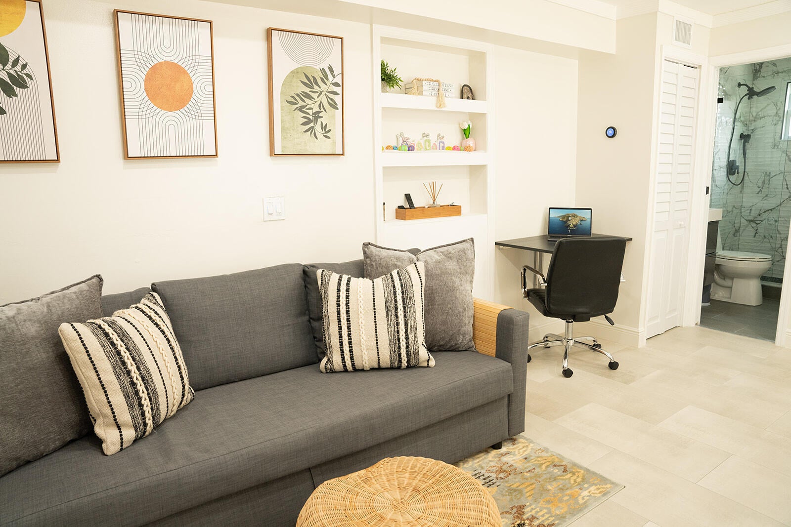 Fully renovated and modern 1-bedroom, 1-bath efficiency located in a quiet neighborhood in the heart of West Palm Beach. This beautifully updated 600 sq ft unit features a private entrance, full kitchen with newer appliances, and a sleek bathroom with a walk-in shower. Enjoy your own private patio and access to a large, fenced backyard--ideal for relaxing or entertaining.The unit is available furnished or unfurnished and includes a dedicated parking space. Rent includes water and electricity. Pets are welcome with approval.Conveniently located just minutes from downtown, I-95, the beach, and Palm Beach International Airport. First, last, and security deposit required. This is the perfect space for someone seeking move in ready setting. Must See!!!