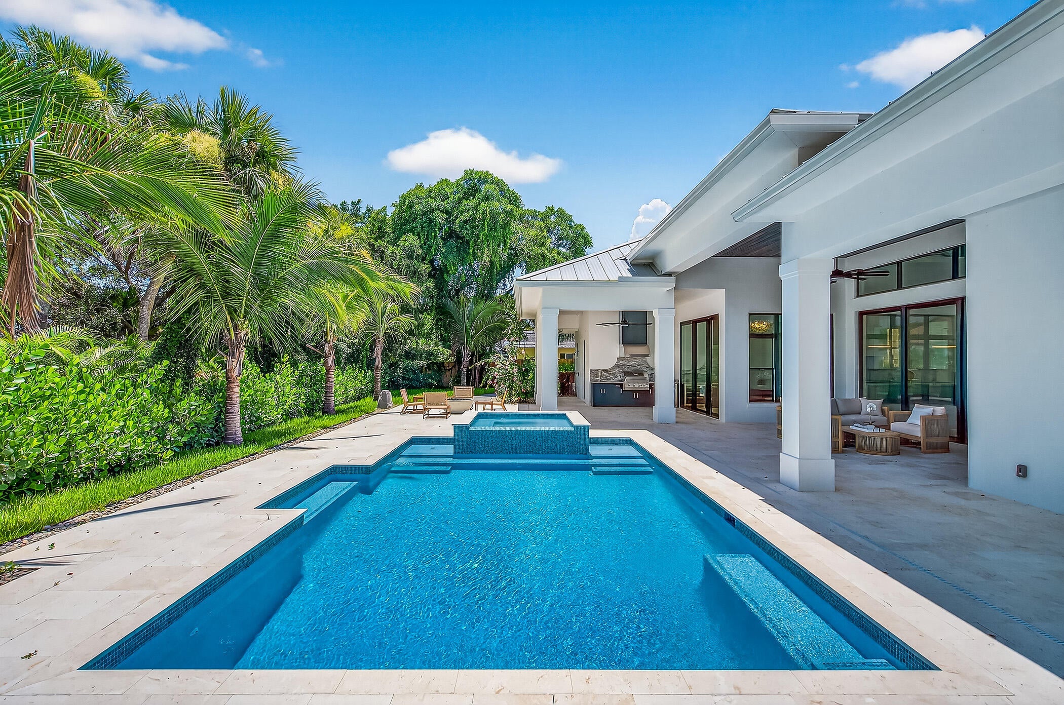 Steps from the shores of the Atlantic, this NEW custom coastal retreat is East of A1A and just (4) lots to the beach. This light-filled 3-bedroom, 3.5-bath home celebrates both luxury and livability, featuring soaring ceilings, an open-concept kitchen, den/office, and refined interiors. A vast center island anchors the kitchen, complete with Thermador appliances, custom cabinetry, a prep kitchen, and a pantry. Unwind in the spacious primary suite with custom closets and a luxurious, tranquil bath. Enjoy Florida living with a resort-style pool, spa, a large loggia, and an outdoor kitchen.