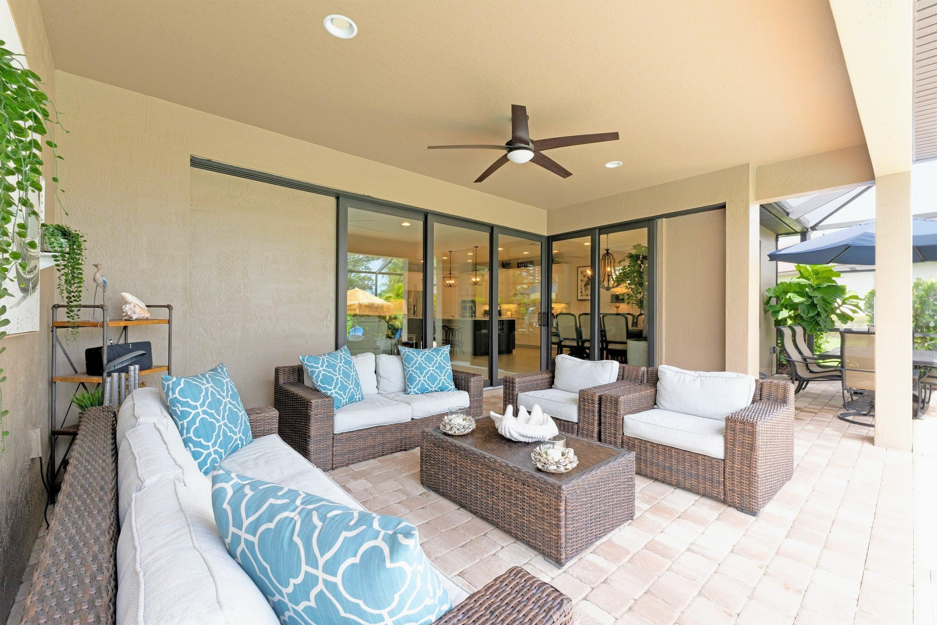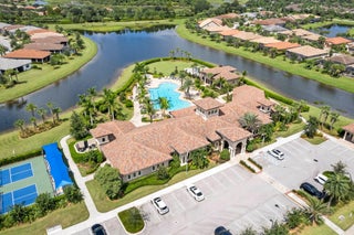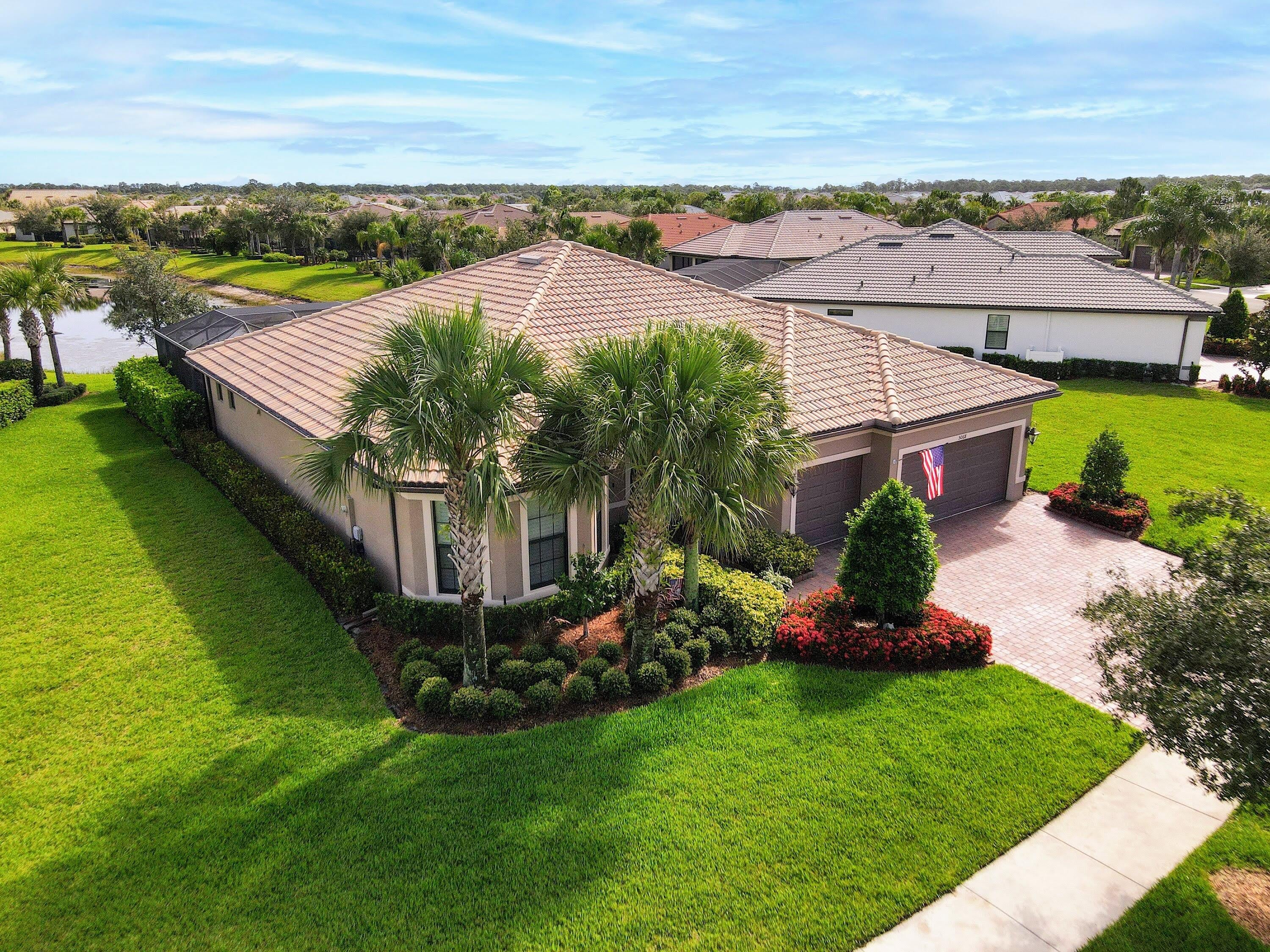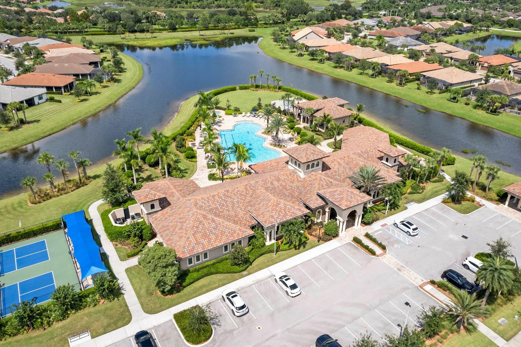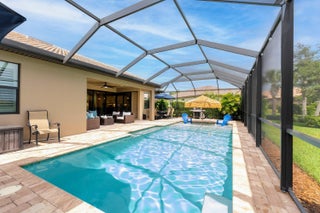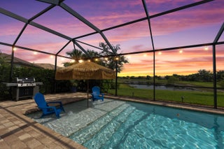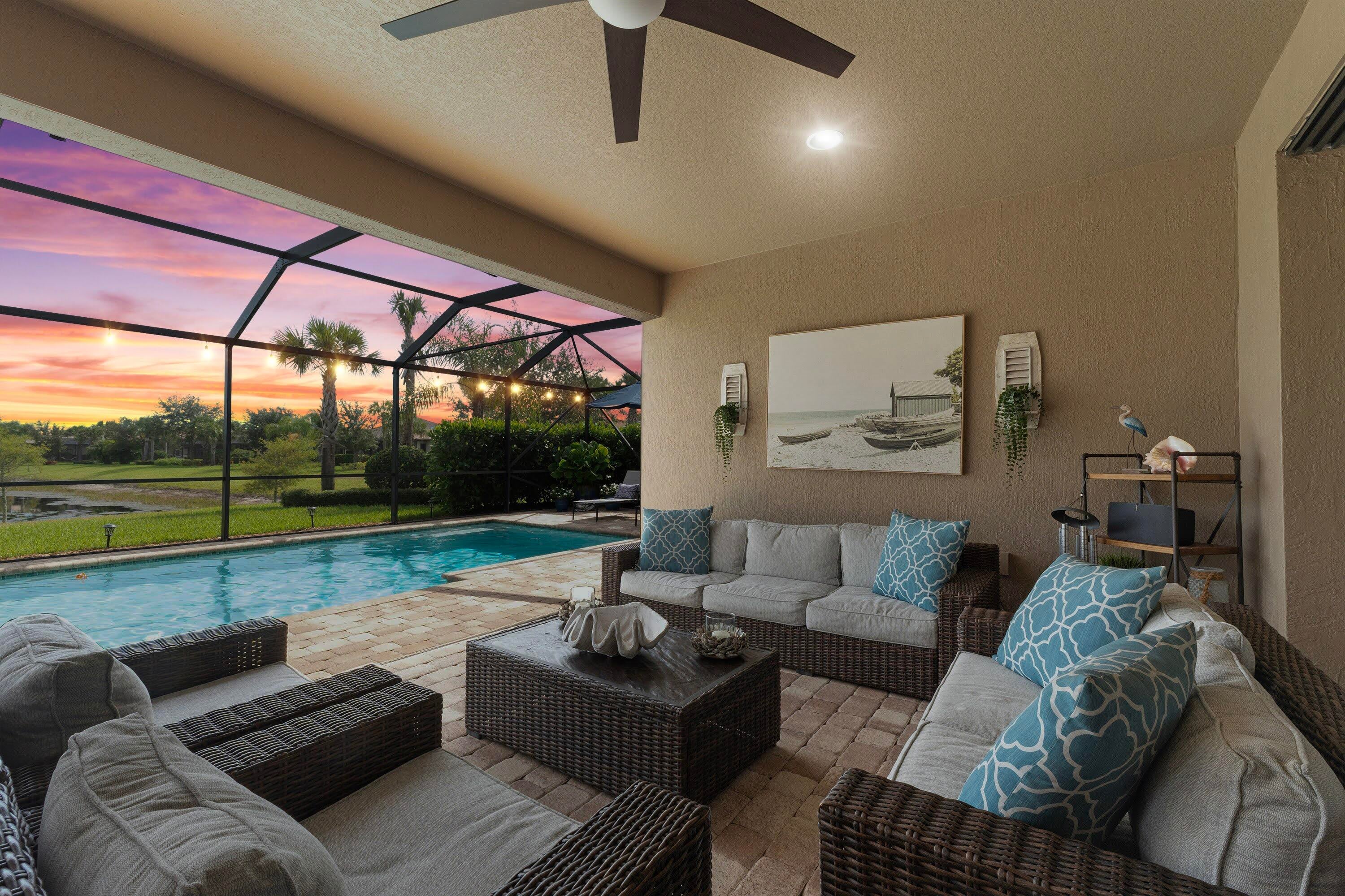 Beautifully appointed and maintained 2017 Pinnacle model with long lake view in sought after Lakes at Waterway Village. Impact glass throughout. This 3/3 plus den offers a generous 2476 SF of under air living space. Substantial upgrades and features - see feature slide in photos. Seamless Florida indoor/outdoor living is accessed via zero-corner patio doors to screened salt water pool and covered lanai entertaining area. Gated community offers resort amenities - active social calendar - Clubhouse, Kitchen, Barefoot Bar, Pool w/lap lanes, Spa, Gym, Studio, Tennis courts, Bocce & Pickleball