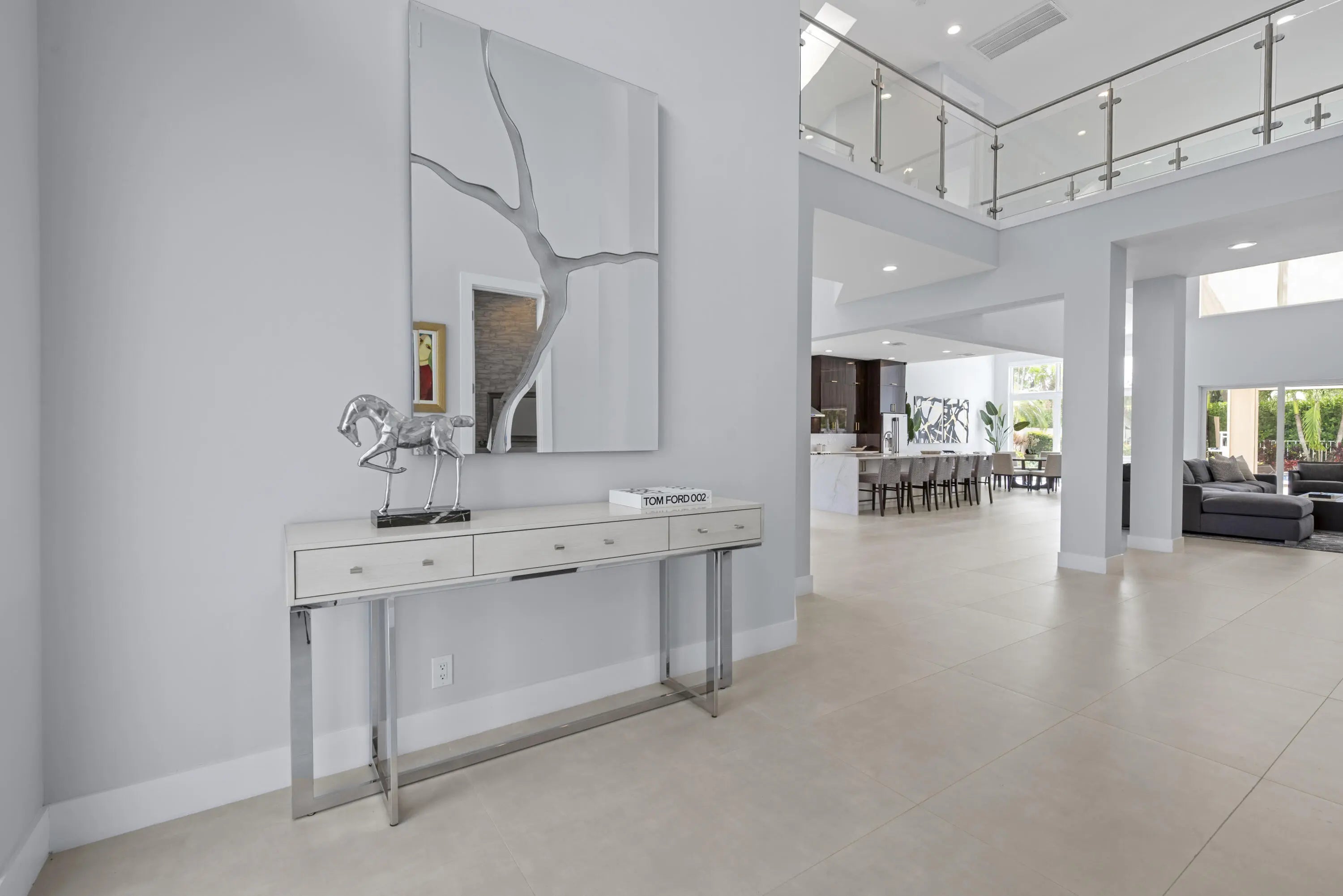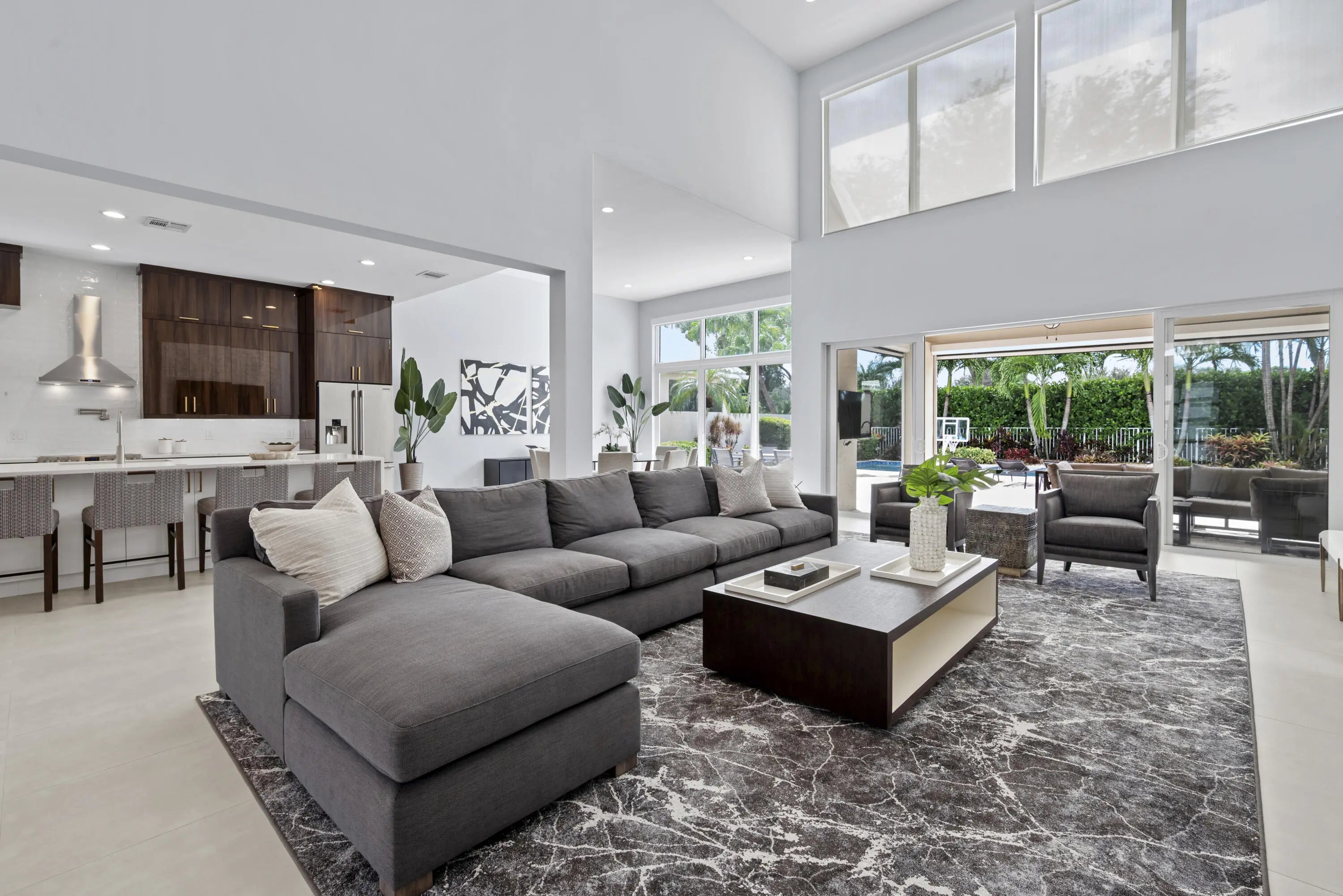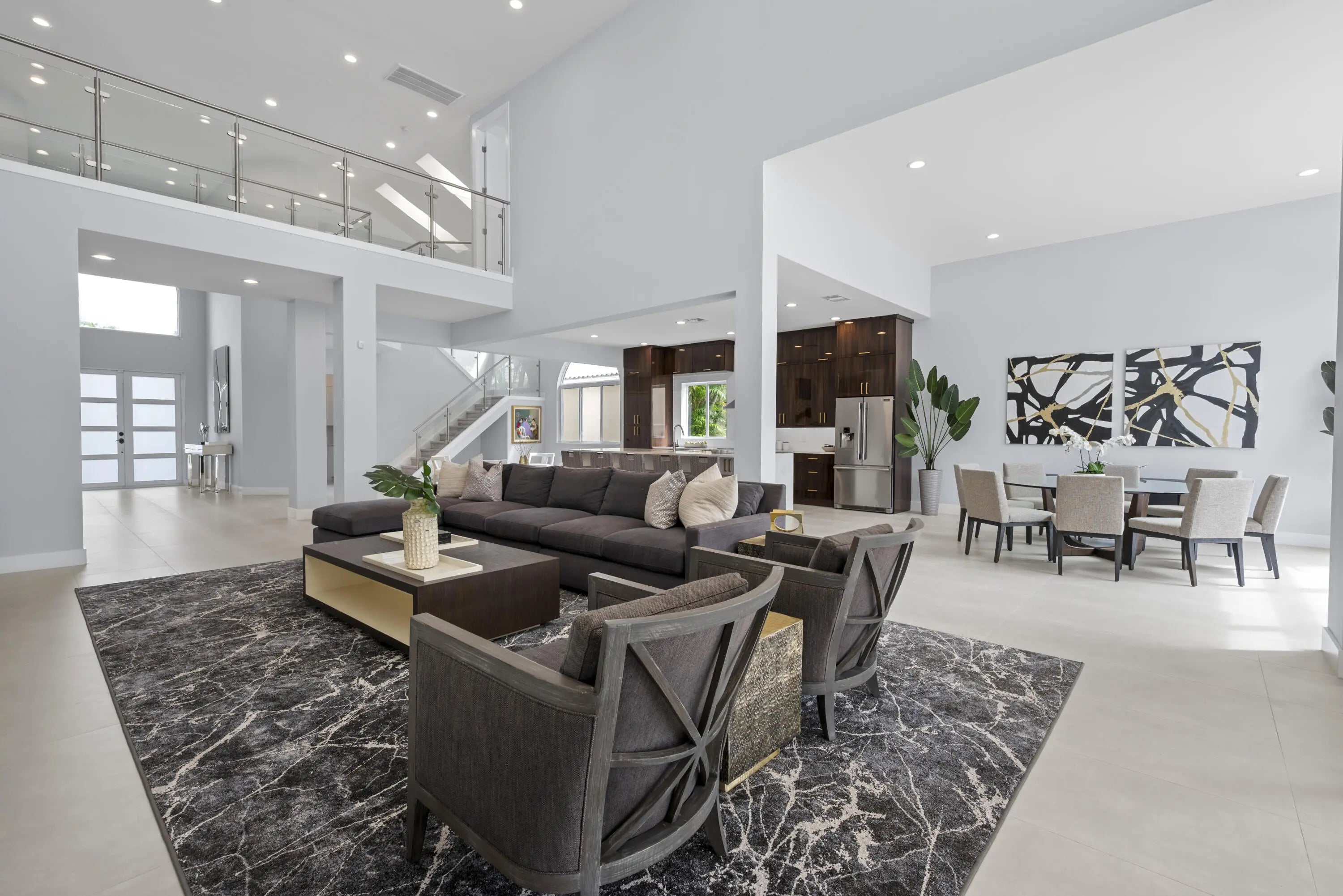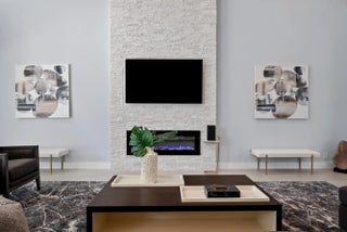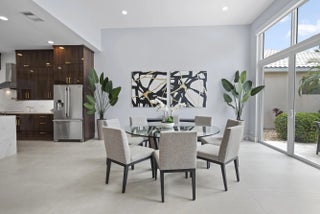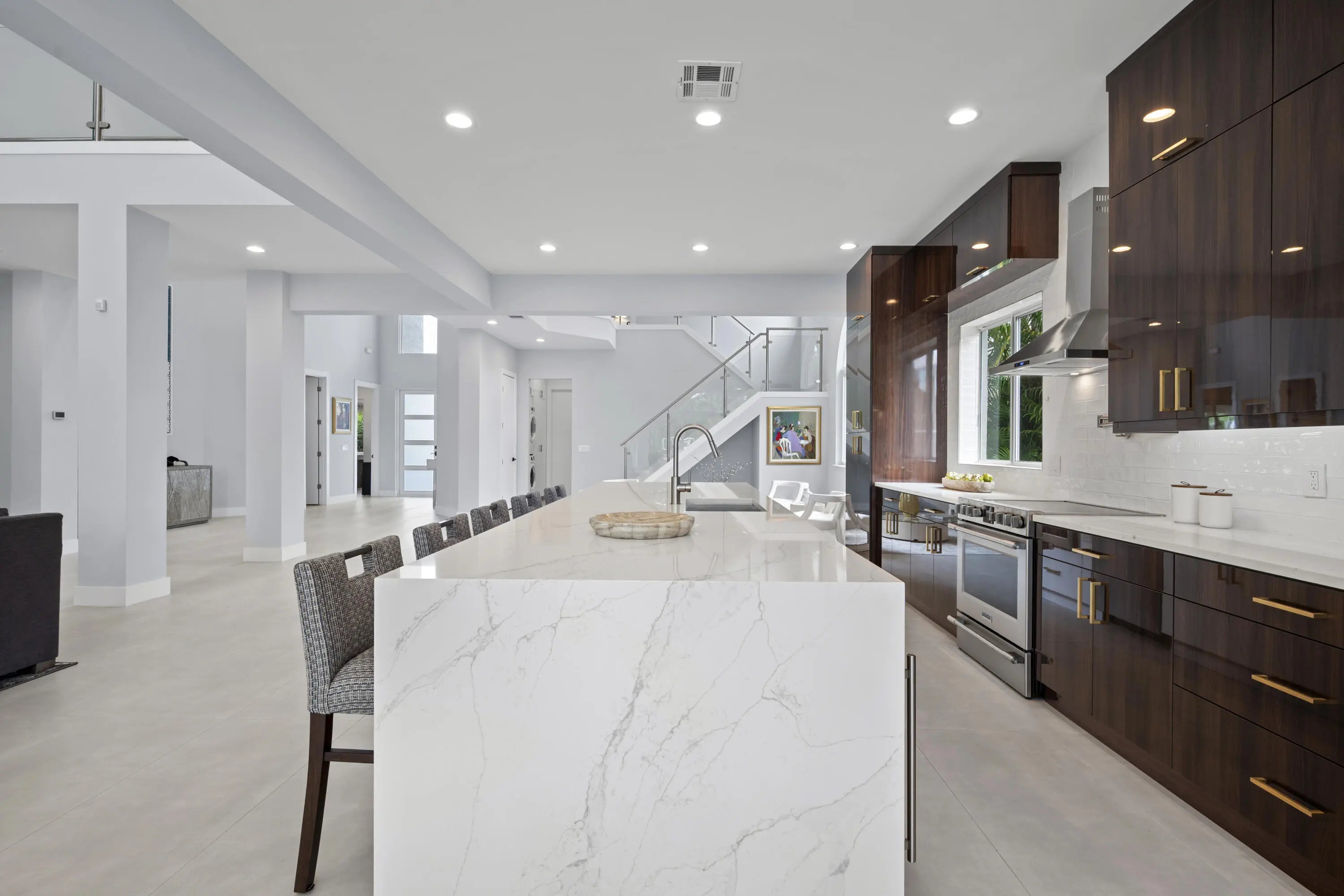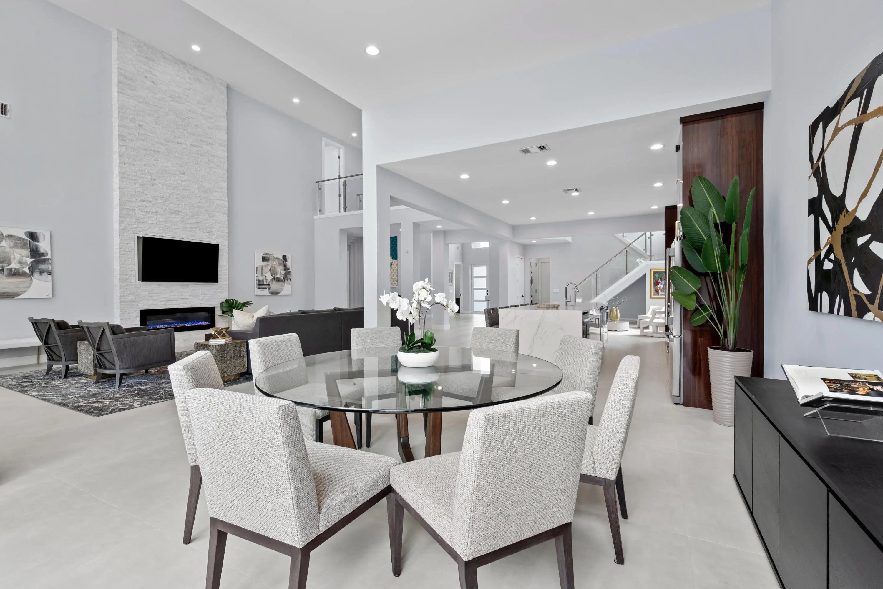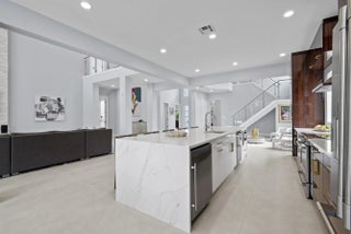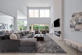 Step into this exquisitely renovated home, where modern design meets comfort and functionality. As you enter, you're welcomed by soaring ceilings and expansive windows that flood the space with natural light, creating a bright and inviting atmosphere. The open-concept layout seamlessly blends elegance and practicality, offering an ideal everyday living and entertaining setting. The spacious living room, perfect for gathering with family and friends, features a striking fireplace and flows effortlessly into the breathtaking chef's kitchen. This culinary haven boasts sleek, custom cabinetry, an oversized island with ample seating, and high-end Frigidaire appliances. The kitchen also offers a casual eat-in area and a formal dining space, catering to any occasion. The luxurious primary suite