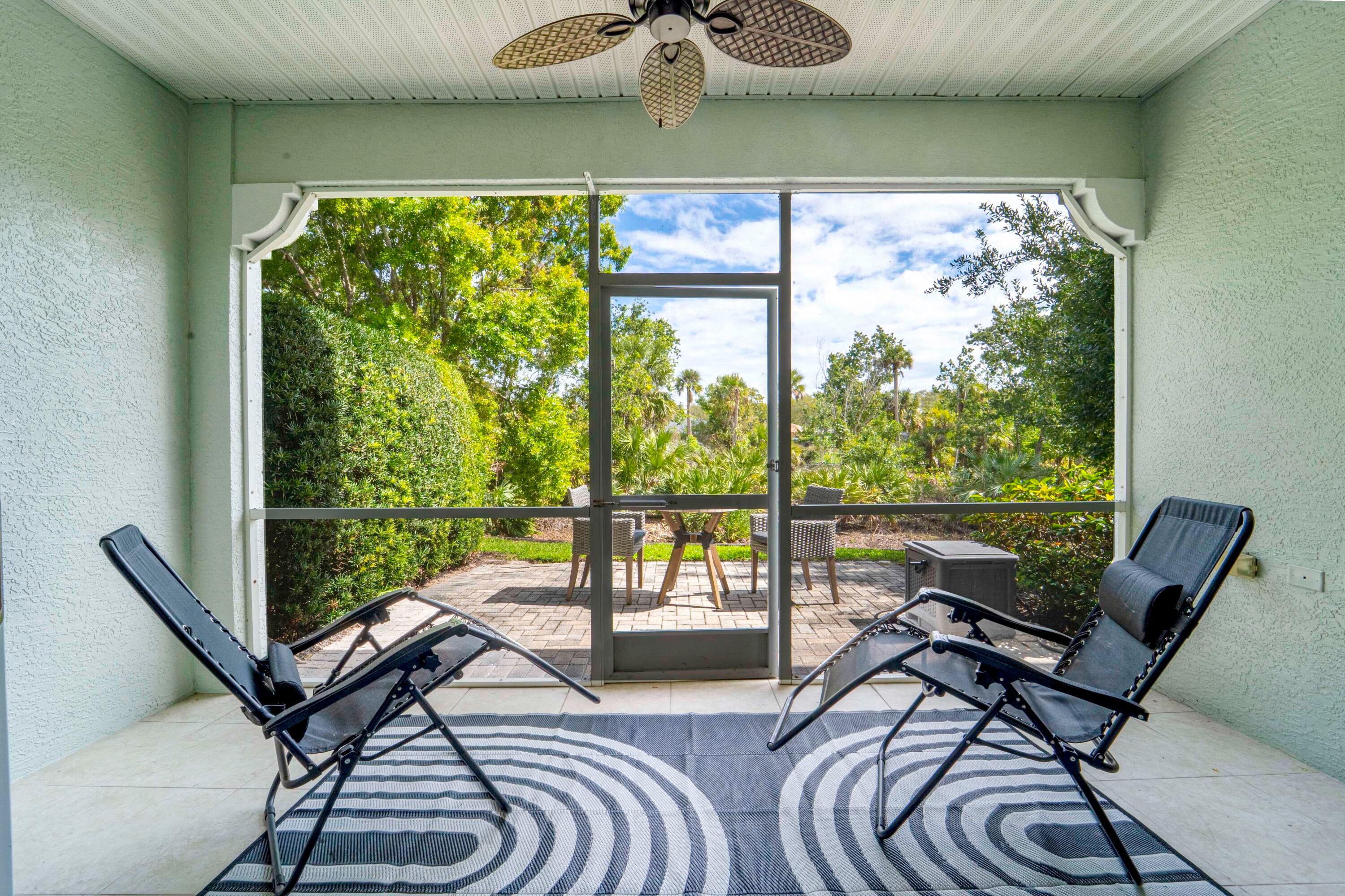 Desirable First Floor Unit! Completely remodeled w/ open floor plan & high ceilings located in the GATED ''Oak Hammock'' side of the exclusive Golf community, Indian River Club. This lovely home has 2 BR 2 BA plus a 3rd BR or Den/Office and a one car Garage. Wood-look flooring throughout, stunning kitchen, stainless steel appliances and marble counter tops. The elevated section of the counter opens to the large living room & beyond that is a Screened Patio overlooking a private Nature Preserve.The Master Bedroom Suite features wood plantation shutters, large walk-in closet & separate tub and walk-in shower plus a double sink vanity. Fully furnished with High End furniture and quality wall art. Hurricane Impact windows throughout! Pickleball courts, heated pool & fitness center.