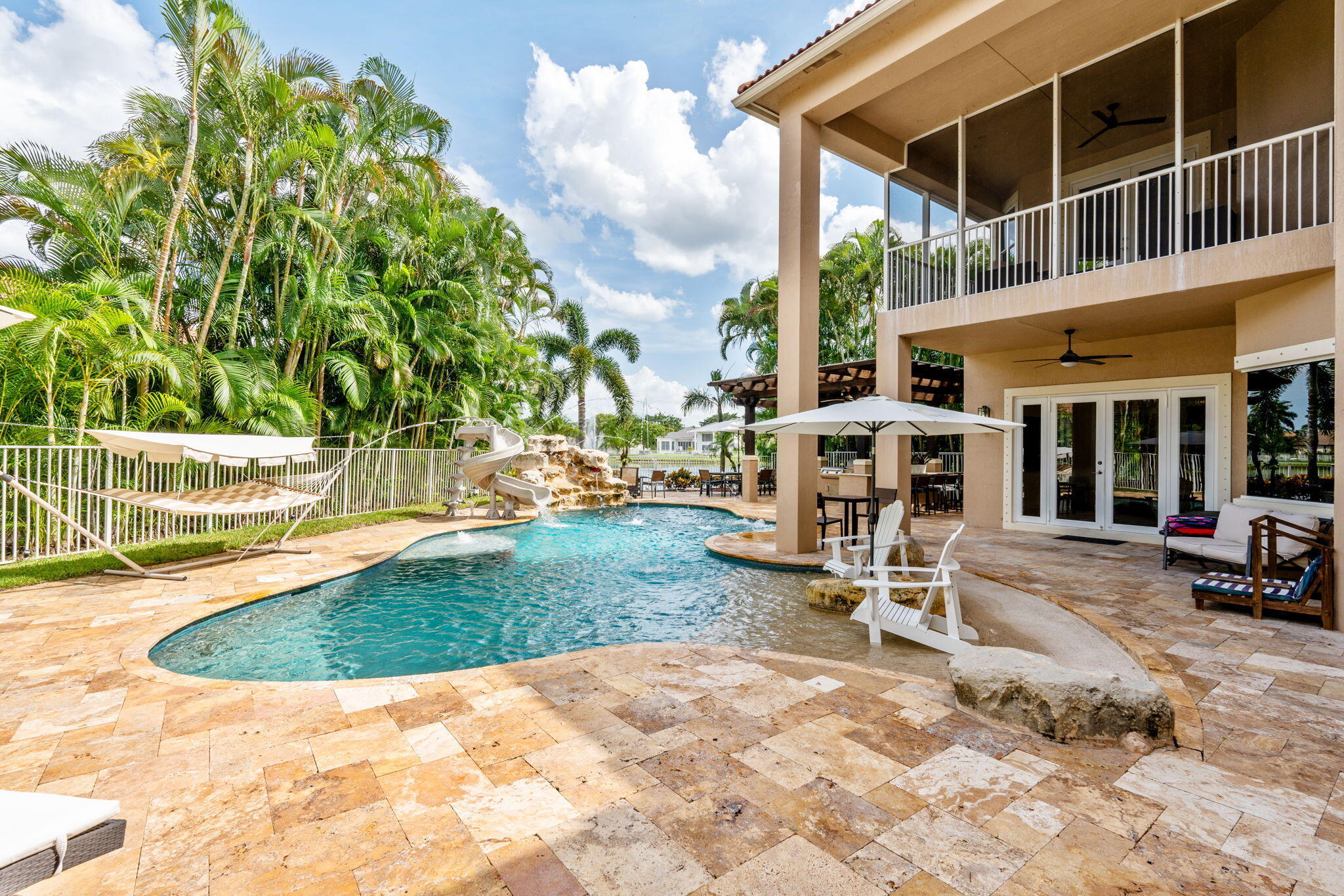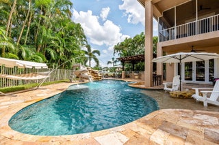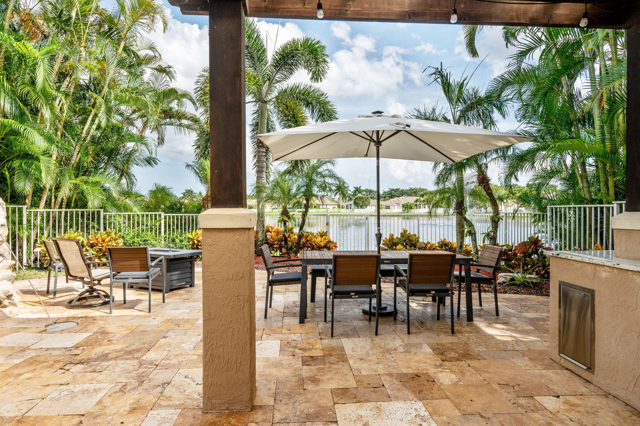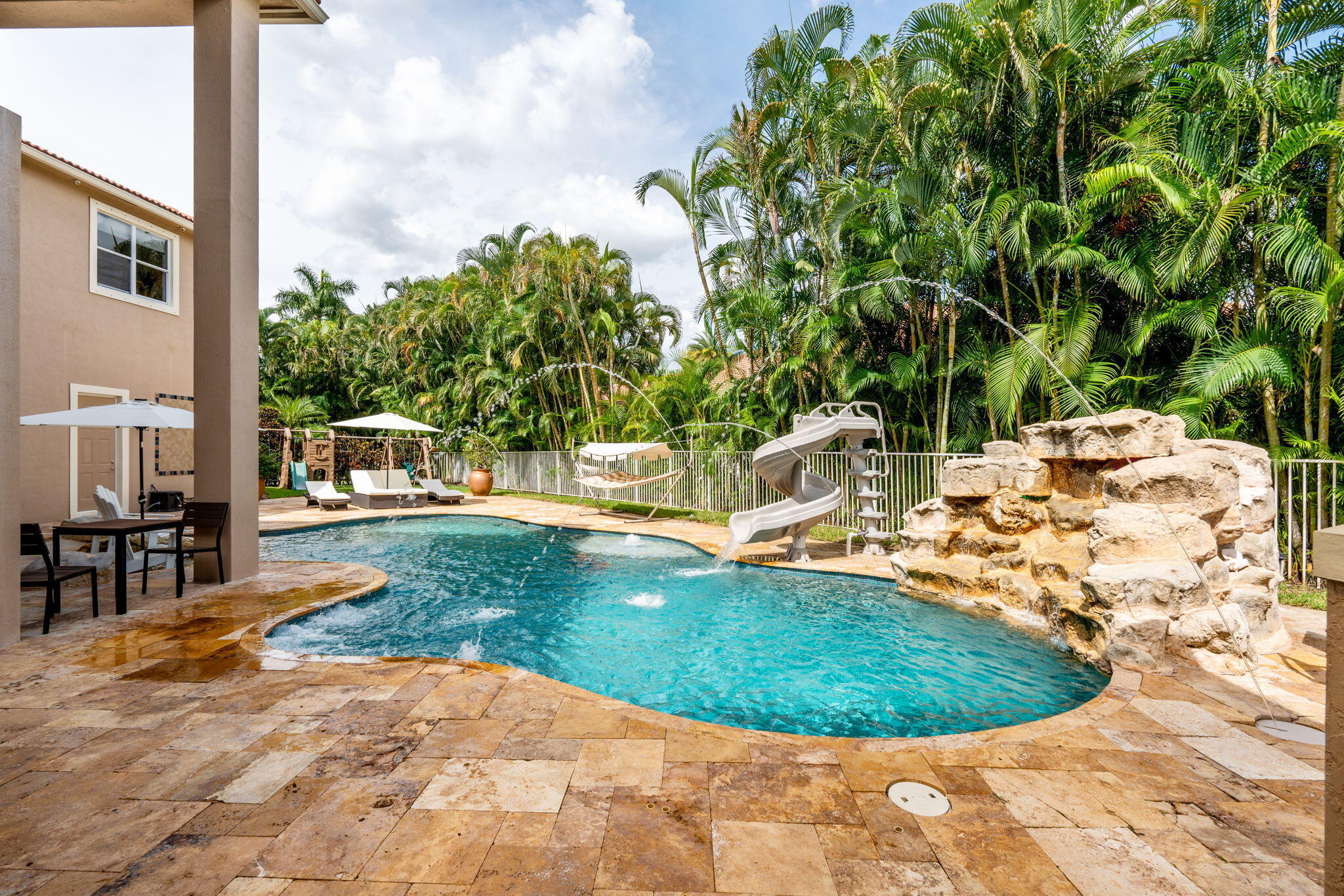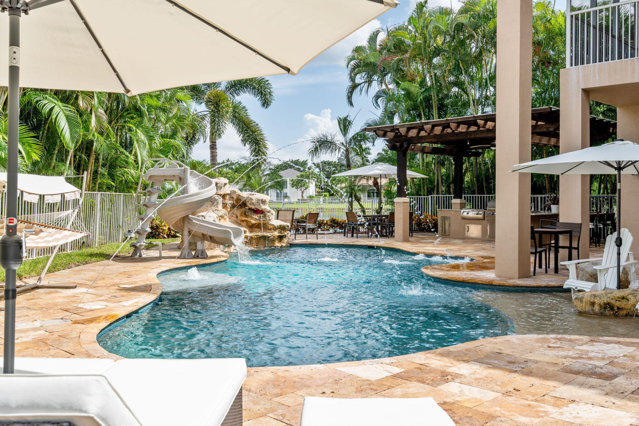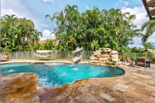 Welcome to this beautiful light-filled 6-bedroom, 4.5-bath seasonal rental offering luxurious comfort, space, and style. Upon entering, a striking floor-to-ceiling rear window greets you, framing the backyard, resort-style pool, and water, filling the home with light and serenity, with abundant space and storage throughout. The first floor features wood-tile flooring, a guest suite with a cabana bath and pool access, and flexible living and dining areas perfect for entertaining. The open family room and breakfast nook flow seamlessly into the gourmet kitchen with a 5-burner double oven, oversized island, walk-in pantry, and backsplash windows that bring in even more natural light.Upstairs, the primary suite overlooks the pool and water and serves as a true retreat, featuring dual walk-in closets, double vanities, spa-style shower, soaking tub, and beautiful designer light fixtures. Additional bedrooms share updated baths, and the laundry room is conveniently located. Outdoors, enjoy a resort-style pool with beach-entry and water feature, covered ultimate outdoor summer kitchen, putting green, and lush bamboo for privacy, with a huge fenced backyard offering abundant space for lounging, playing, and entertaining. The home also includes a 3-car garage for added convenience. Perfect for relaxing or hosting, just minutes from Wellington's equestrian venues, dining, and shopping.