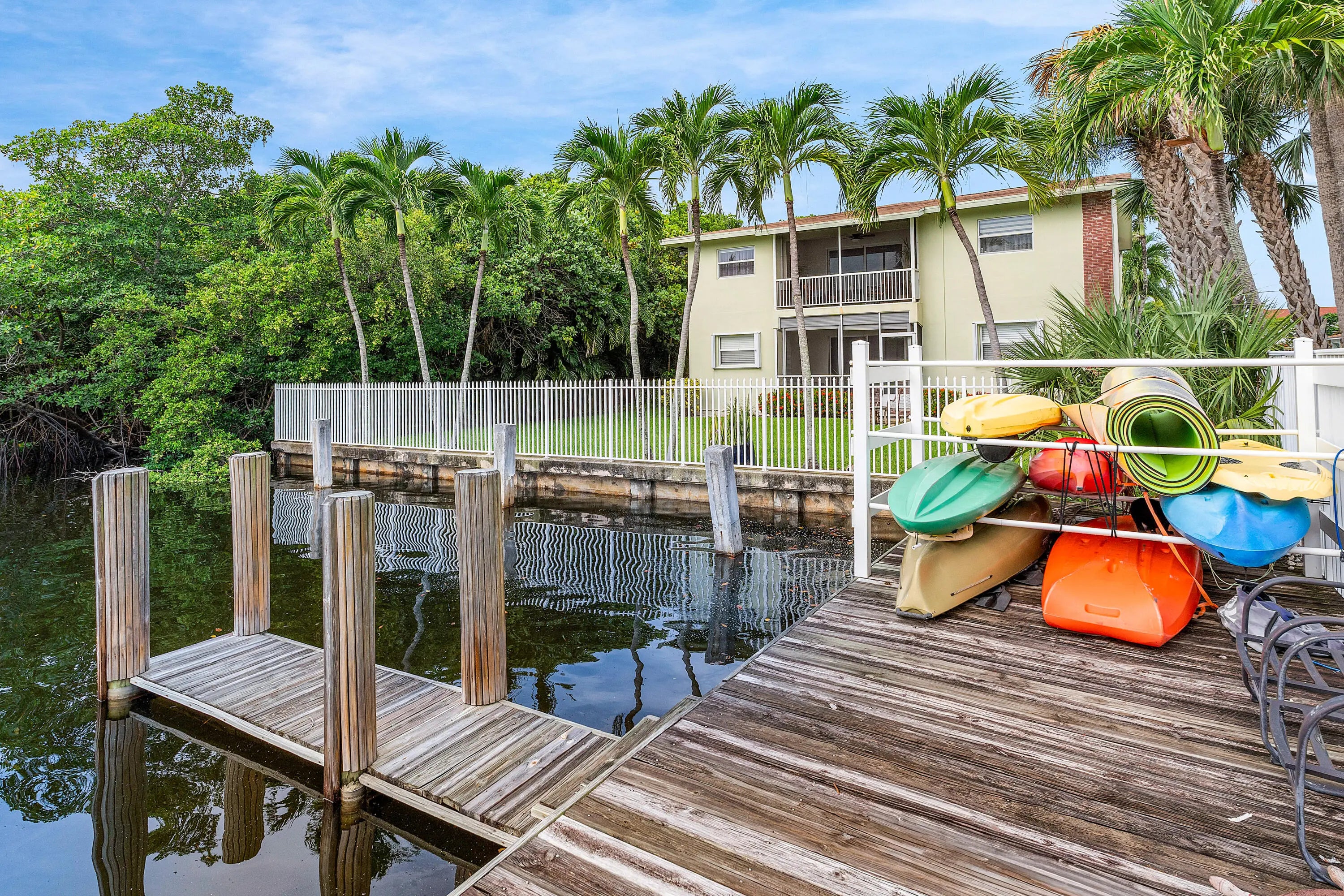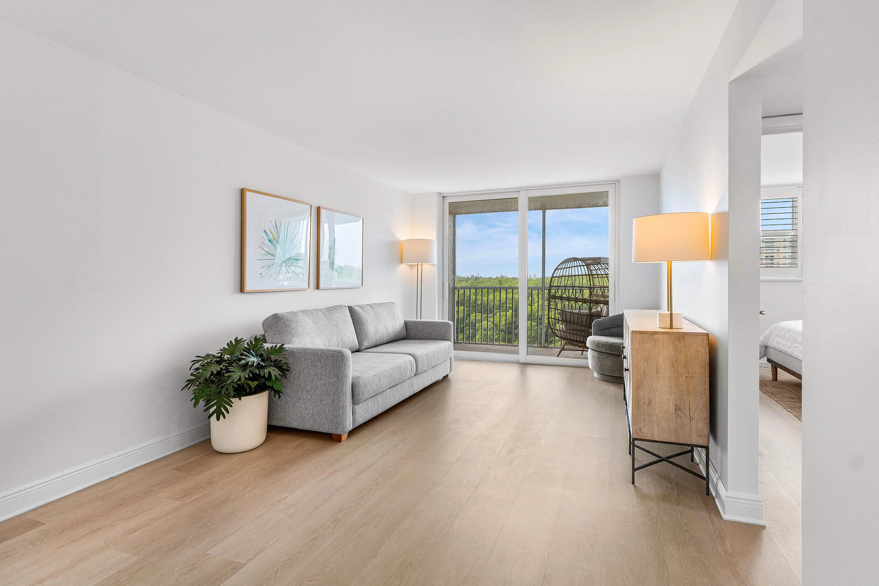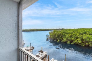 INTRACOASTAL VIEWS FULLY RENOVATED! Experience waterfront living at its finest in this beautifully renovated penthouse on the Intracoastal. Filled with natural light throughout, this bright and airy one bedroom, one bath residence features a sleek walk-in shower and a spacious bedroom with plantation shutters framing exceptional water views, plus a generous walk-in closet with custom built-ins.A coastal-inspired custom bookshelf in the hallway leads to the primary bedroom, adding both charm and functionality. The thoughtfully designed kitchen showcases quartz countertops, a wall oven, open-concept shelving, and abundant cabinetry with drawer storage, all seamlessly flowing into the inviting eat-in dining area.