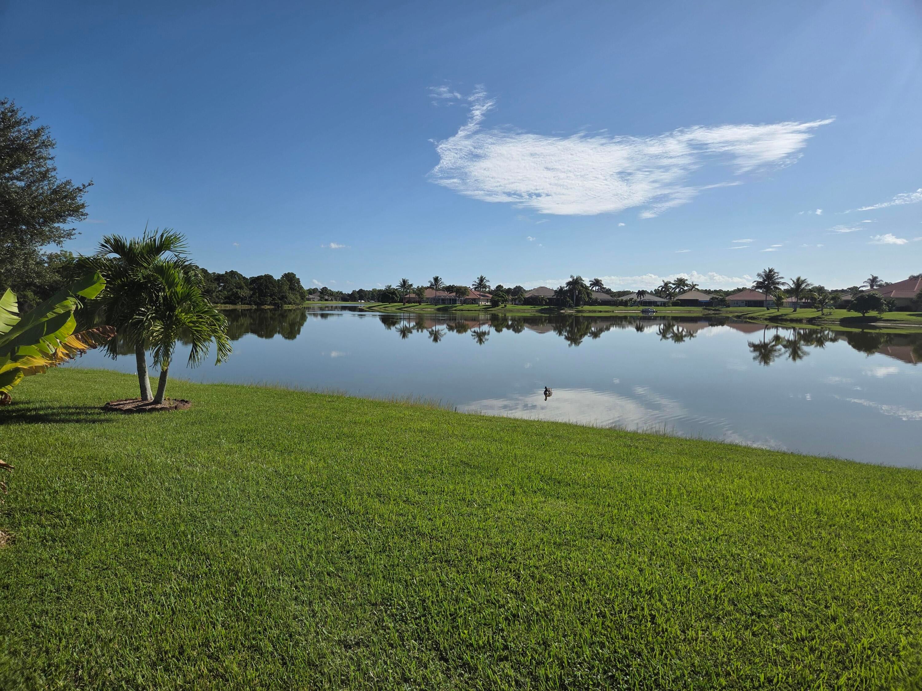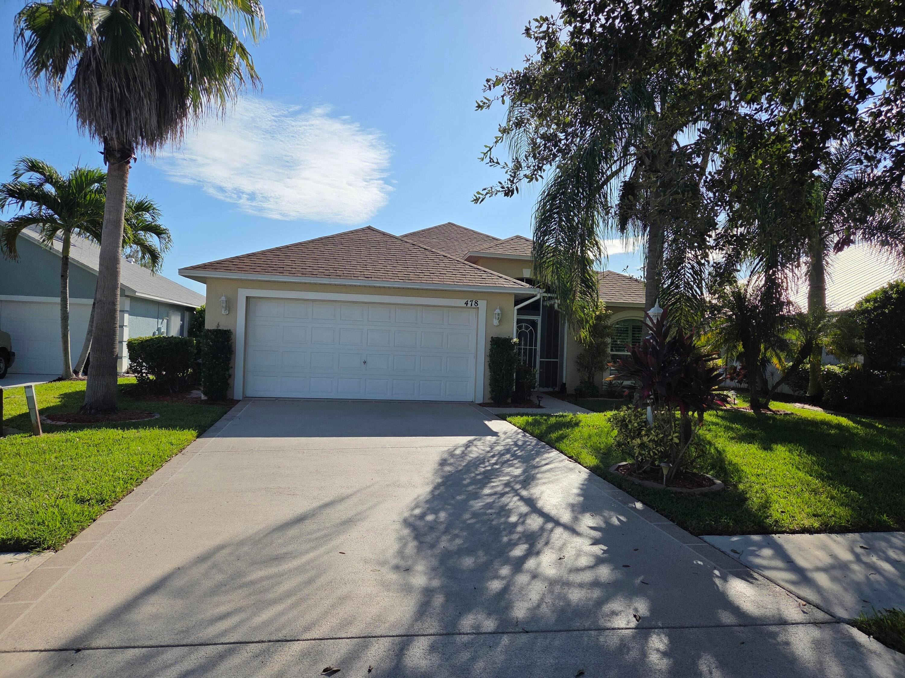 Welcome to the oak tree lined streets of Hammock Cove at Sawgrass Lakes which consists of 450 acres of connected lakes (see aerial) and are navigable with a trolling motor boat. This lakefront gated community of 126 homes features a club house, fitness room and lakefront pool. The home is located between Becker Road and Gatlin Blvd. between I-95 and the Turnpike. The $272 monthly HOA fees include lawn maintenance, internet and cable. The shingle roof was replaced in 2020 and the Carrier air conditioner was replaced in 2019. 10 foot flat knockdown ceilings; save the popcorn for the movies ! The kitchen has wood cabinets, granite countertops and black stainless steel appliances. Over $80,000 in upgrades including double pane impact resistant glass windows ($30 PSF), tile flooring in all rooms, 20' deep covered porch (standard is 8', see below), side screen porch, upgraded master bath vanity, guest bath/tub is now an enclosed shower, real plantation shutters, security system, glass front door and side lights and a designer stained and etched driveway and entry walkway. The seller is licensed and is an appraiser. The upgrade premium in the list price is approximately 50% of the $80,000 cost because upgrades are given a contribution to value, a not dollar for dollar premium. New water heater and washer/dryer. 475 SW Sundance Trail is the same furnished model home across the street, also for sale by the same owner.