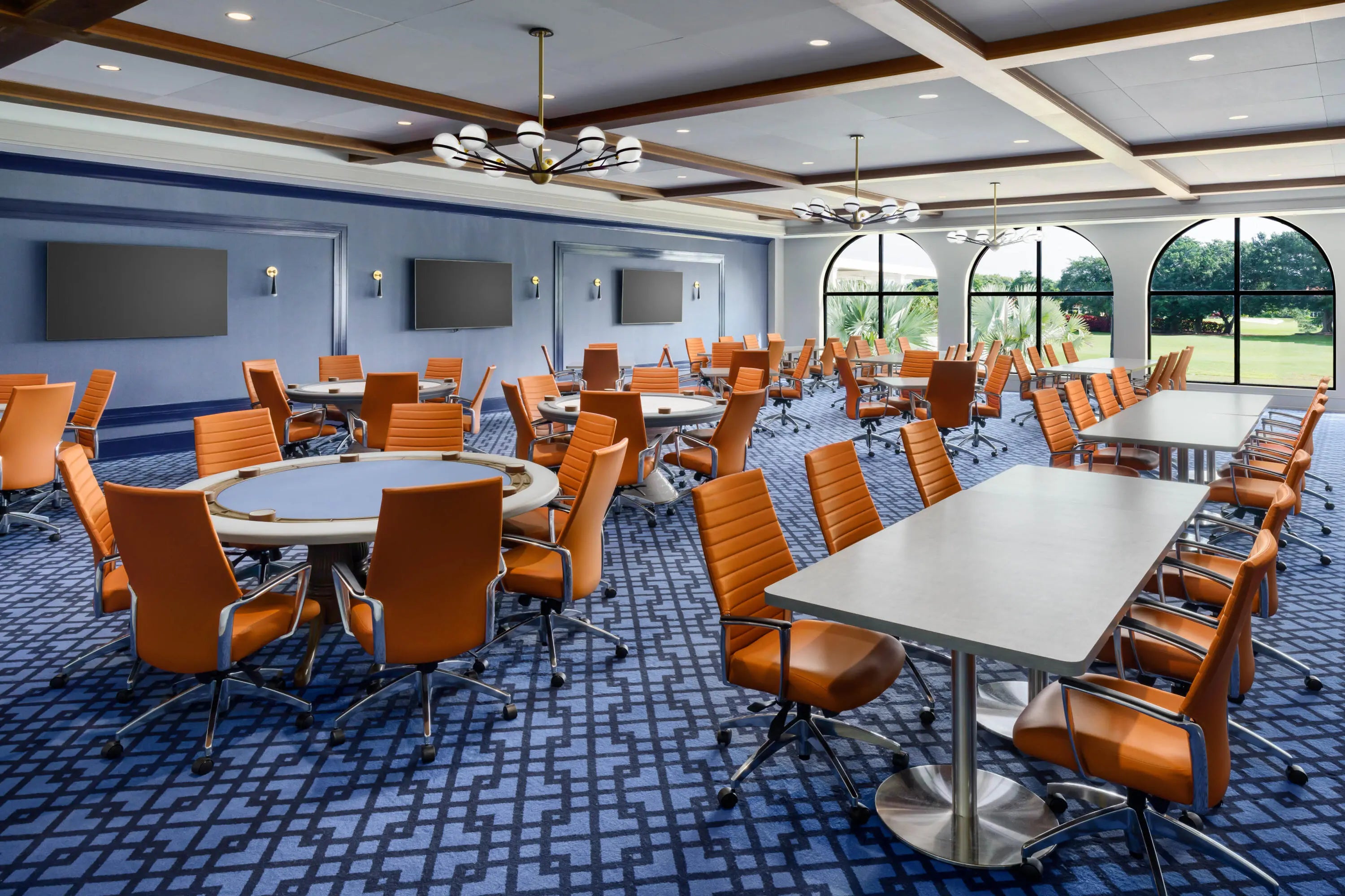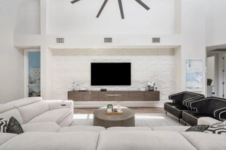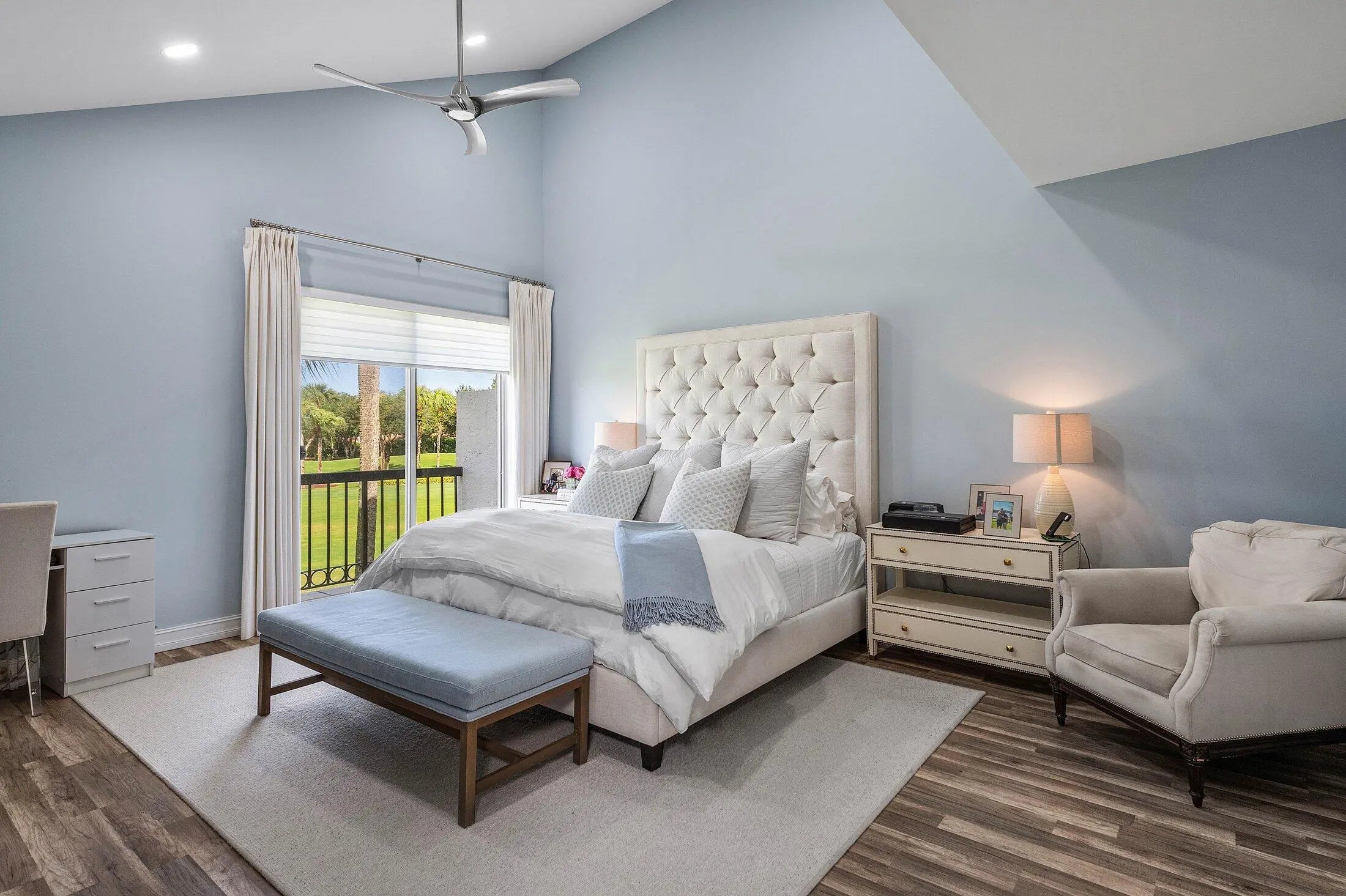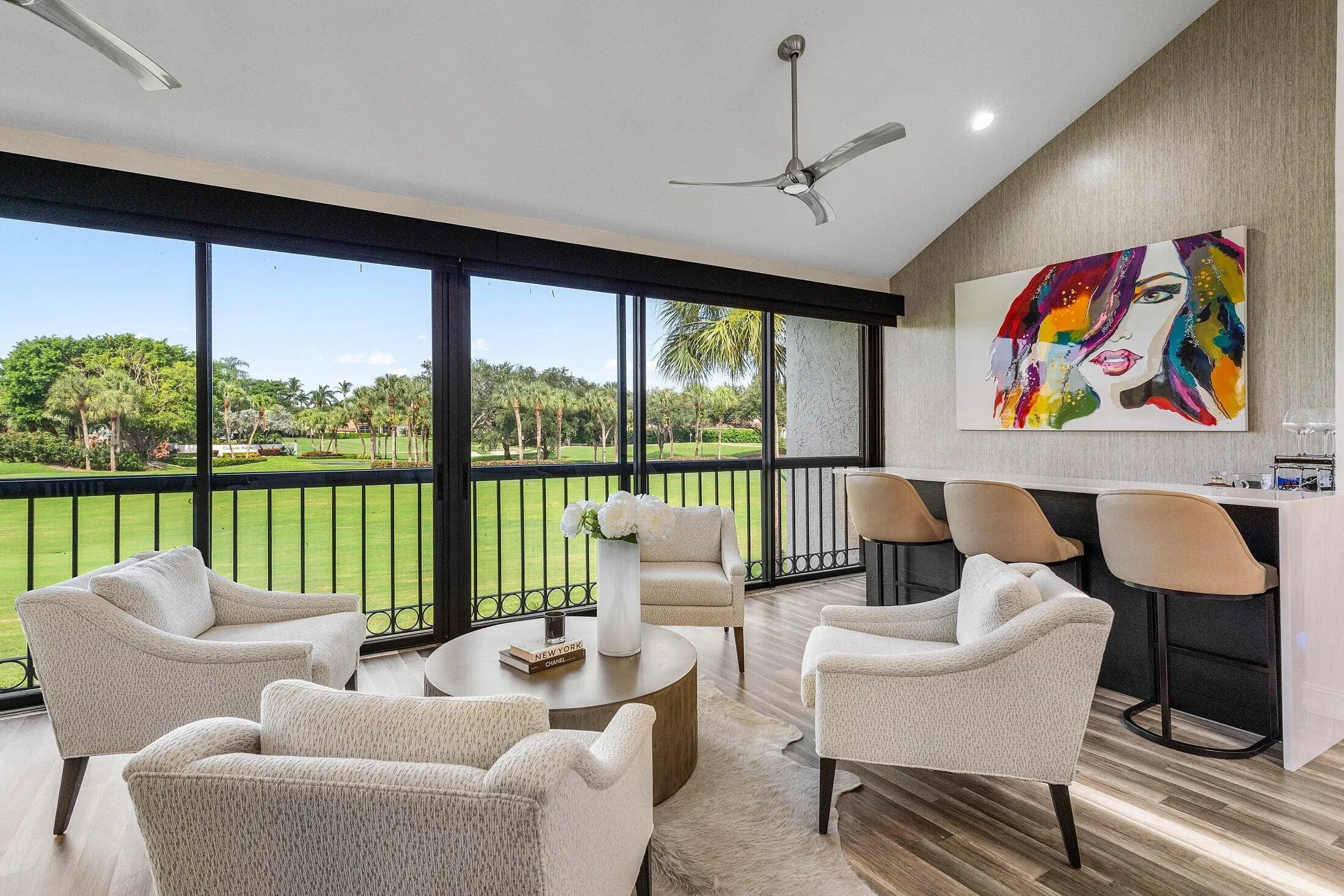 Experience modern elegance in this 4-bedroom, 3-bath condo with a 2-car garage in the award-winning Broken Sound Club. Enter by private elevator or open staircase to find a dramatic accent wall and soaring ceilings that set the stage for the home's sleek design. The chef's kitchen is outfitted with double ovens, larger refrigerator/freezer, a custom 8-foot stainless range hood, and an oversized island designed for entertaining. Wall-to-wall impact windows fills the great room with natural light and frames stunning golf course views, complemented by a unique TV feature wall and oversized ceiling fan. A dining area that seats 14+ beneath designer light fixtures plus a custom marble bar makes this home ideal for gatherings. This residence combines comfort and sophistication.
