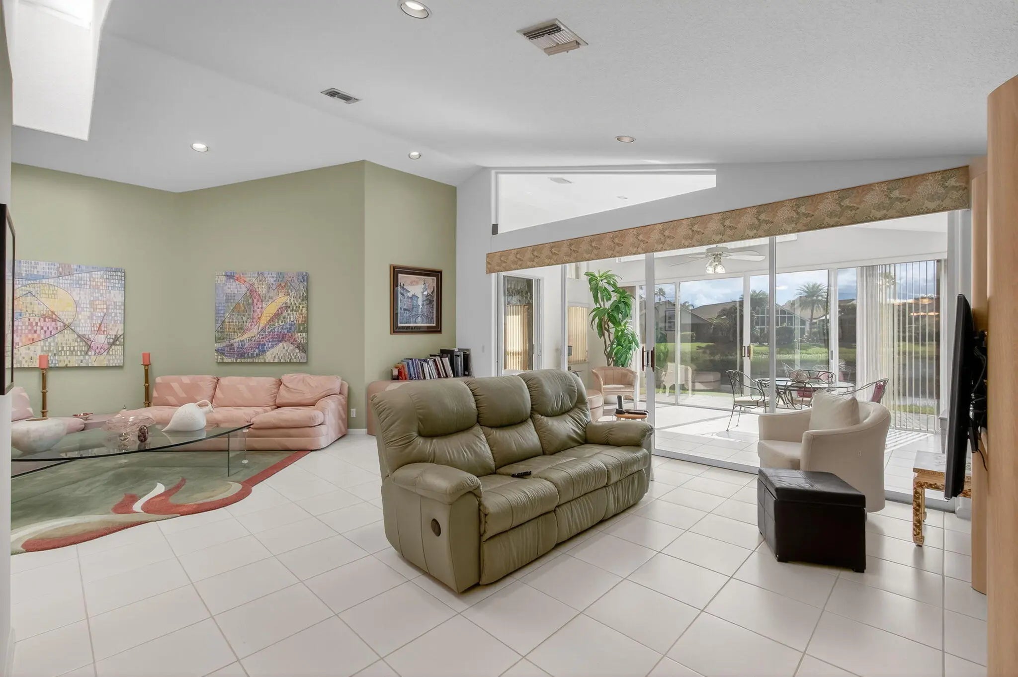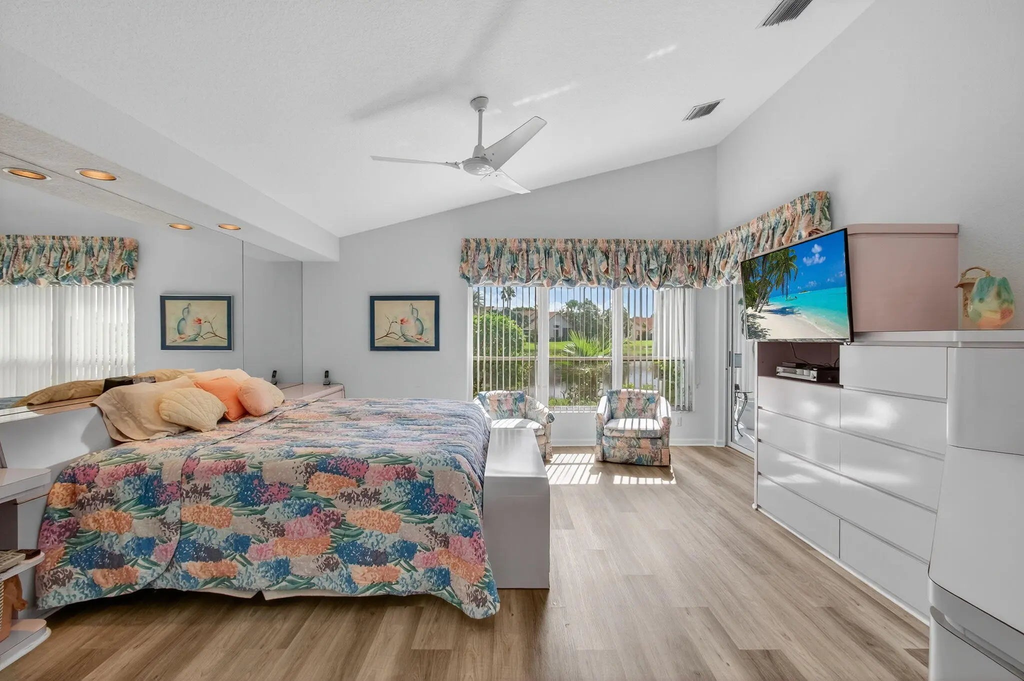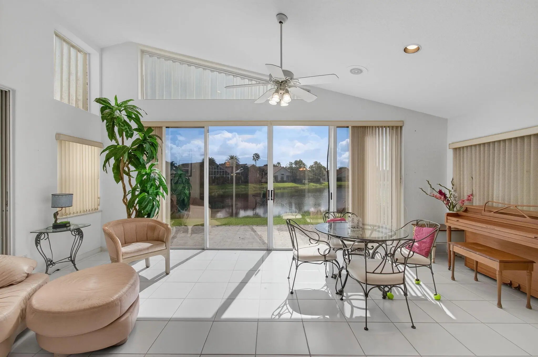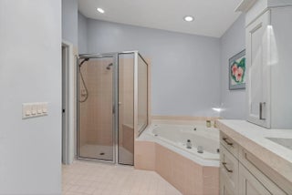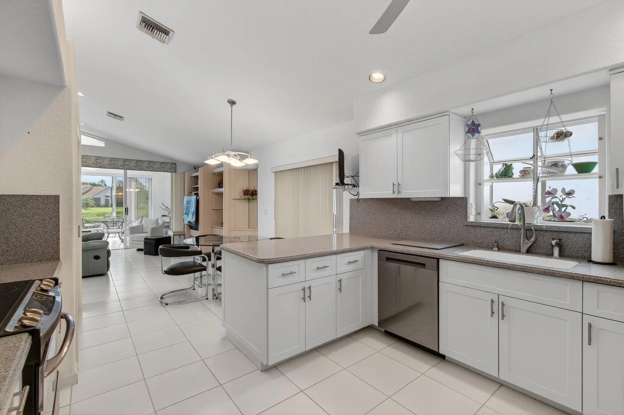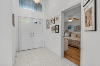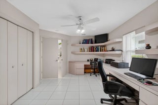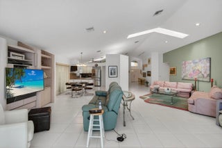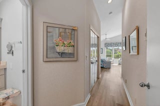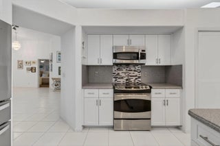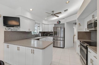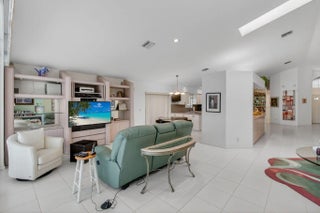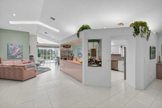 This elegant three-bedroom, three-bath home is situated on a corner lot and offers picturesque views of both water and the golf course. Updated kitchen features white shaker cabinets w/solid surface counter top plus breakfast nook. Screen enclosed side patio is ideal for outdoor dining. Large living room includes a built-in wet bar with additional storage. Formal dining room and family room are enhanced by custom built-ins. The family room opens onto a glass-enclosed Florida room equipped with air conditioning. The primary bedroom is outfitted with integrated furniture, a large walk-in closet, and a beautifully renovated ensuite bathroom boasting a spa tub, separate shower, and dual vanity. Bedroom two has an en-suite bathroom plus walk-in closet. Bedroom three is large with big walk in