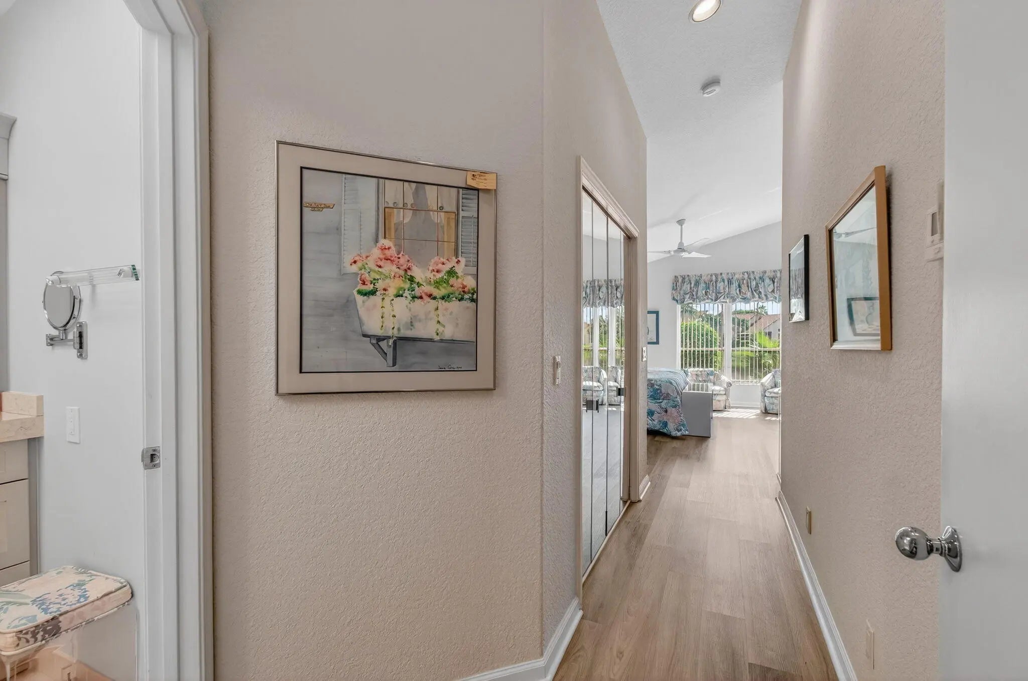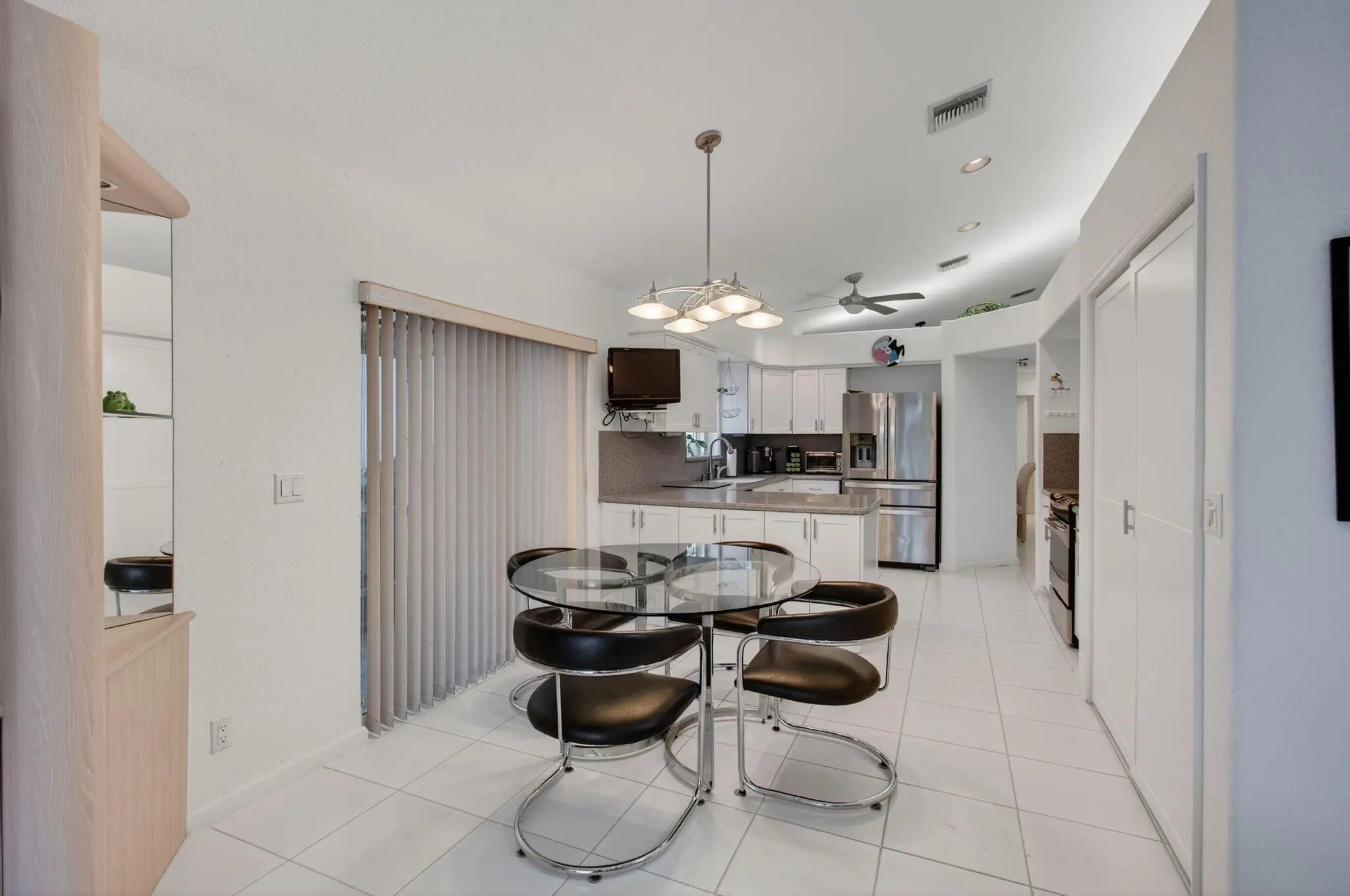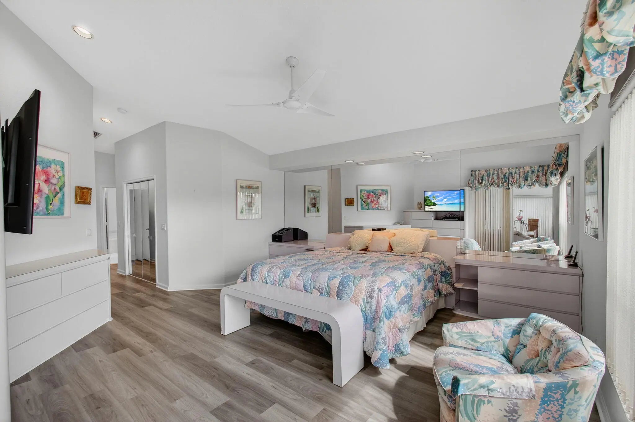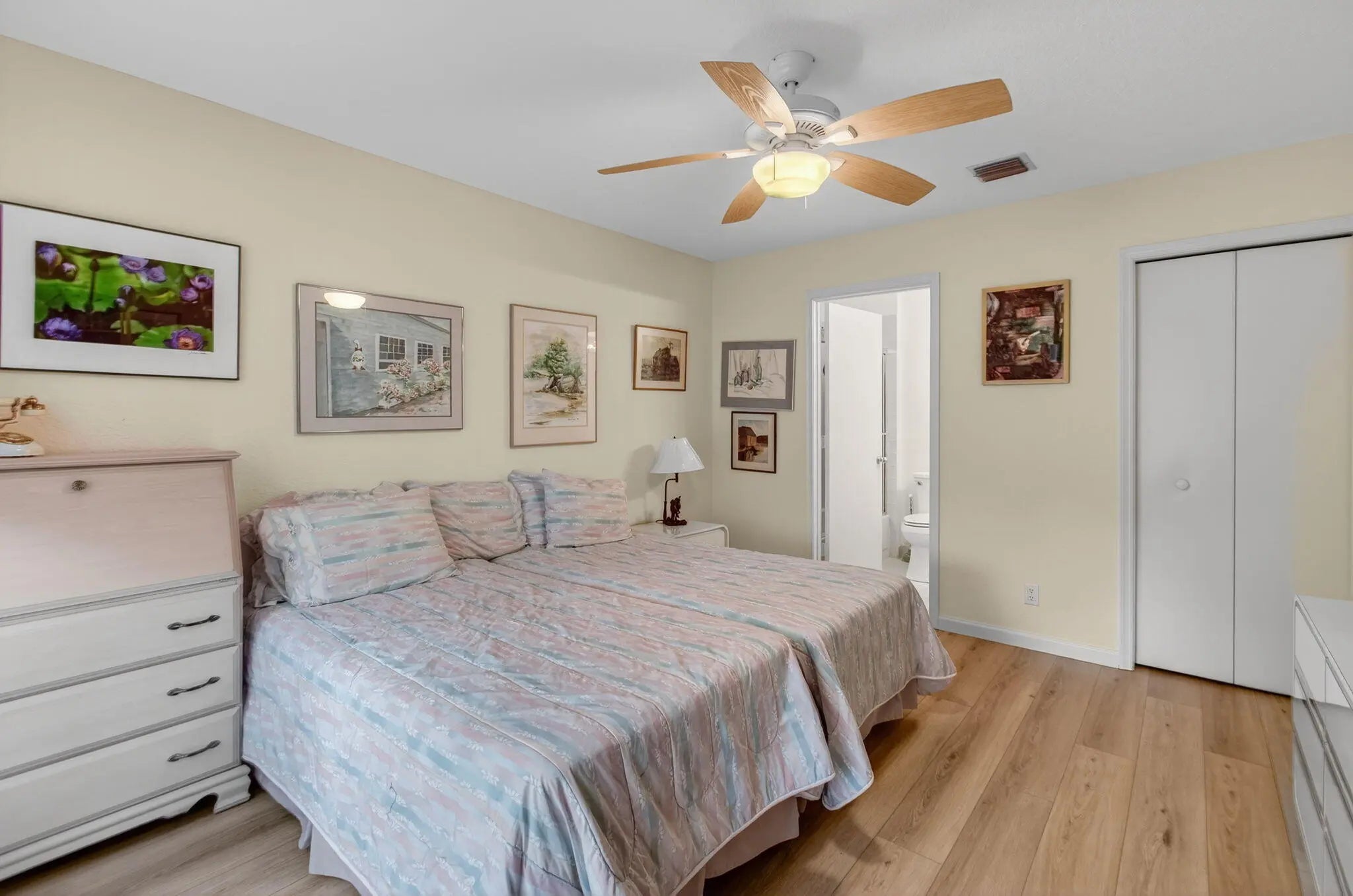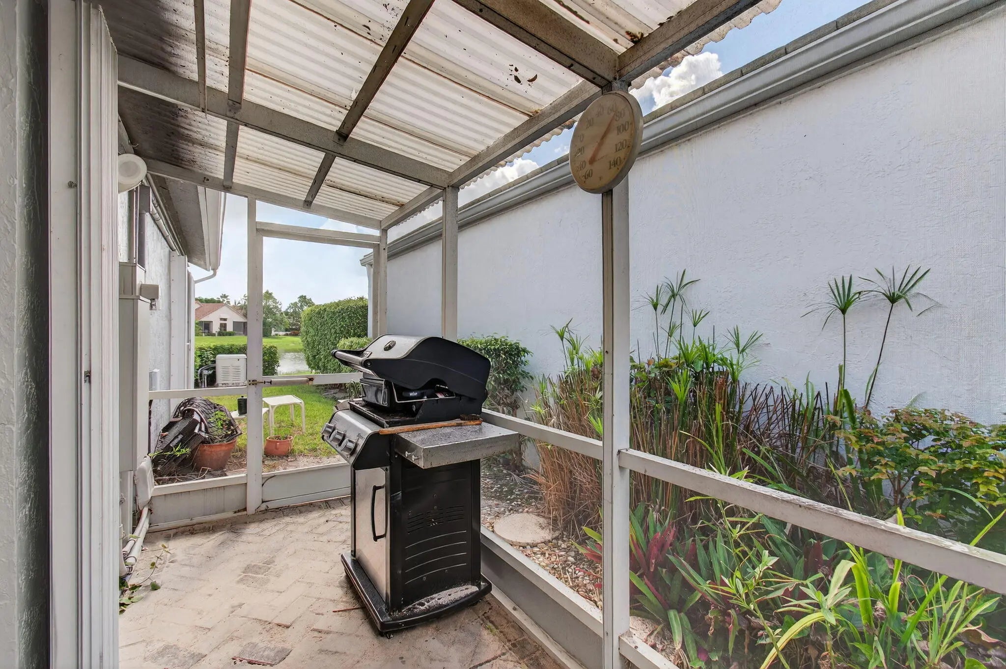 This elegant three-bedroom, three-bath home is situated on a corner lot and offers picturesque views of both water and the golf course. Updated kitchen features white shaker cabinets w/solid surface counter top plus breakfast nook. Screen enclosed side patio is ideal for outdoor dining. Large living room includes a built-in wet bar with additional storage. Formal dining room and family room are enhanced by custom built-ins. The family room opens onto a glass-enclosed Florida room equipped with air conditioning. The primary bedroom is outfitted with integrated furniture, a large walk-in closet, and a beautifully renovated ensuite bathroom boasting a spa tub, separate shower, and dual vanity. Bedroom two has an en-suite bathroom plus walk-in closet. Bedroom three is large with big walk in