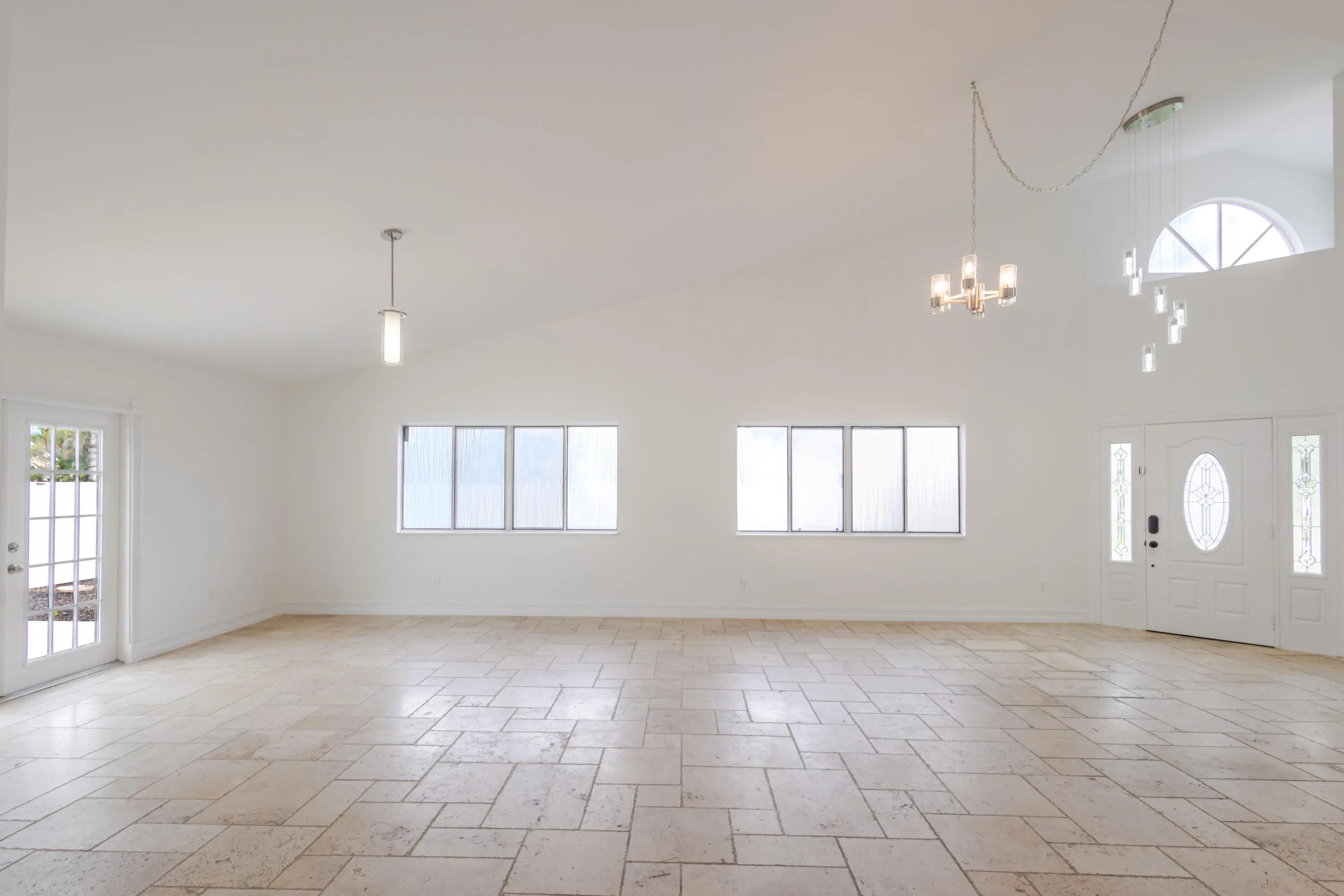 Well-kept West Boca home featuring 3 bedrooms and 2 bathrooms on a fully fenced corner lot with a spacious backyard. Recent improvements include fresh neutral paint, smooth ceilings (no popcorn), and updated lighting fixtures throughout the home, garage, and exterior. Travertine marble flooring runs through the living areas, highlighted by vaulted ceilings and abundant natural light. The updated kitchen offers wood cabinetry, granite counters, and stainless steel appliances. The primary suite includes two walk-in closets and a remodeled bath with an oversized walk-in shower. Additional features include a front-load washer/dryer, upgraded garage lighting, and thoughtful improvements that create a bright, welcoming feel. This home is move-in ready, modernized, and turnkey.