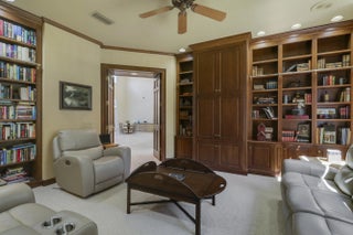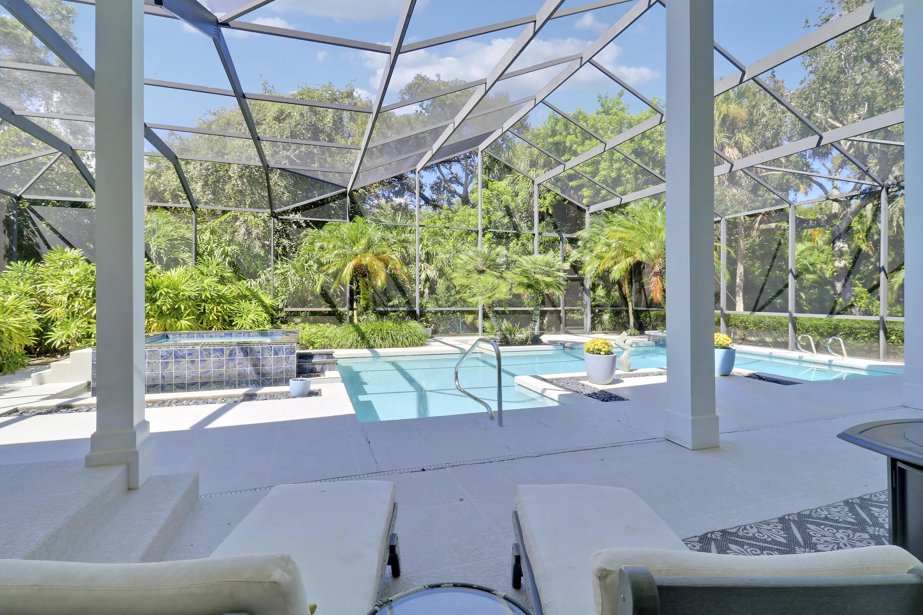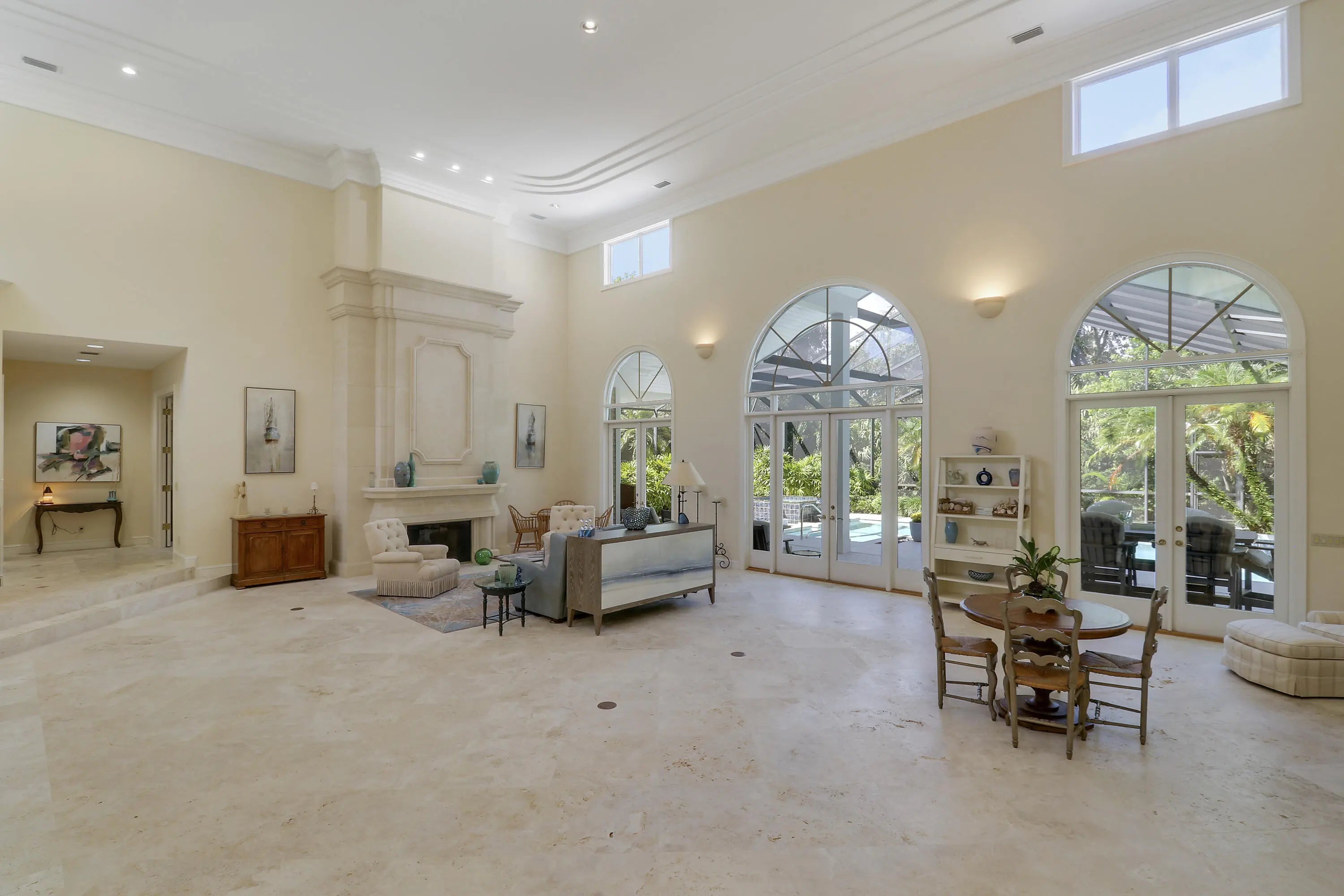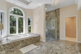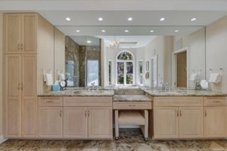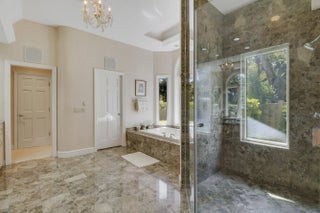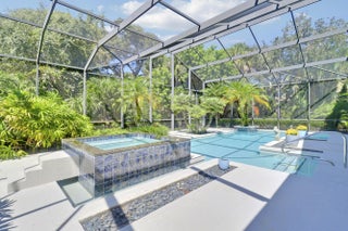 Elegant 4BR/5.1BA pool home in prestigious Indian Trails, offering A+/-5,800 SF of refined indoor-outdoor living on a lushly landscaped cul-de-sac. The grand entry opens to soaring ceilings and a dramatic great room with marble fireplace, arched windows, wet bar, and library with custom bookcases. The chef's kitchen features granite countertops, custom cabinetry, 5 burner gas stove and under-cabinet lighting. The first-floor primary suite is a true retreat with garden views, tray ceiling, and spa-like marble jacuzzi tub with dual vanities, and oversized walk-in shower. A dedicated pool bath adds convenience for guests. Upstairs, the large guest loft includes two bedrooms, with 2 full baths, and a bright sitting area. Enjoy the renovated screened pool and spa deck with hot tub,