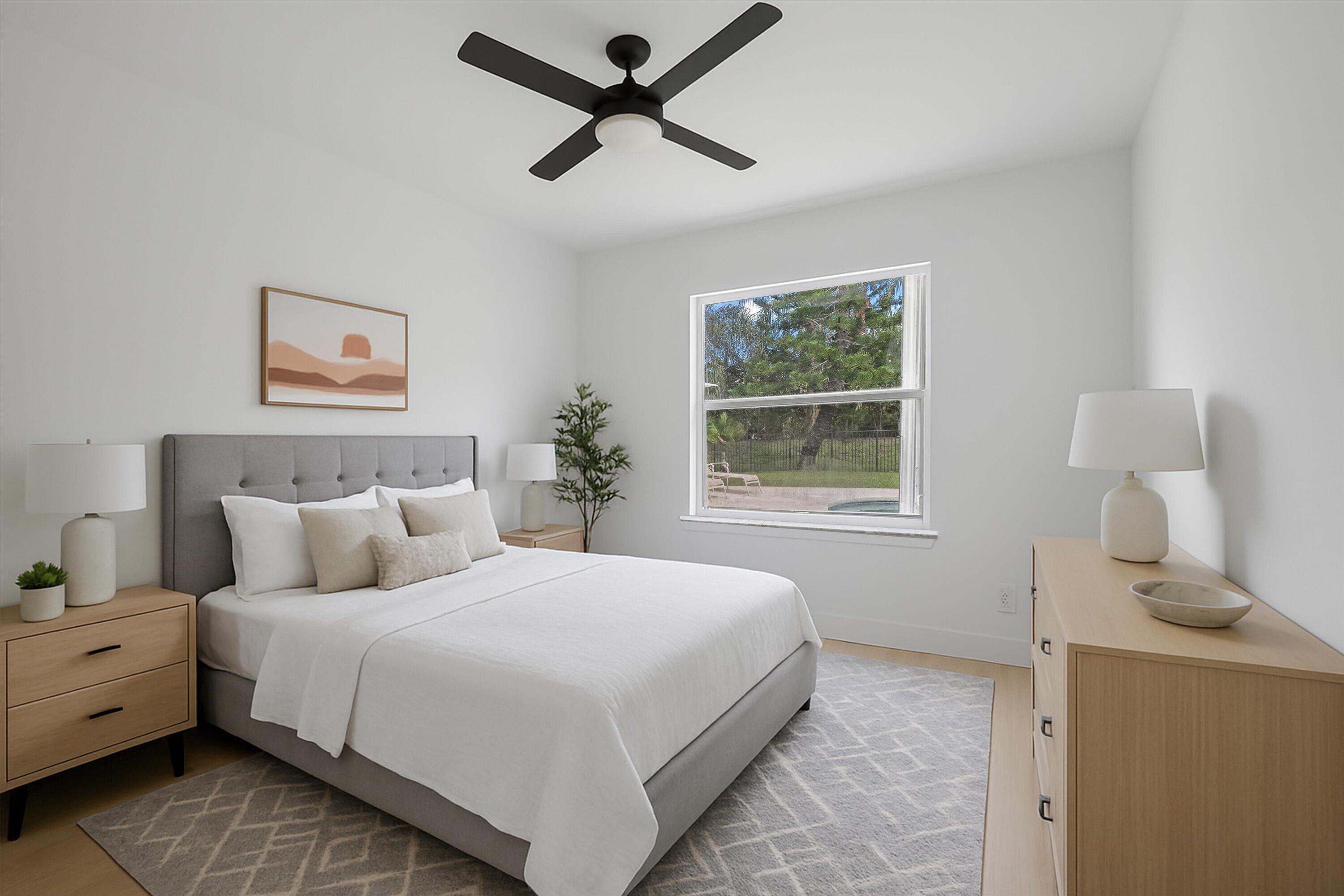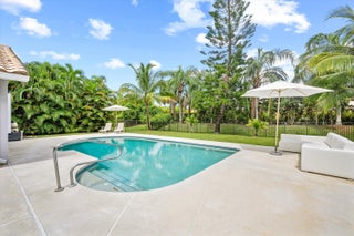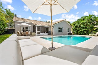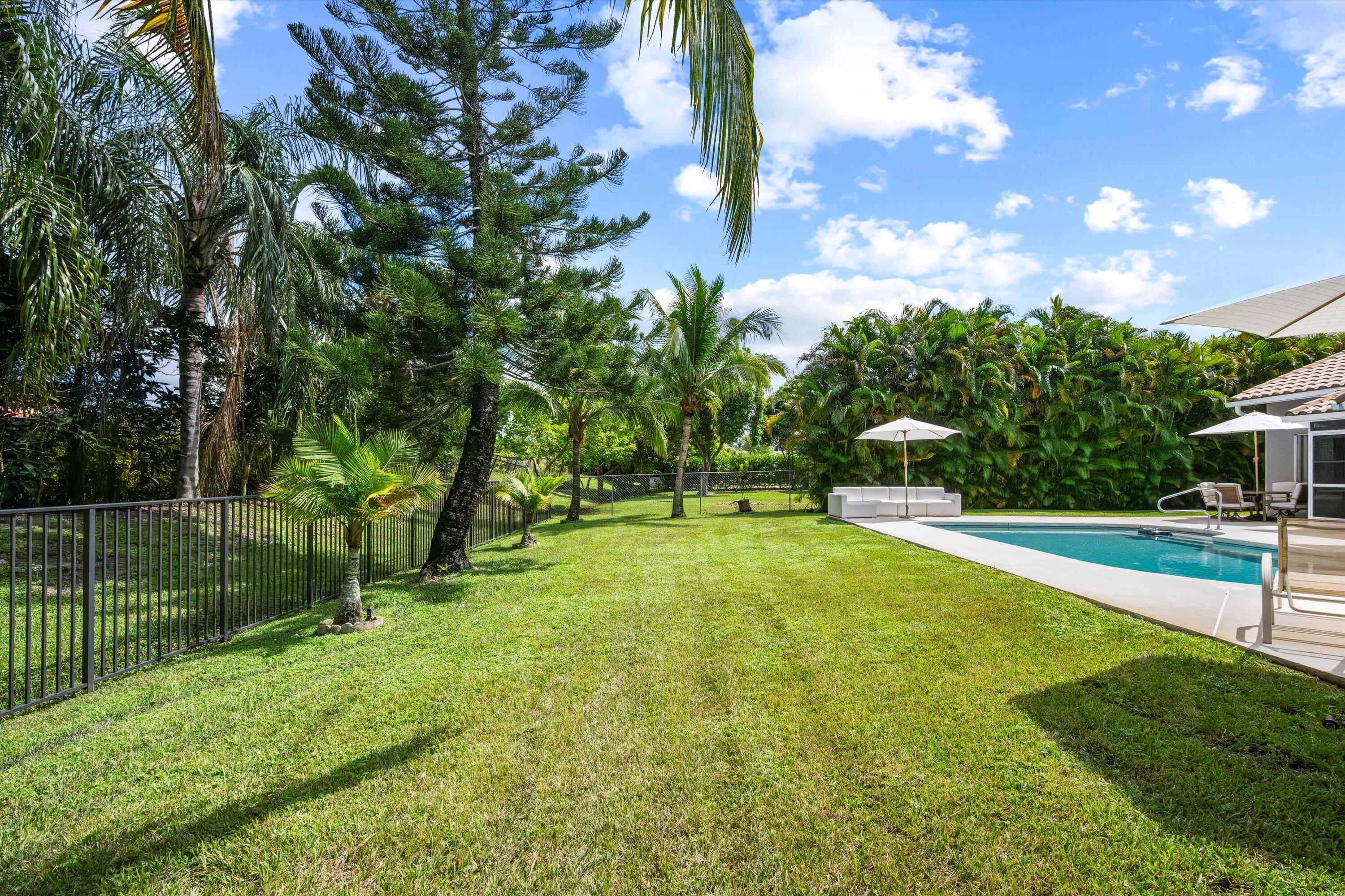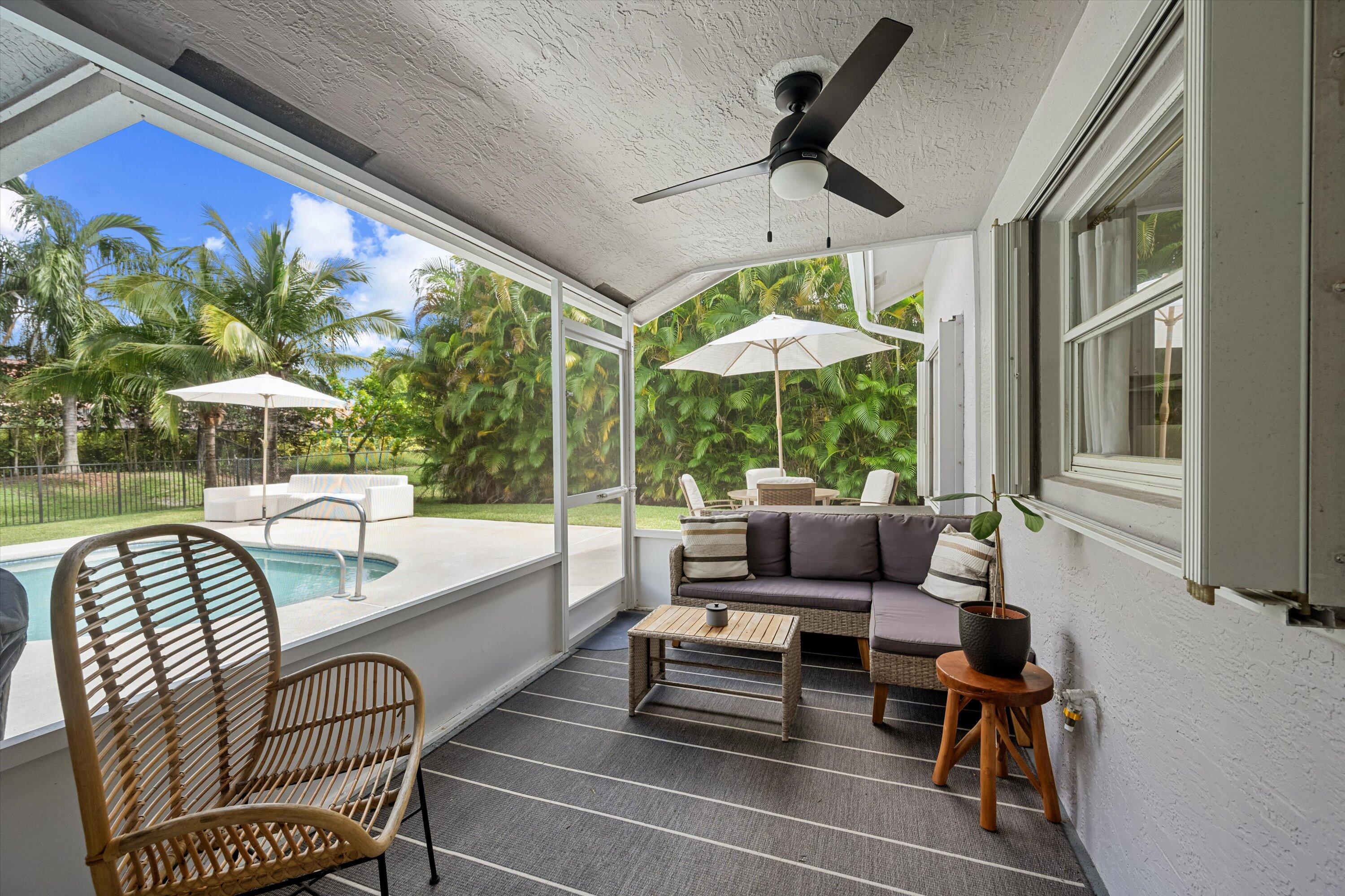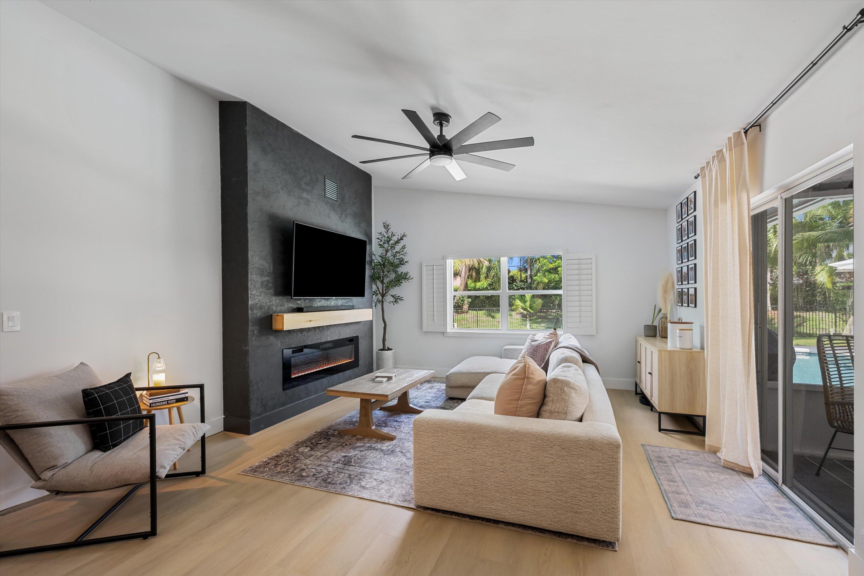 Step into your cozy, modern oasis! This lovingly renovated 4-bedroom, 2-bathroom home is filled with thoughtful details and a warm, organic vibe. Sunlight bounces off the sleek LVP flooring (2024) in the living areas, while soft rugs add a cozy touch. The primary bathroom, remodeled in 2025, feels like stepping into a spa with its stunning concrete-style tile and serene atmosphere. The secondary bathroom features a relaxing tub perfect for unwinding after a long day.The kitchen, remodeled in 2024, is a chef's dream with gleaming quartz countertops, a huge custom butcher block island, and all new Samsung appliances. Just down the hall, the recently renovated laundry/mudroom features handmade cabinets, a peaceful atmosphere, and a full-size washer and dryer, making chores a pleasure. The open-concept living area invites you to gather around the TV feature wall with its functional fireplace, perfect for cozy nights in. City water and a whole-house filtration/softener system ensure clean, fresh water throughout the home. Outside, your private paradise awaits. Dive into the oversized pool, lounge on the sectional or poolside chairs under patio umbrellas, or enjoy a meal at the poolside dining table. The backyard is fully fenced, with a large grassy area for your pet to run and play, and privacy is guaranteed thanks to tall Areca palms and county easement land behind the property. Relax on the screened-in front porch with a morning coffee, or unwind on the back lanai with its new ceiling fan, comfy couch, and chair. An outdoor propane grill makes al fresco dining a breeze, and a two-car garage completes this picture-perfect retreat. This home isn't just a place to stay, it's a sanctuary where modern design meets cozy, organic living. Imagine mornings by the pool, evenings by the fireplace, and everything in between in a home that's ready for you, your family, and even your furry friend. Conveniently located just minutes from WEF, Global Dressage, and all equestrian facilities, as well as PBI Airport, beaches, Worth Avenue, and downtown West Palm Beach. Perfect seasonal retreat offering both luxury and convenience in the heart of Wellington.