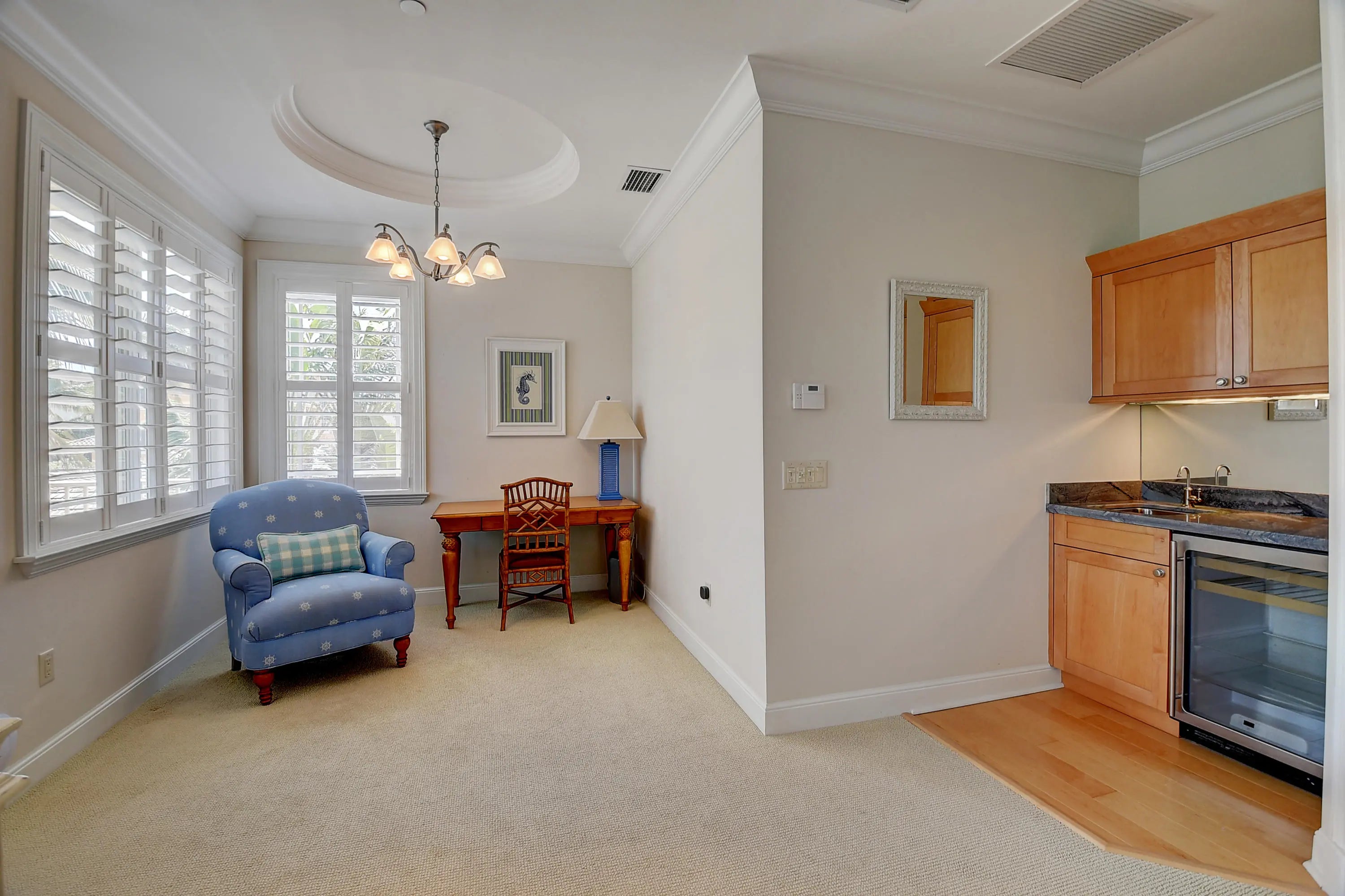 Luxury townhouse rental! Steps to the beach, 3 blocks from Atlantic Avenue. This furnished 3 story townhome features impact-glass, elevator, hardwood and marble floors, plantation shutters. French doors open to the plunge pool patio from the open concept living/dining/kitchen, coffer-ceiling dining, and chef's hi end kitchen with ocean-blue granite. 1st flr bedroom has an adjacent full bath. On 2, the primary suite features; balcony above the pool, sitting area, 2 walk in custom closets, a morning bar, a luxurious bathroom with: jetted tub, walk-in shower, and separate water closet. 2 additional en-suite bedrooms, one with an ocean view balcony, both with walk in closets. 3rd floor loft/office/pull out love seat with full bath and a LARGE ocean view terrace perfect for entertaining.
