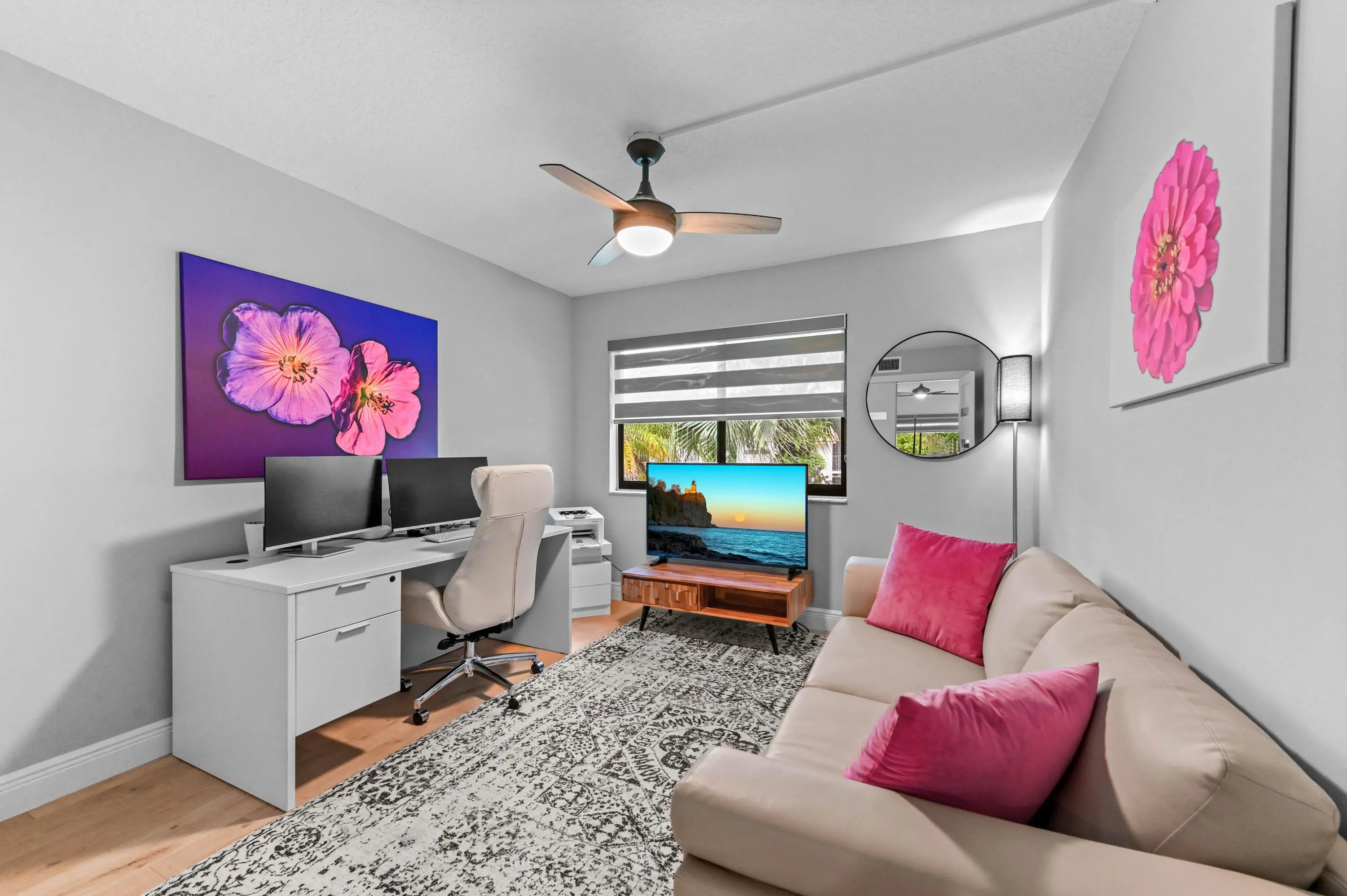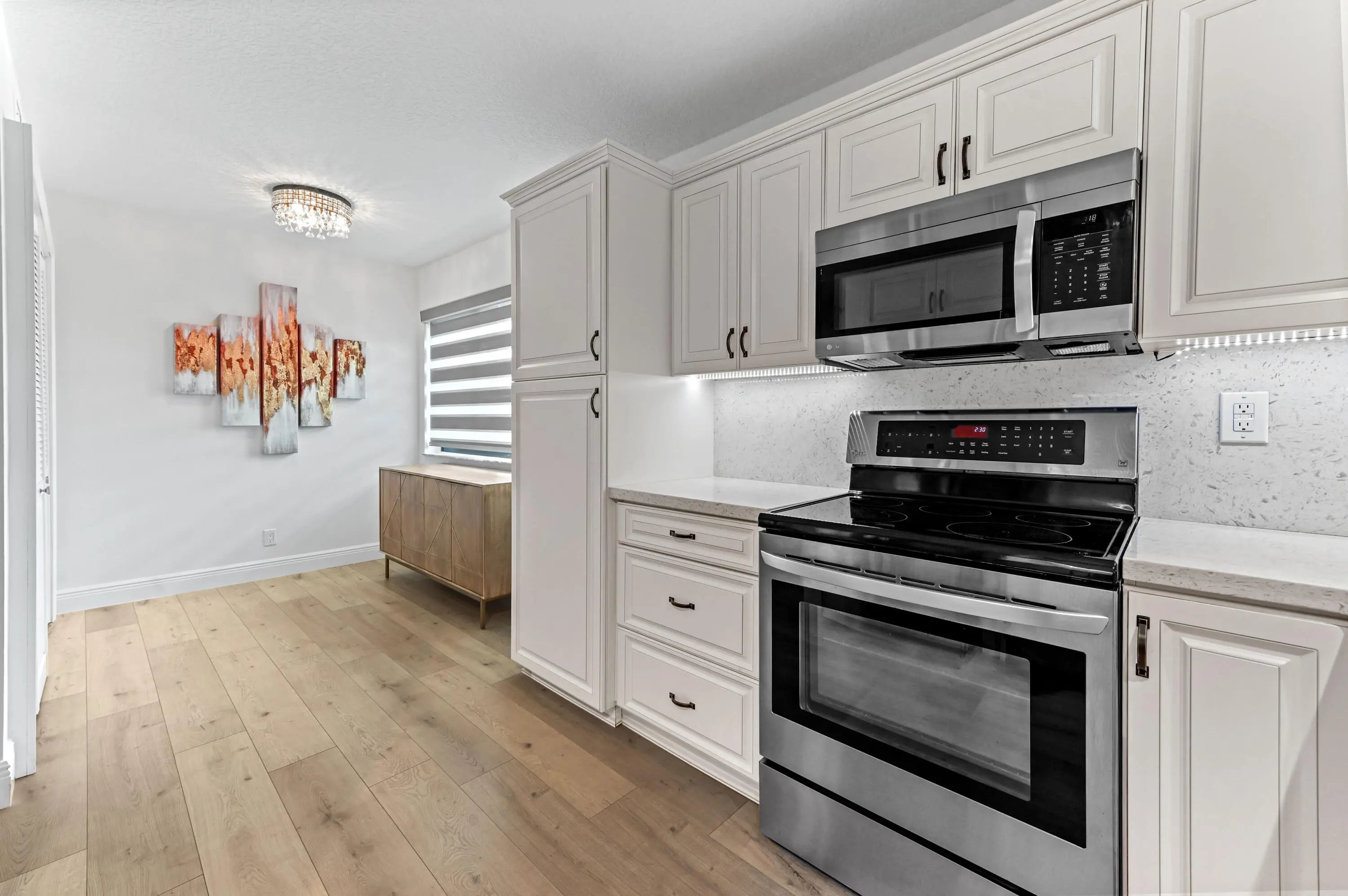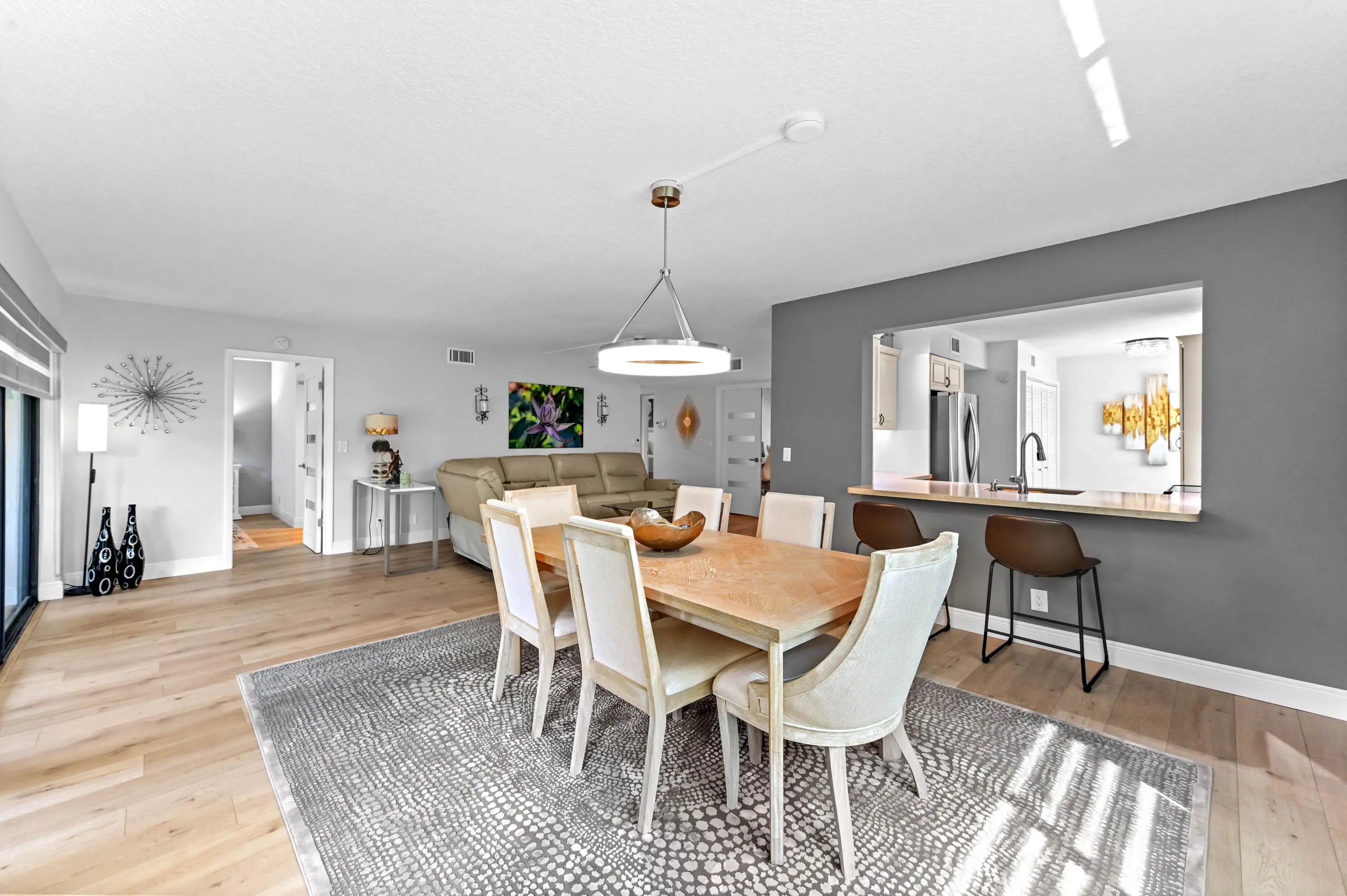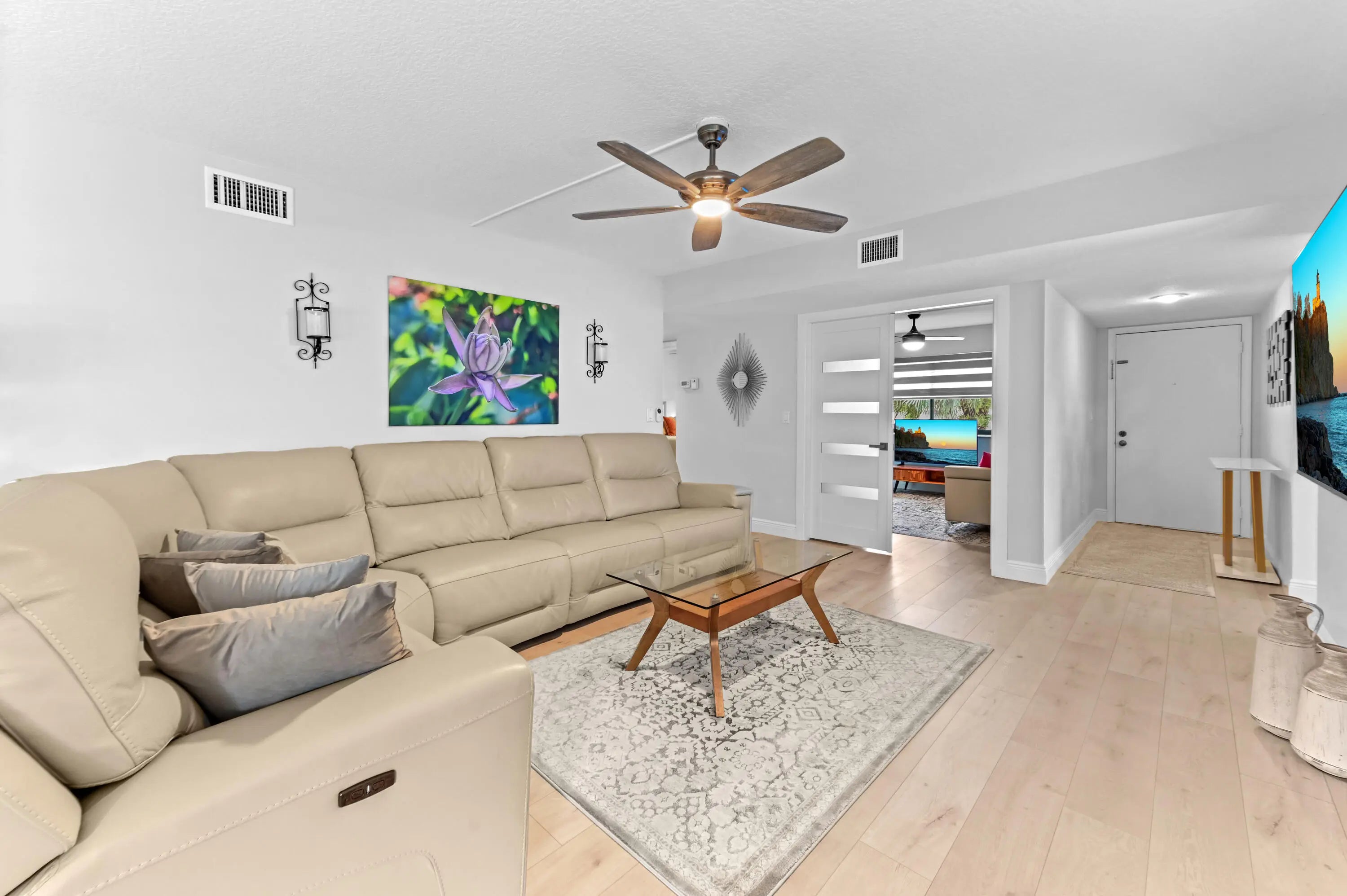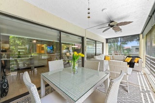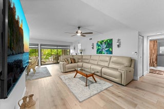 Spacious 1,426 sq. ft. three-bedroom, two full bath corner unit in Fairway Park Condominiums at Indian Spring offers superior privacy and natural light. Open-concept living with consistent laminate flooring (2024) throughout enhances the home's open feel--no carpet, no popcorn ceilings! This second-floor unit features hurricane windows, updated bathrooms, and a remodeled kitchen with LG appliances.The large 23' x 8' screened lanai has custom privacy blinds and accordion shutters. Notable updates include a new roof (2025), AC (2018), water heater and flooring (2024), plus 2022 upgrades: zebra blinds, hurricane windows, washer and dryer, light fixtures, ceiling fans, electrical panel, outdoor privacy screens, and designer interior doors.