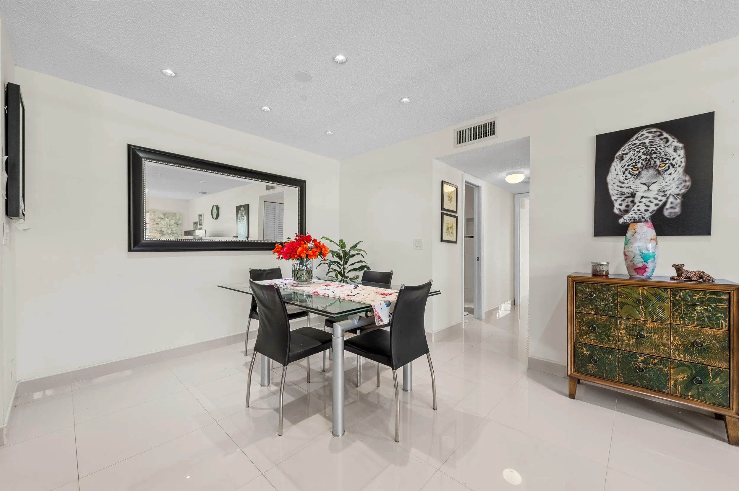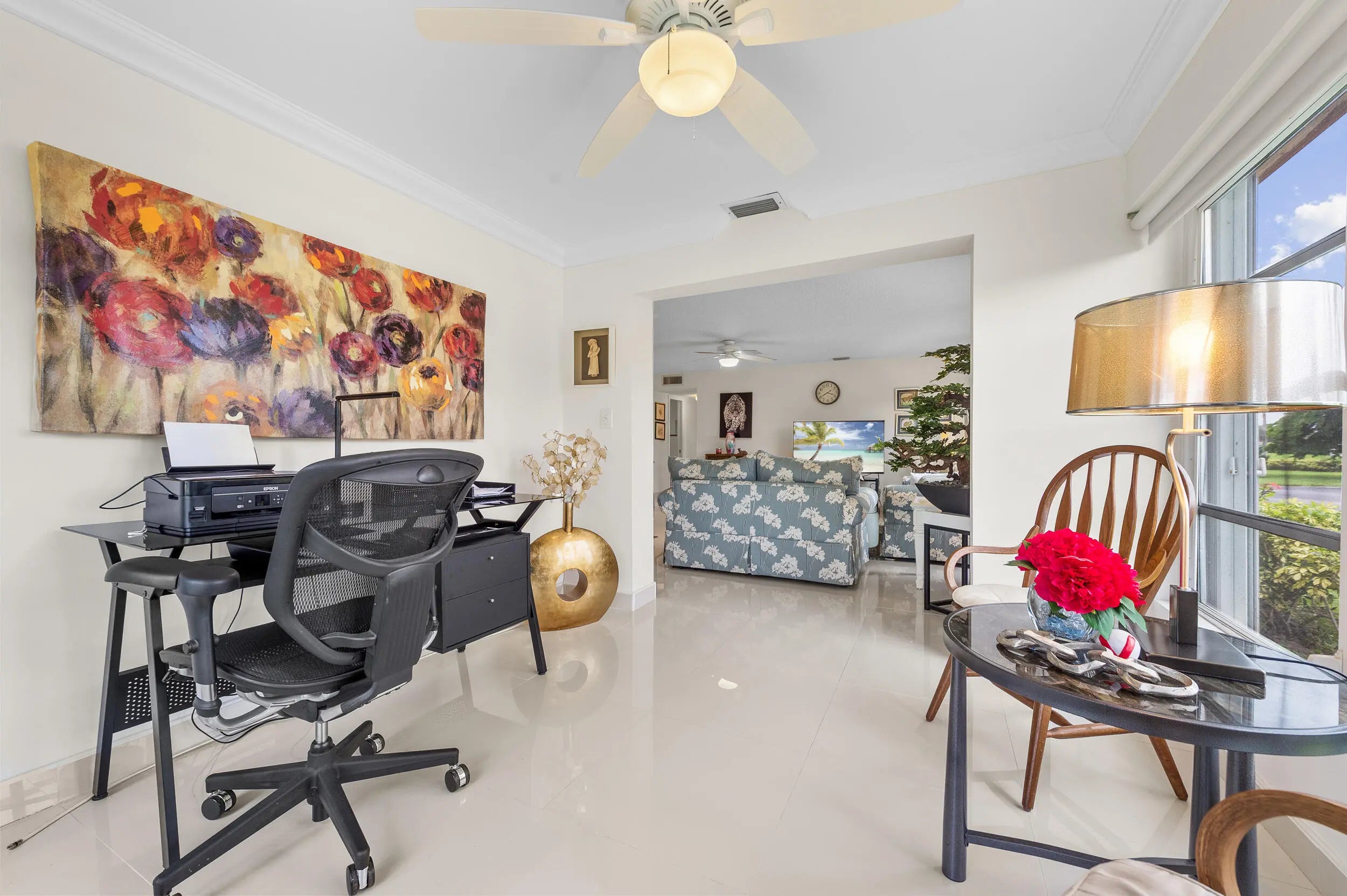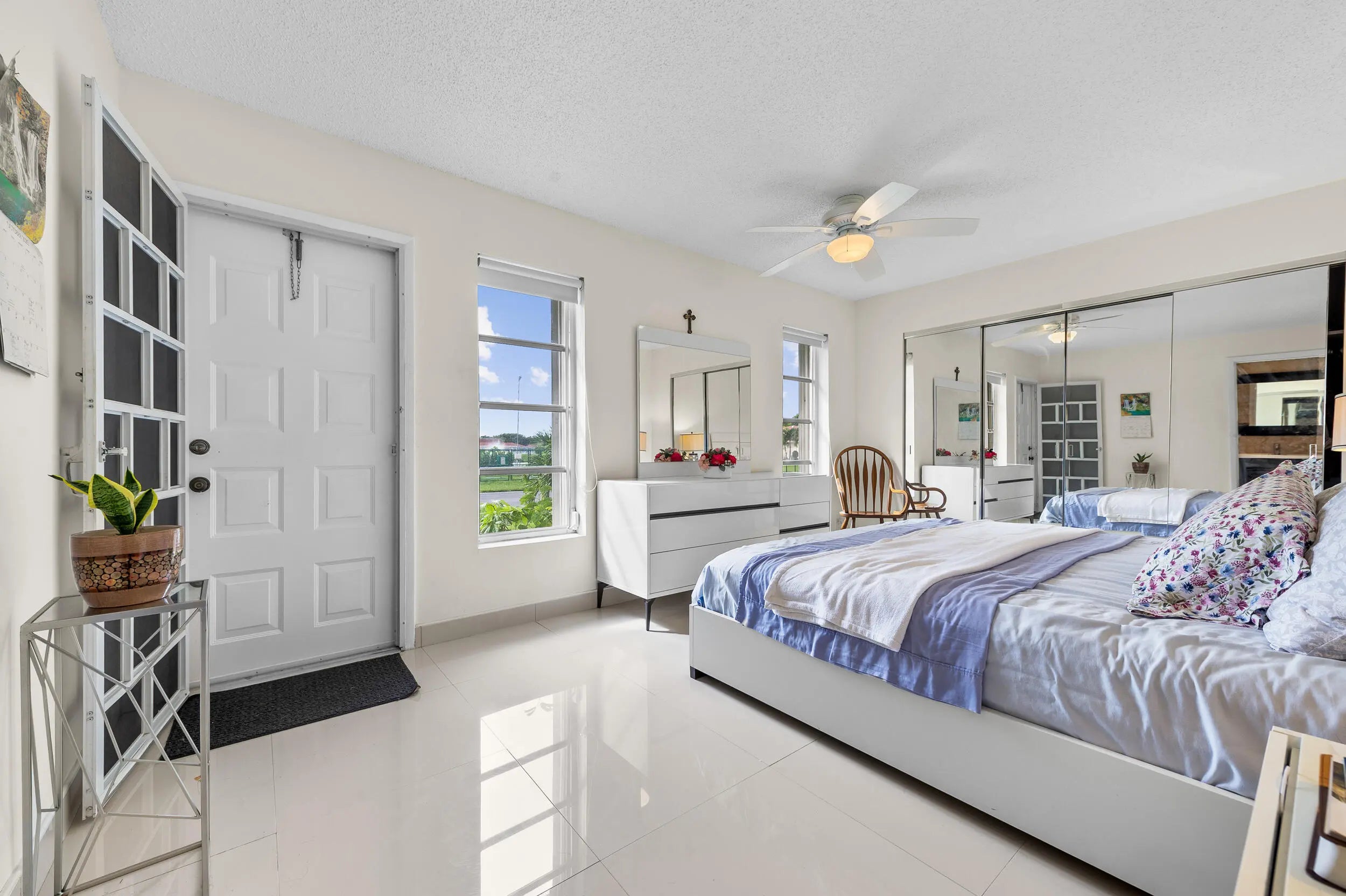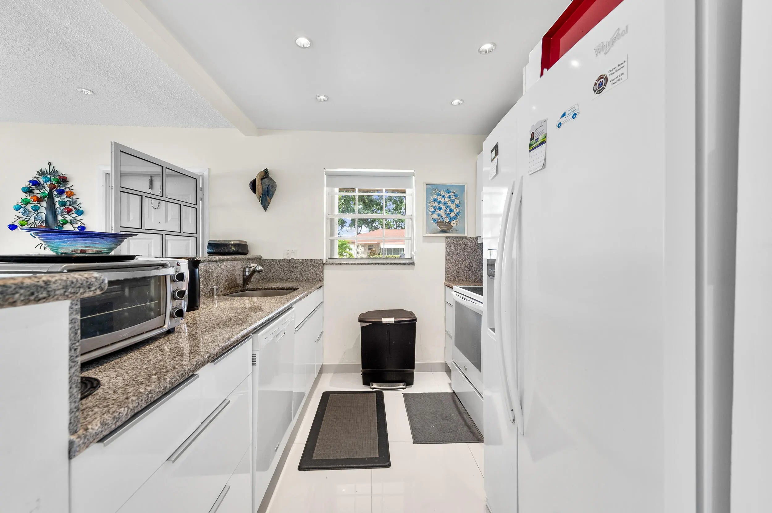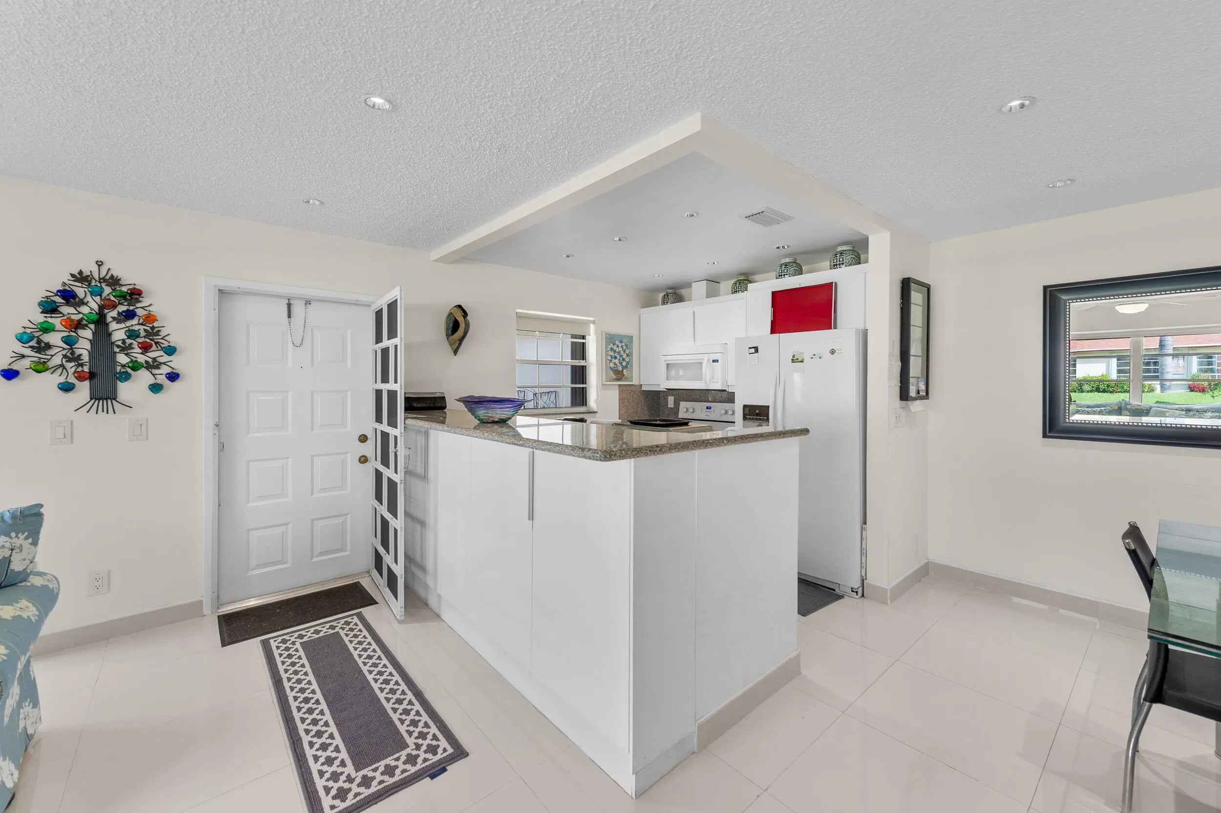 This beautifully renovated 2BR/2BA corner villa is filled with natural light and offers modern updates throughout, including sleek 30x30 tile flooring, an open-concept kitchen with granite counters, backsplash, newer cabinets, pull-out drawers, and stainless appliances, plus a spacious Florida room under air with leveled flooring. Both bathrooms have been completely updated with walk-in showers and new vanities, while the bedrooms feature mirrored closet doors and custom California closet systems. Additional upgrades include high-hat lighting and a 2021 AC unit for peace of mind. Offered fully furnished/turnkey, this bright and stylish home is ready to enjoy in a vibrant 55+ community with a newly renovated fitness center, resort-style heated pool, clubhouse,
