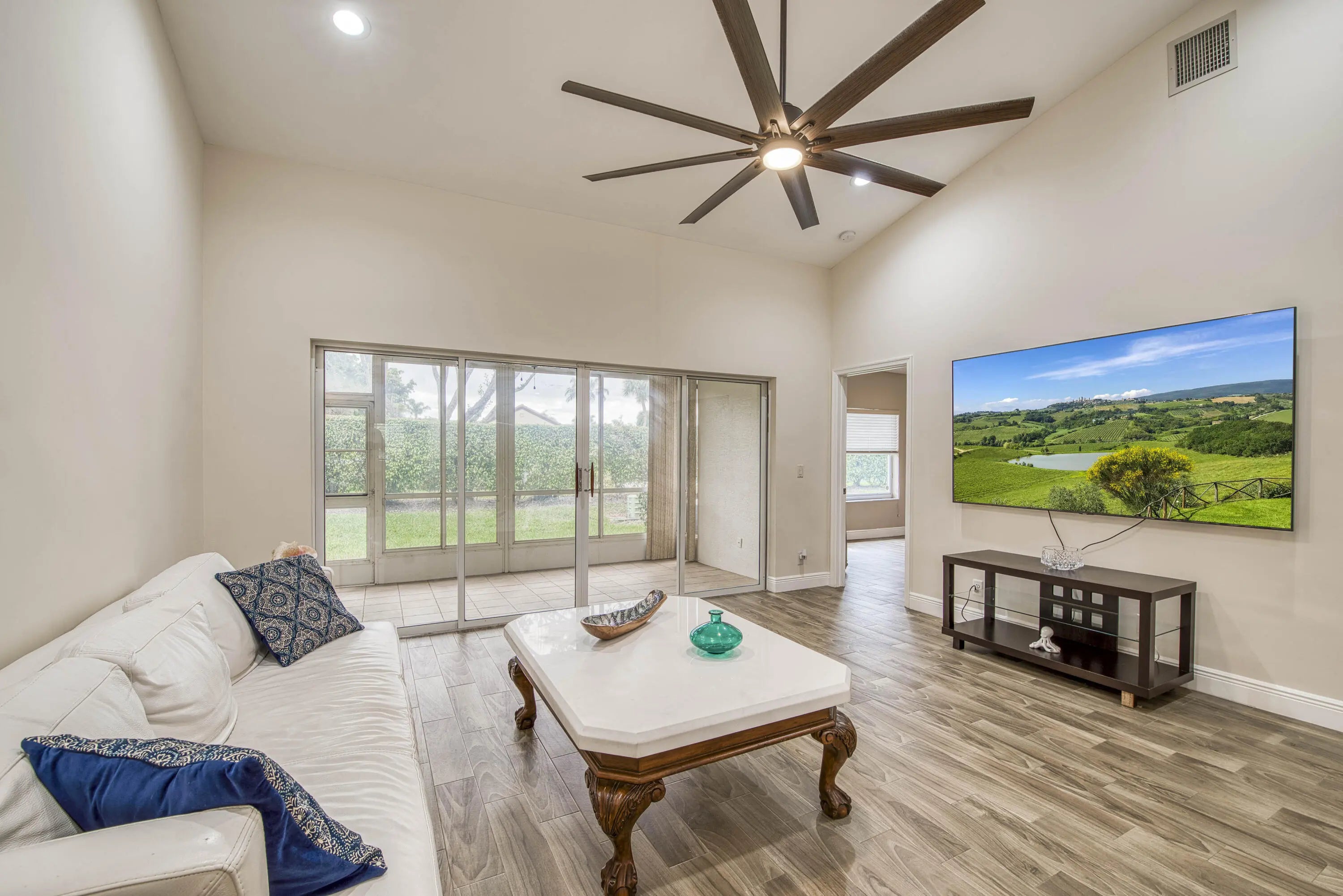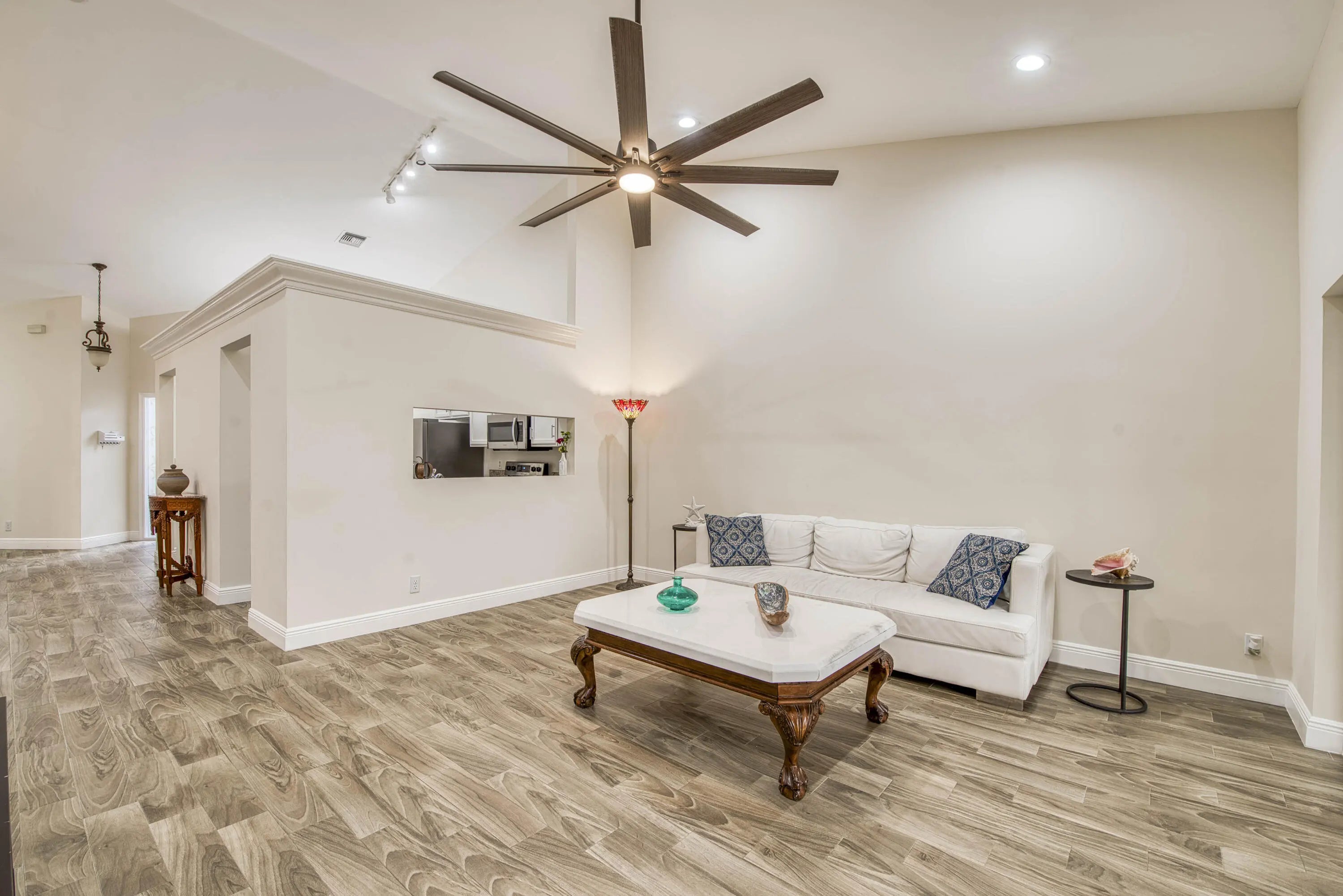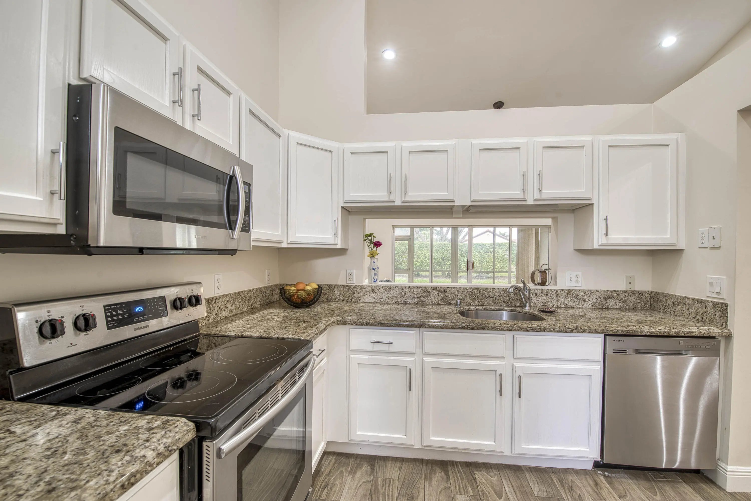 Welcome to this beautifully updated, move-in ready 2BR/2BA villa located in the serene and highly sought-after community of Isles of Aberdeen, the only gated enclave in Aberdeen East with no mandatory membership fees! Step inside to discover a bright and inviting interior featuring stylish wood-look tile flooring throughout the main living areas, modern ceiling fans, and an updated kitchen complete with granite countertops and stainless steel appliances. Plantation shutters on the front windows add a touch of elegance and privacy. Enjoy peace of mind with a newer A/C (2021) and roof (2017). The soaring vaulted ceilings enhance the spacious feel, and the enclosed lanai, under air, offers the perfect spot for relaxing or entertaining year-round. Select furniture and an impressive 85''