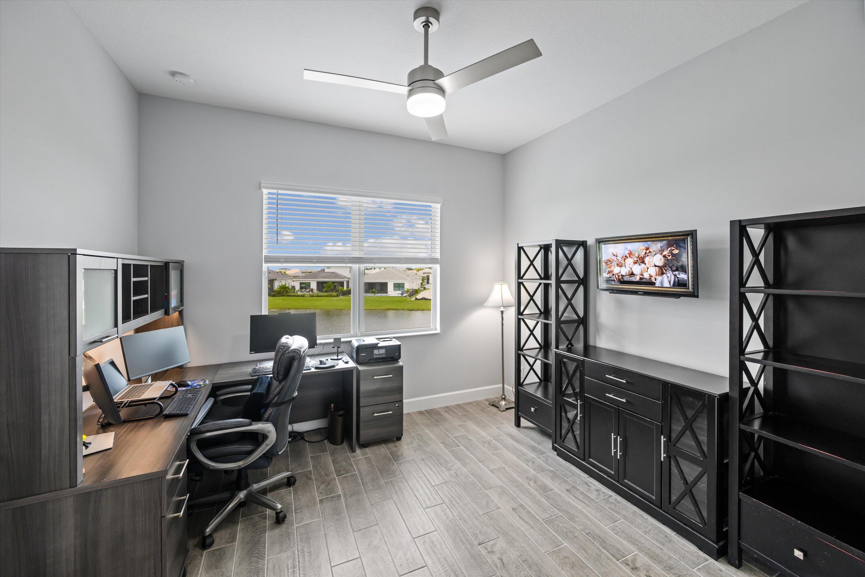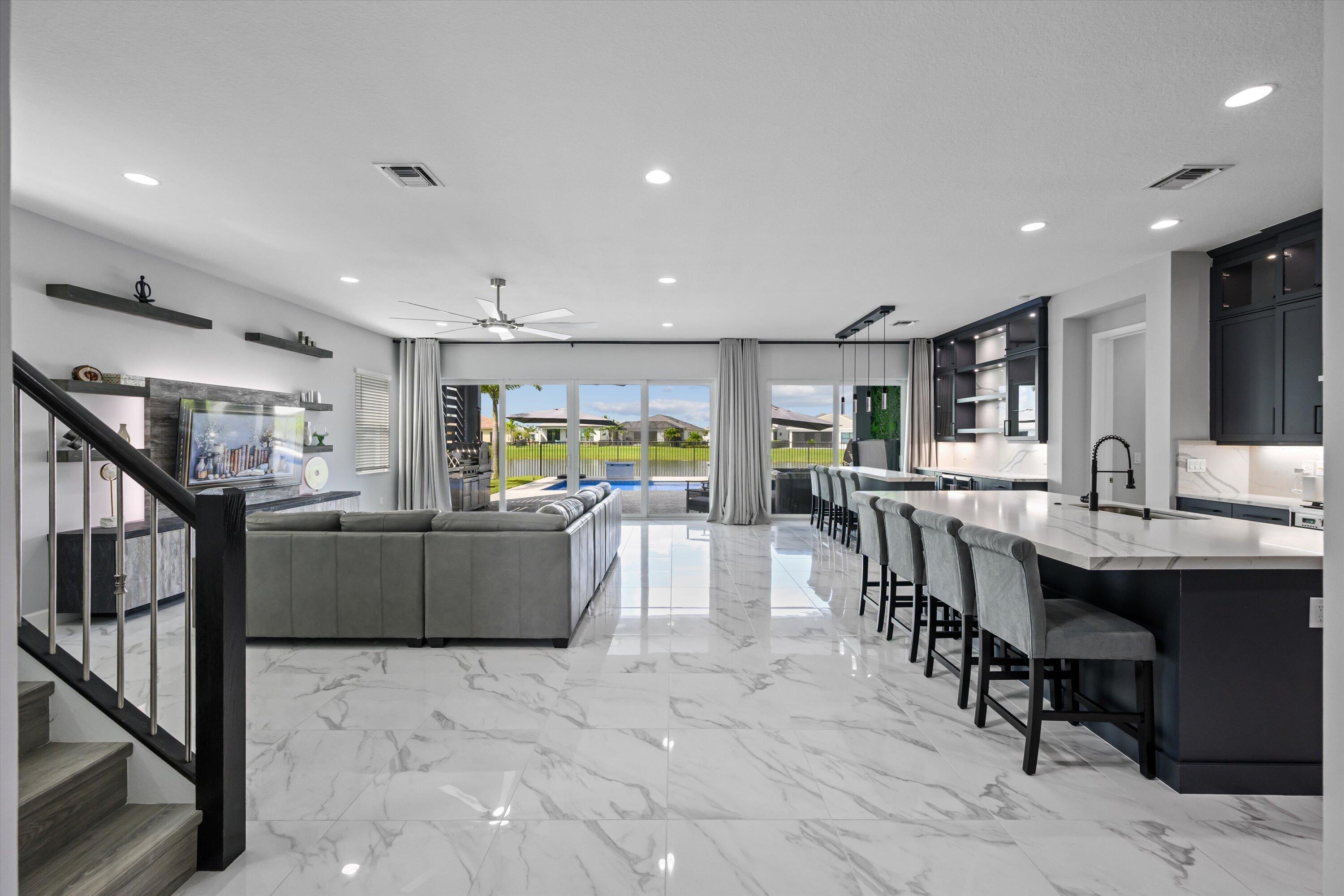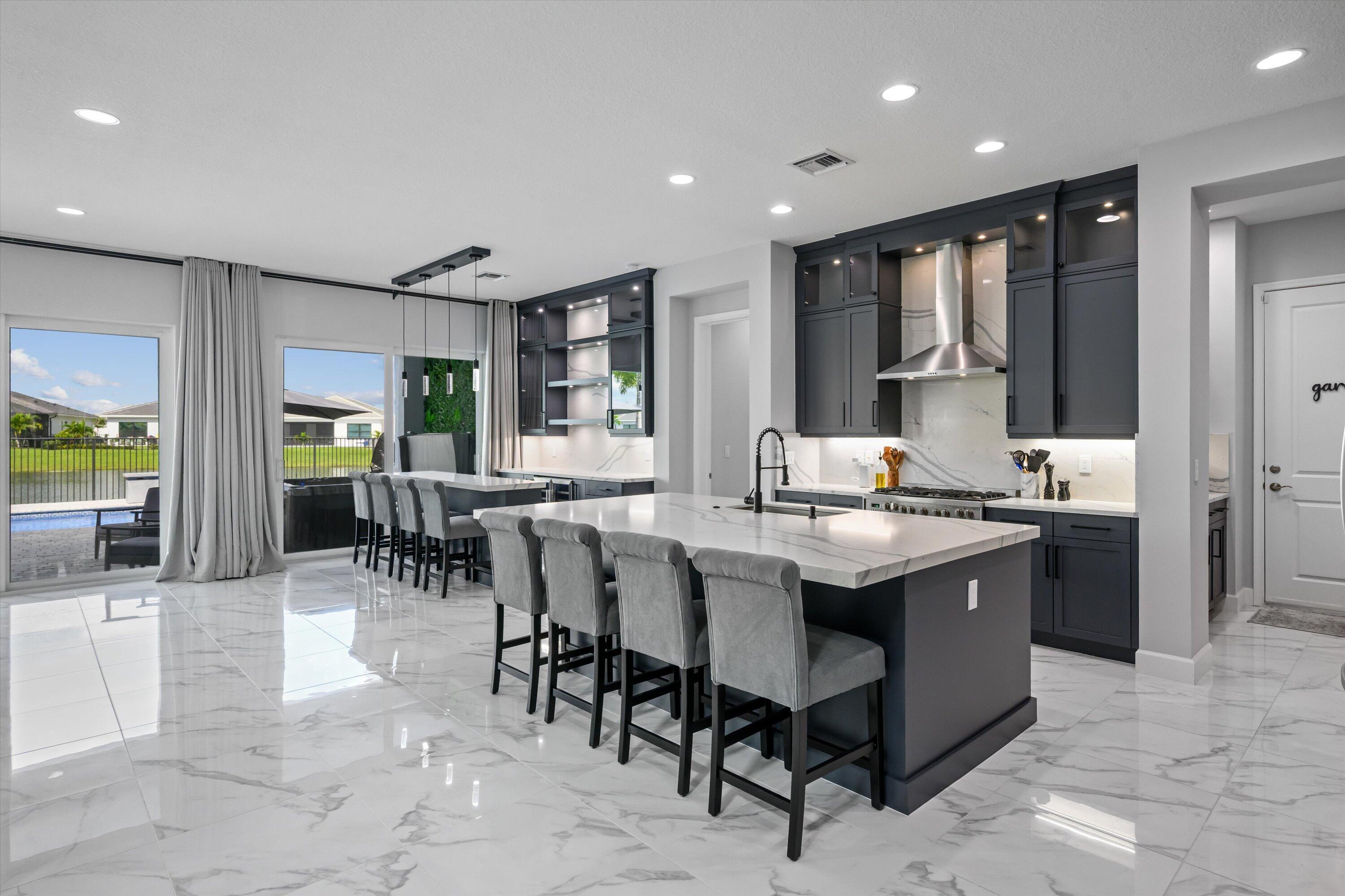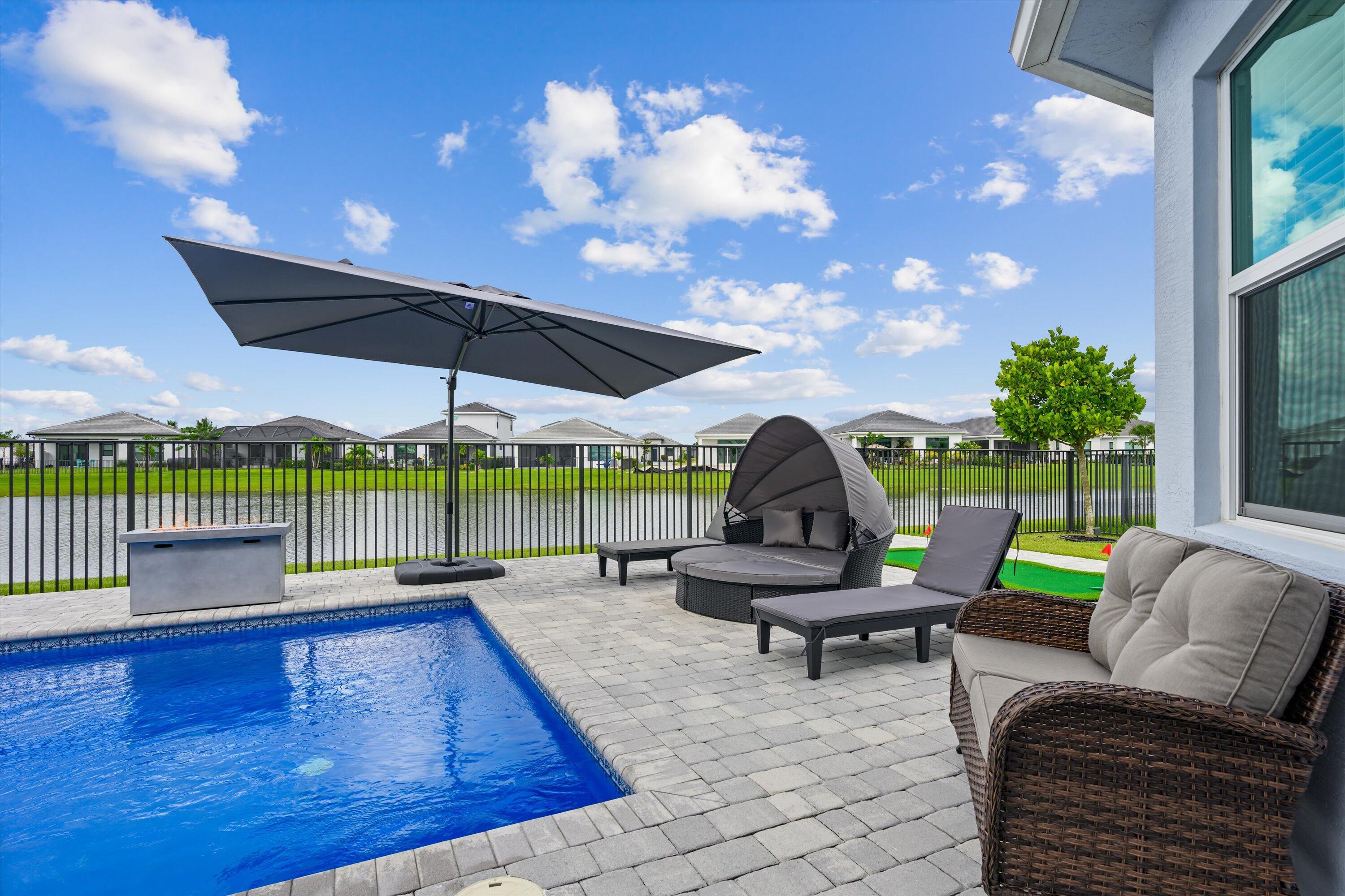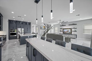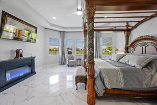 MAJOR PRICE REDUCTION! Experience luxury living in this rare, fully furnished Tanager model located in the highly sought-after Orchards of Westlake. This expansive 6-bedroom, 4.5-bath, 4-car garage waterfront residence offers over 5,300 total sq. ft. and shows like a designer model--move-in ready and complete with curated furnishings, artwork, and decor.The gourmet kitchen impresses with a massive island, quartz backsplash, stacked cabinetry, under-cabinet lighting, and premium stainless-steel appliances, including a gas range with hood and three ovens. Spacious living areas include a formal dining room with raindrop chandelier, two dedicated offices, a custom bar with double wine fridge, a coffee station, an upstairs loft, game room, and fitness room.The luxurious primary suite features a marble 4-poster canopy bed, custom closets, a sitting area with water views, an electric fireplace, and a spa-inspired bathroom with soaking tub and dual vanities. Enjoy Florida living at its finest in the private backyard oasis featuring a resort-style saltwater pool, covered spa with faux living wall, summer kitchen with grill, pizza oven, and refrigerator, putting green, and two gas fire pits perfect for entertaining. Additional features include whole-house impact windows and sliders, water filtration system, porcelain and plank tile flooring throughout, custom stair railing with feature wall, epoxy garage flooring, and elegant window treatments. Residents of Westlake enjoy access to the renowned Adventure Park with lagoon-style pool, splash pad, lap pool, ice cream shop, basketball courts, dog park, concert pavilion, and playgrounds. This exceptional home offers the ultimate combination of luxury, comfort, and resort-style living.
