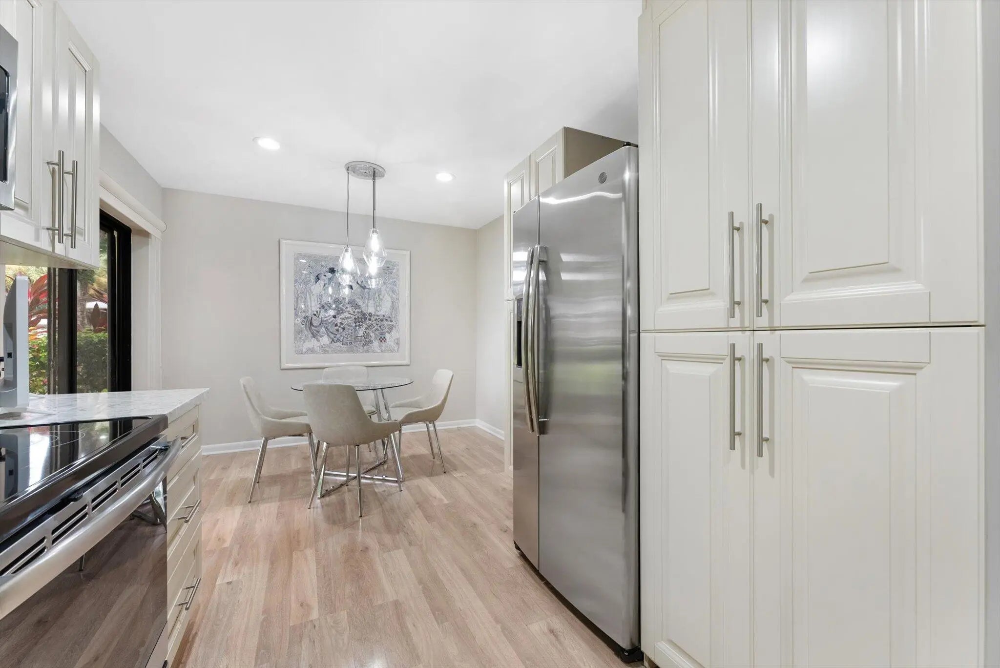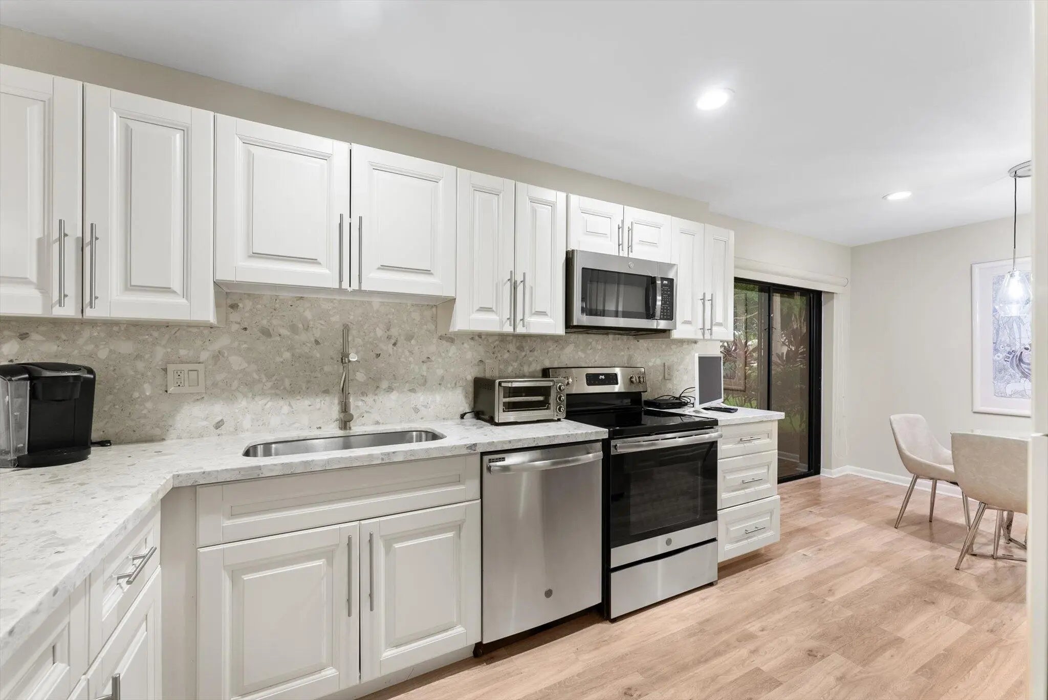 Welcome home to this spacious 2-bedroom, 2-bath ground-floor condo offering 1,562 sq ft of well-maintained living space in the prestigious, gated community of Hunters Run in Boynton Beach, FL. This vibrant community features a mandatory golf membership, granting access to premier golf courses and world-class amenities. The open-concept fully remodeled kitchen with dedicated dining area is perfect for entertaining, and recent upgrades include a brand new A/C unit and an LG WashTower Stacked Laundry Center. As a ground-floor unit, this home includes an approved outdoor slab for personal golf cart parking--an ideal convenience for golfers and residents alike.