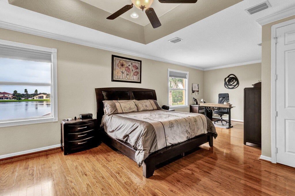 Welcome home to stunning lake views and custom upgrades. Every detail has been carefully curated from the inviting interior to the private outdoor oasis. Inside, you'll find a custom kitchen featuring granite, solid wood cabinetry, tile backsplash, and stainless steel appliances. The family room includes beautiful solid wood built-ins, while both the guest and primary baths showcase designer tile, solid wood vanities, and a stand-alone soaking tub. Step outside to enjoy incredible lake views from your pool situated on an estate-sized lot with 30+ feet between homes. This property offers exceptional space and privacy. Additional features include a whole house repipe, crown molding, chair rails, a custom pantry, hardwood stairs, and so much more. All boxes checked. See Virtual Tour.