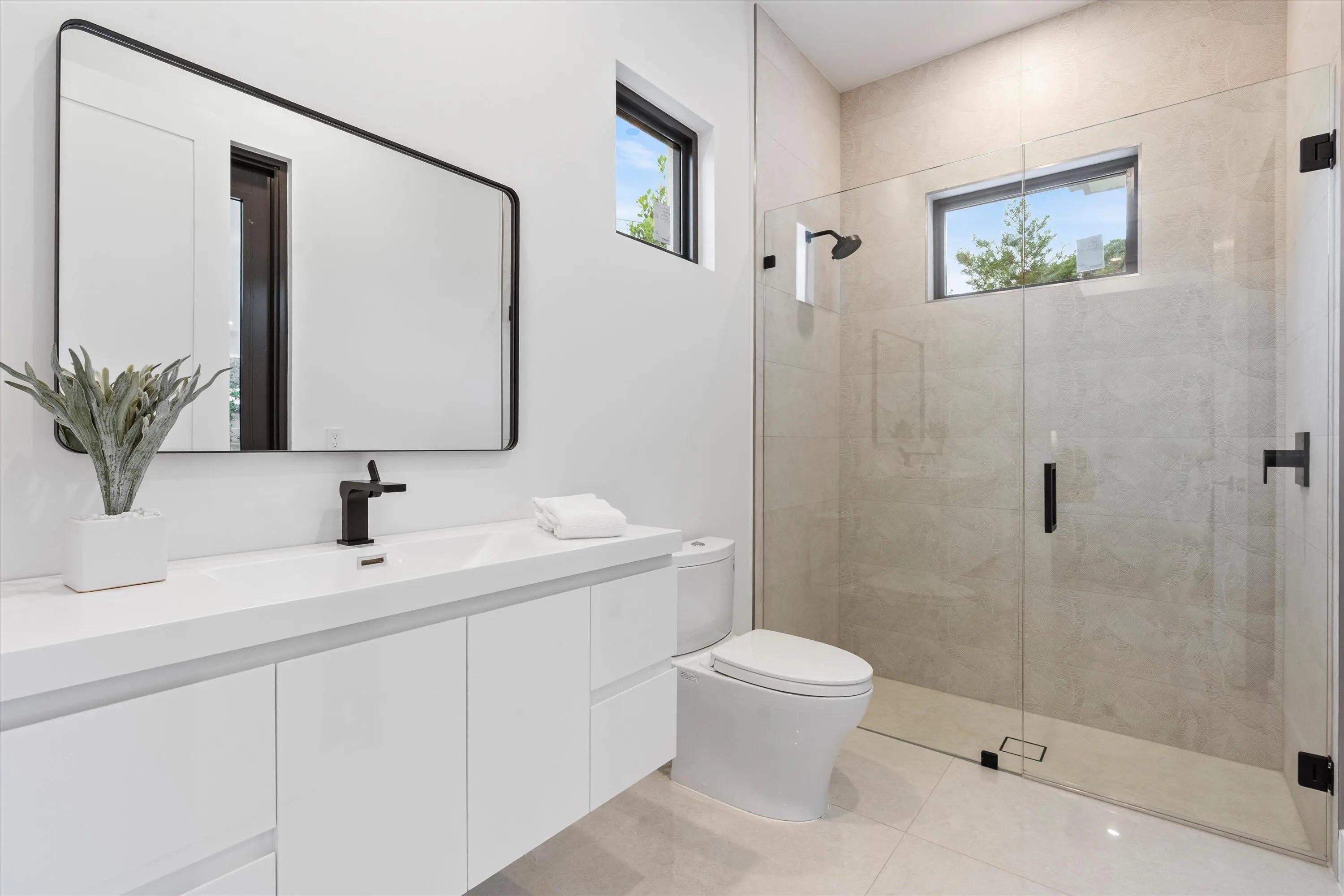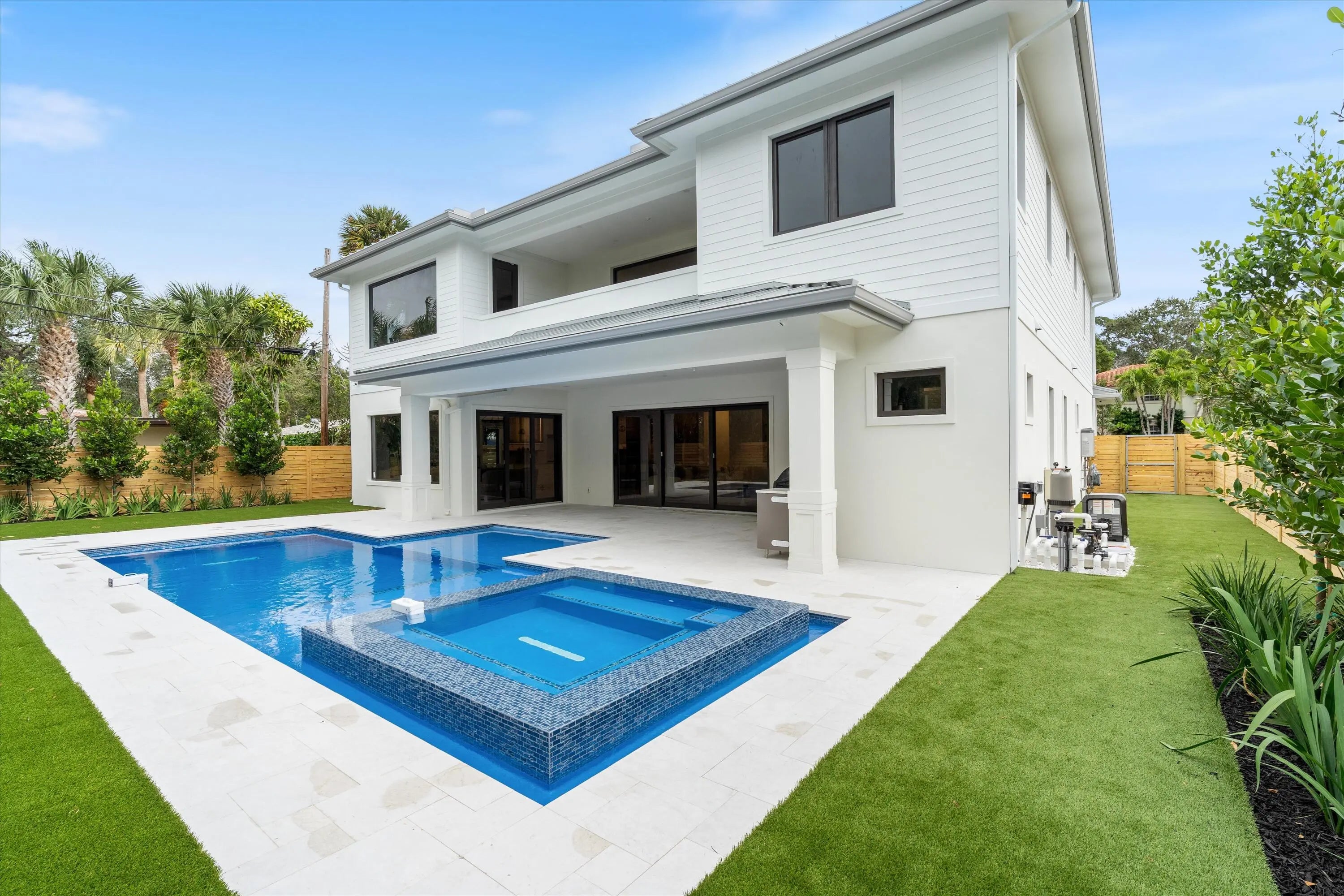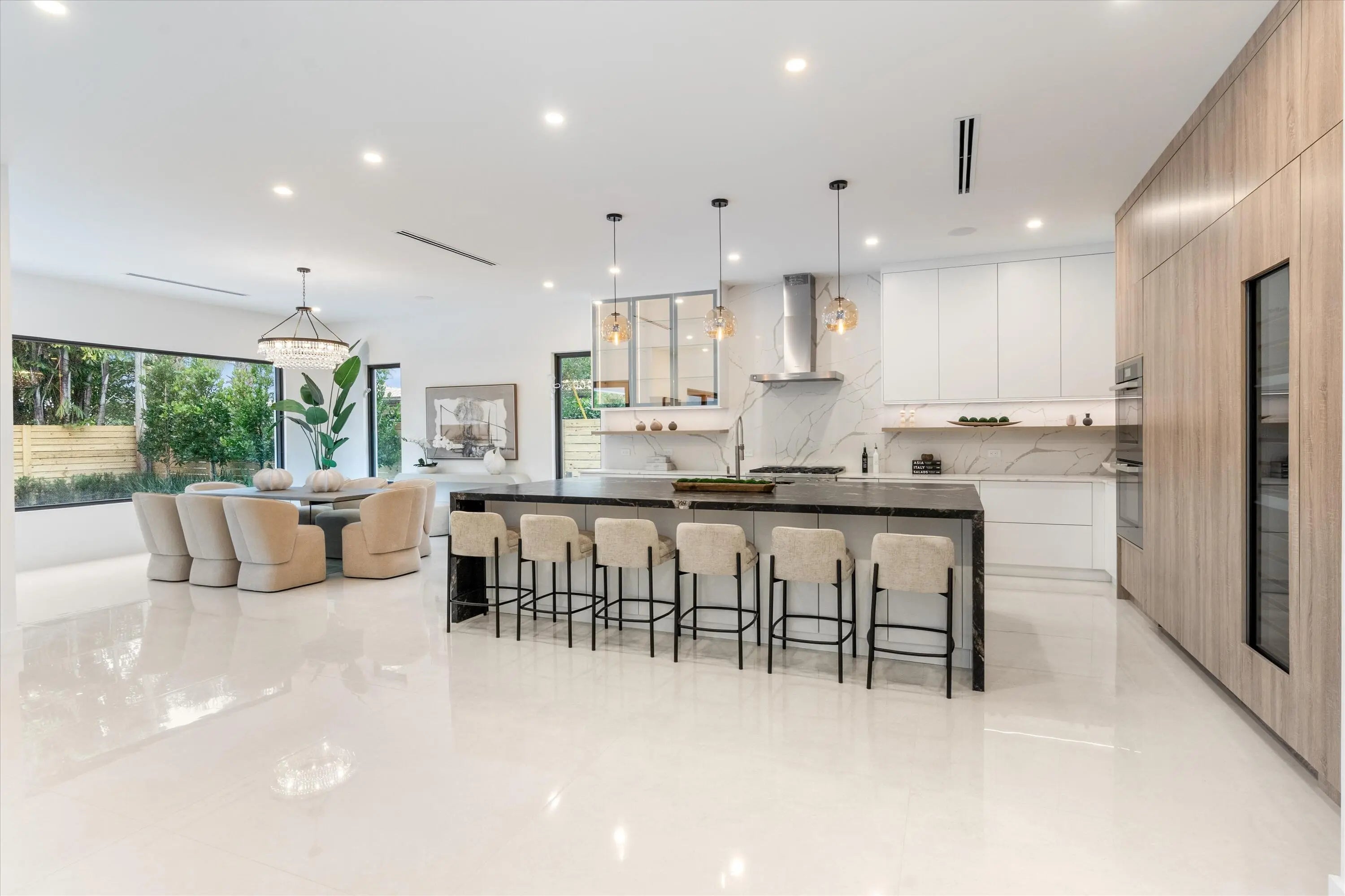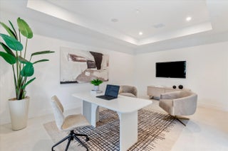 Stunning Modern Key West new construction showcasing a dramatic foyer with circular staircase that welcomes you to the expansive living room with 23' ceilings and an entire wall of glass overlooking the resort-style pool and deck. The open-concept chef's kitchen is a showstopper, featuring Miele appliances, 19' of quartz countertops, an 11' custom island, double wall ovens, and walk-in pantry. The first floor offers a private office/den, powder room, elevator and guest suite with cabana bath. Upstairs, a loft overlooks the living area below, leading to two ensuite bedrooms with walk-in closets. The luxurious primary suite includes a versatile bonus room, built-in coffee station, dual outfitted closets, private balcony, and spa-style bath with freestanding tub and 8' glass-enclosed