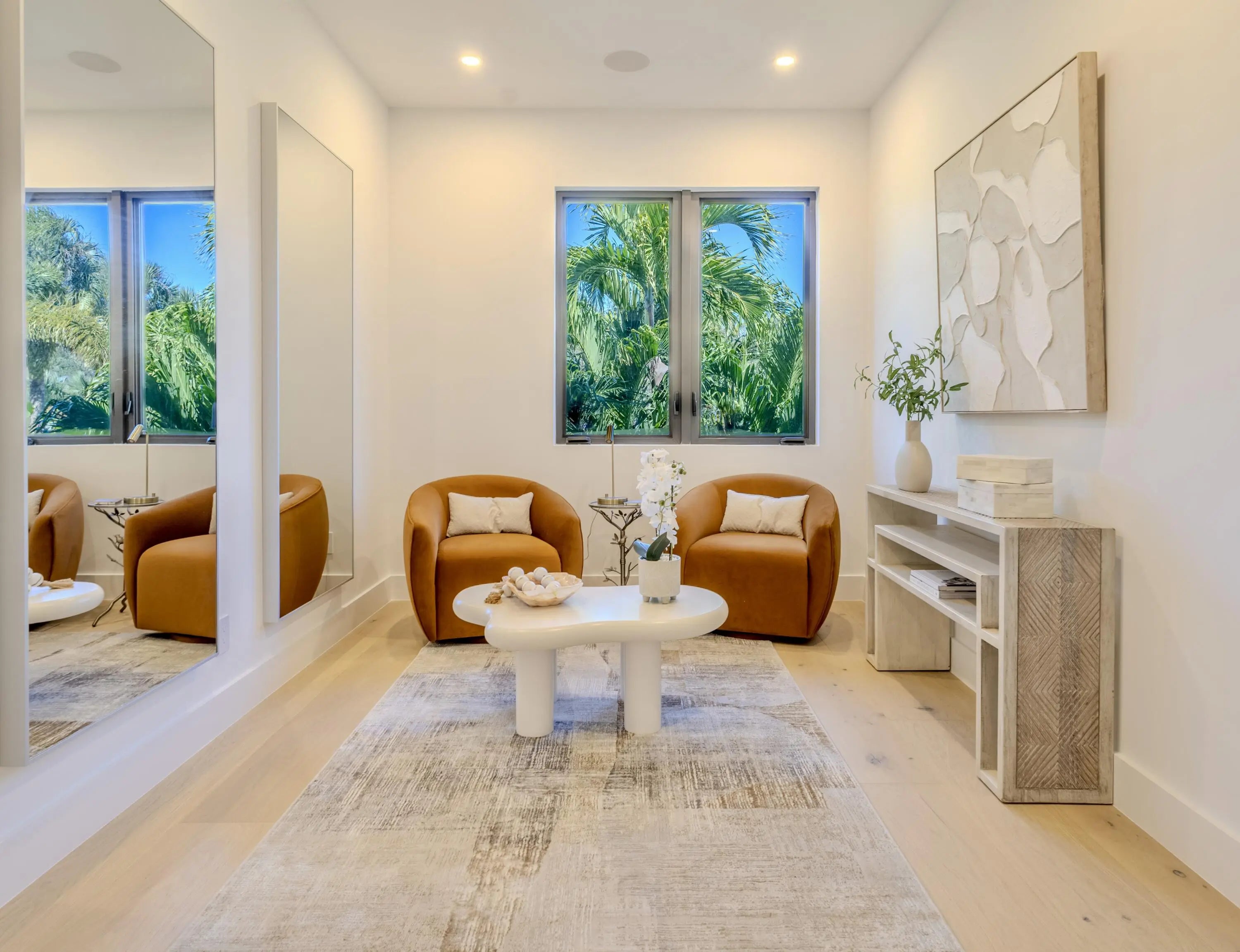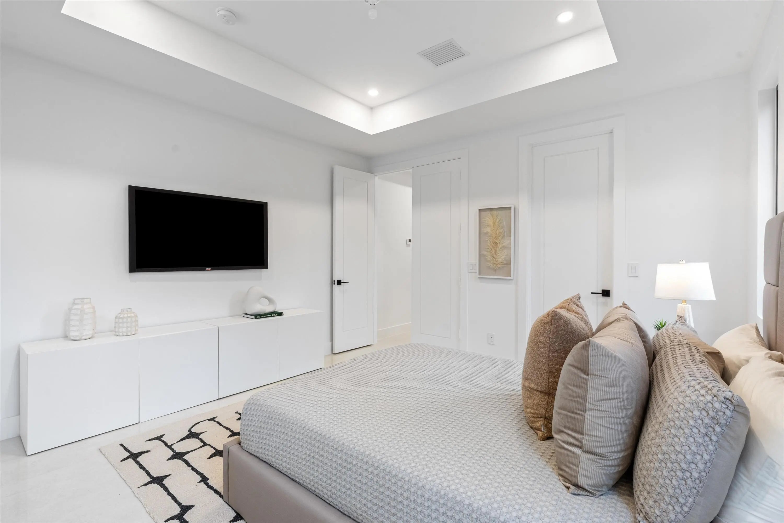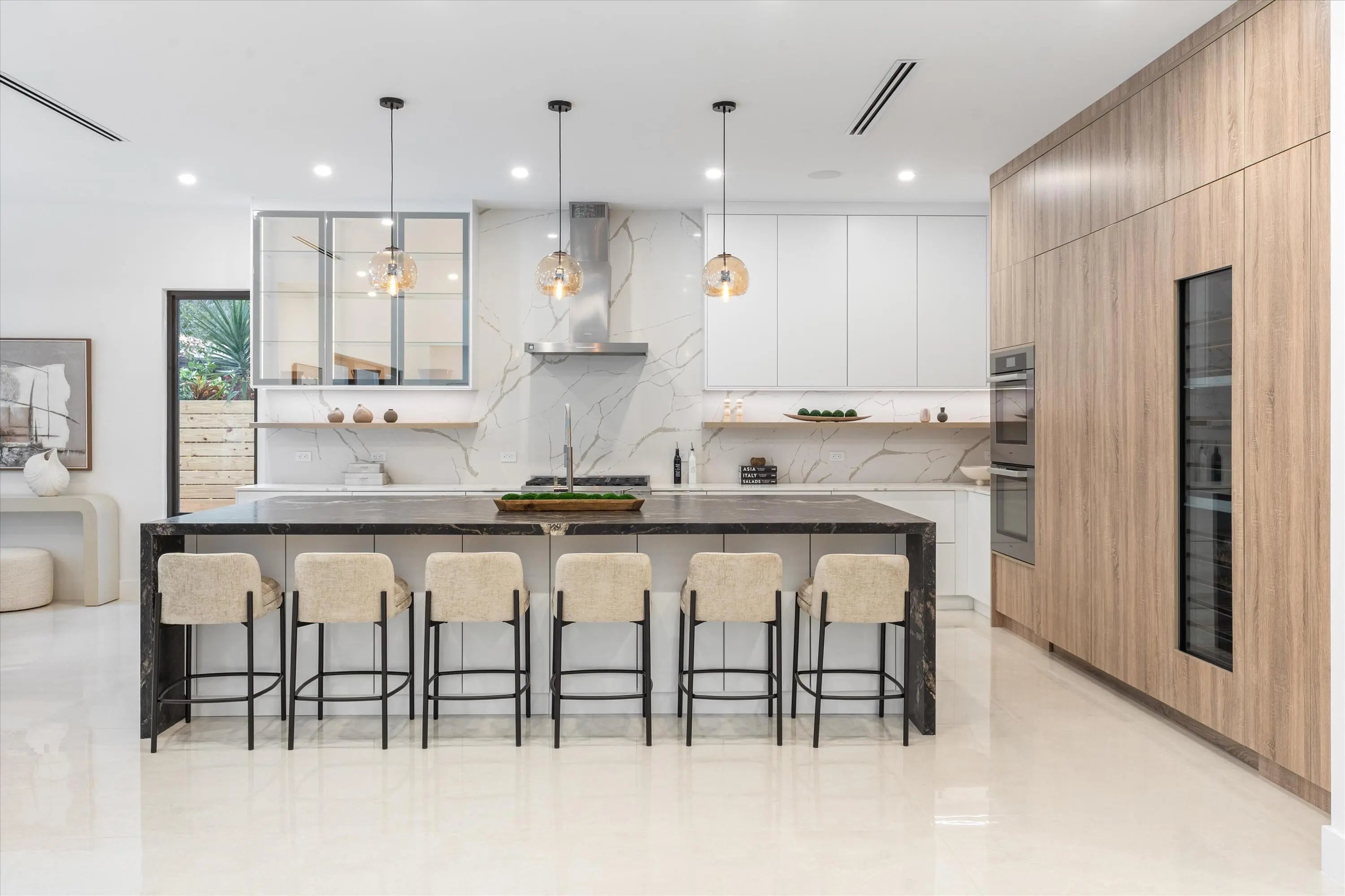 Stunning Modern Key West new construction showcasing a dramatic foyer with circular staircase that welcomes you to the expansive living room with 23' ceilings and an entire wall of glass overlooking the resort-style pool and deck. The open-concept chef's kitchen is a showstopper, featuring Miele appliances, 19' of quartz countertops, an 11' custom island, double wall ovens, and walk-in pantry. The first floor offers a private office/den, powder room, elevator and guest suite with cabana bath. Upstairs, a loft overlooks the living area below, leading to two ensuite bedrooms with walk-in closets. The luxurious primary suite includes a versatile bonus room, built-in coffee station, dual outfitted closets, private balcony, and spa-style bath with freestanding tub and 8' glass-enclosed